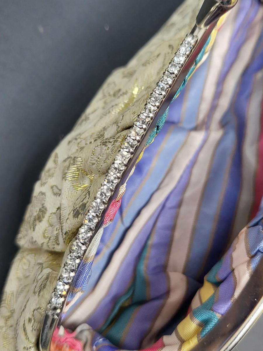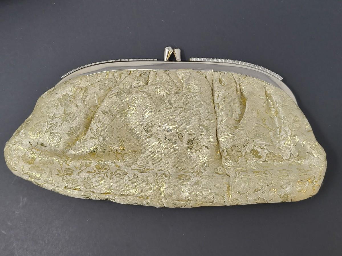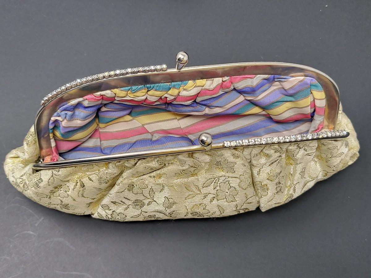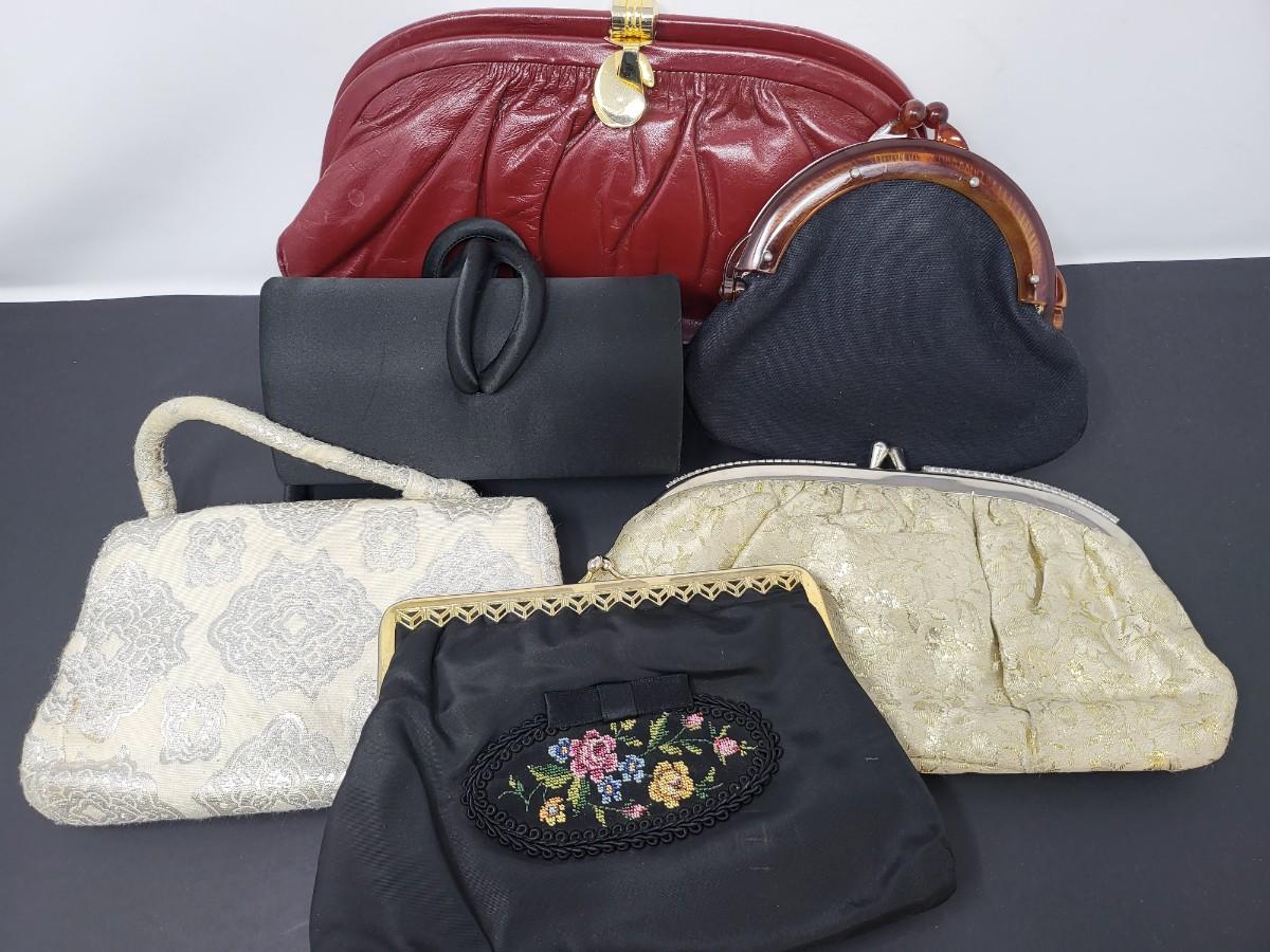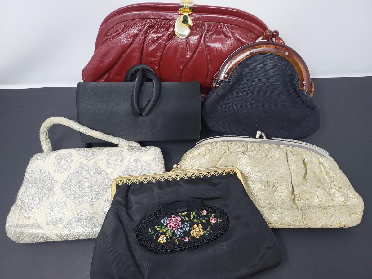 Six small evening/ocassional night out clutch purse/bags. Sizes range from 6" x 5.5" to 11" x 6". This lot includes leather, satin, embroidery, lucite, rhinestones and more.