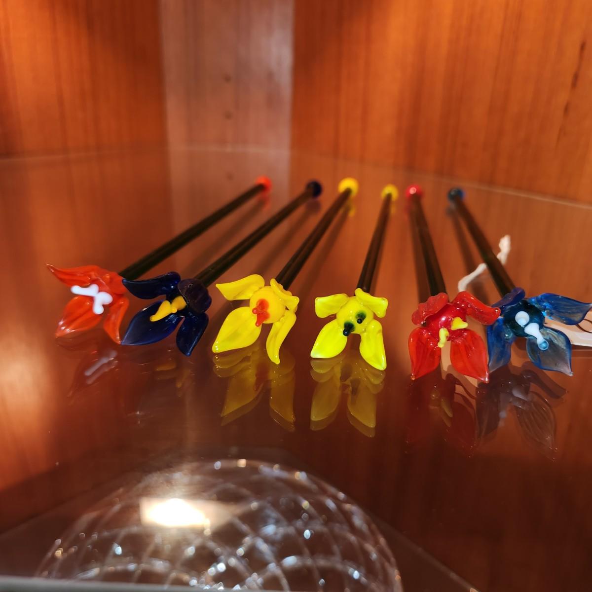6 Vintage Hand blown Colorful Flower Floral Glass Stirs Swizzle stick Murano Style Barware