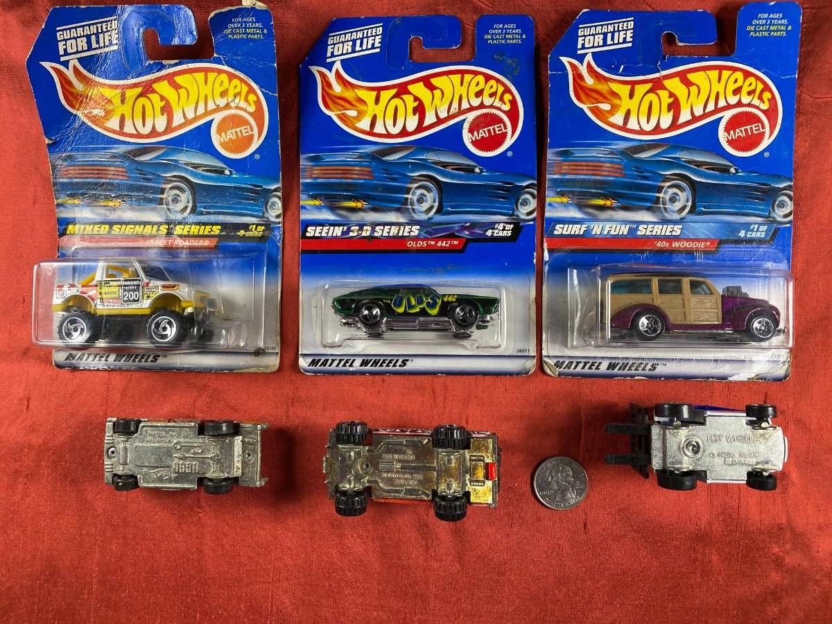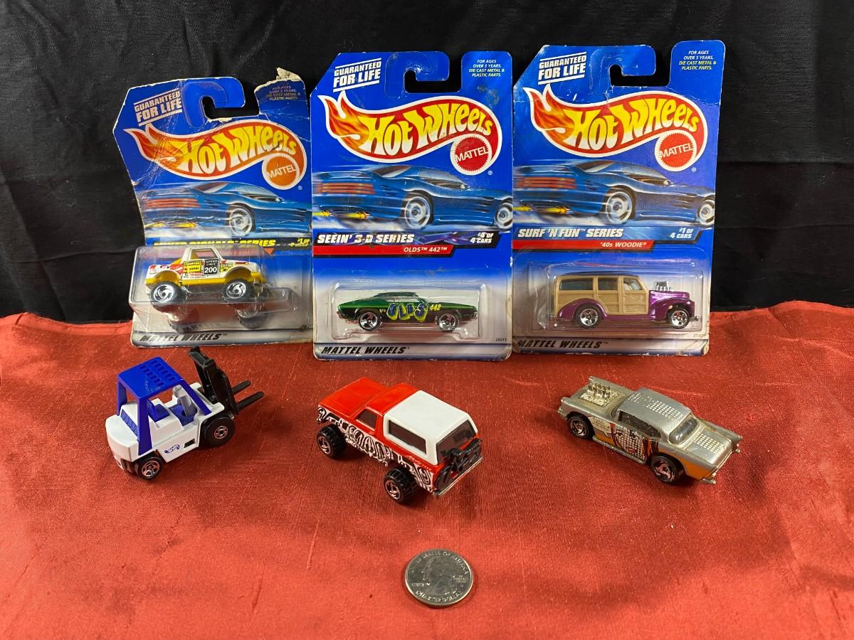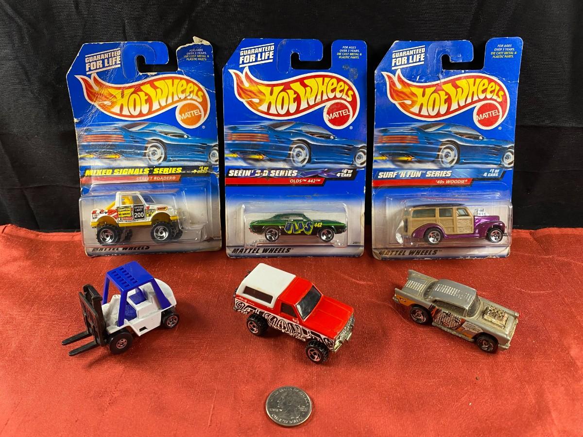 This auction lot is for 6 Vintage Hot Wheels. 3 are New and in their original packages. Some packages show wear and use.. "Street Roader" from Mixed Signals Series # 18799, "Old 442" from Seein' 3-D Series # 26011 and "40's Woodie" from Surf'n Fun Series #21309. The 3 which are not packaged a Blue & White Forklift 1979 #642, a Ford Bronco -Alaska Trek 1980 and a 57 Chevy "Oh Darling I Just Know You Can Win The Race" 1976. This one shows lots of play time. None are red lines