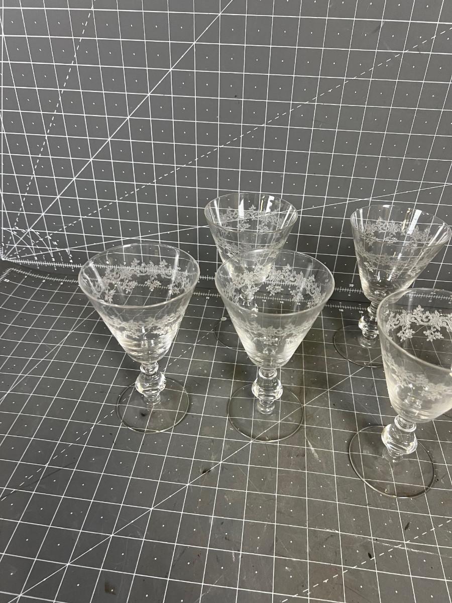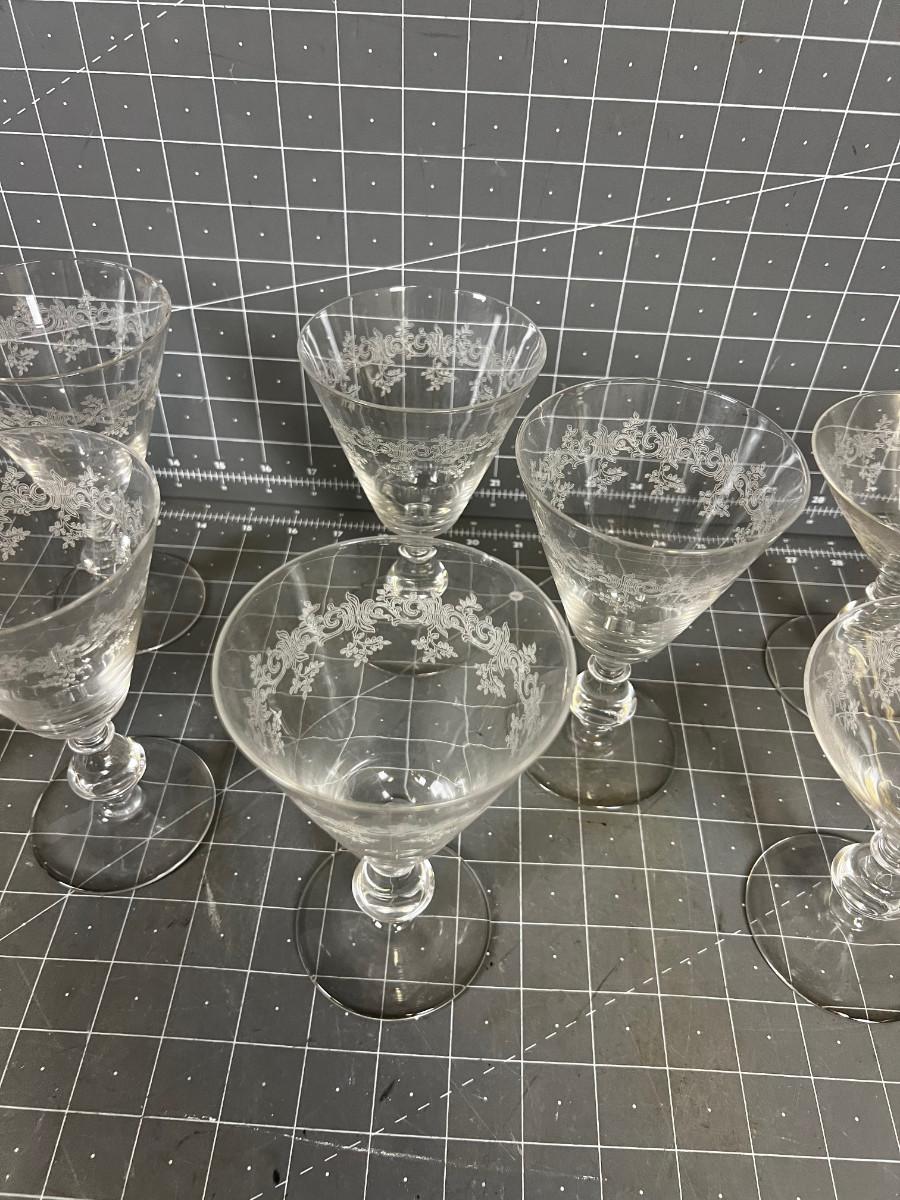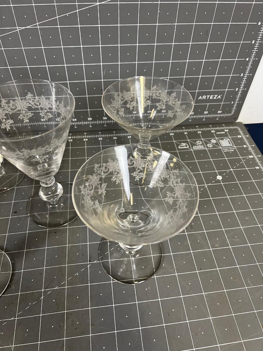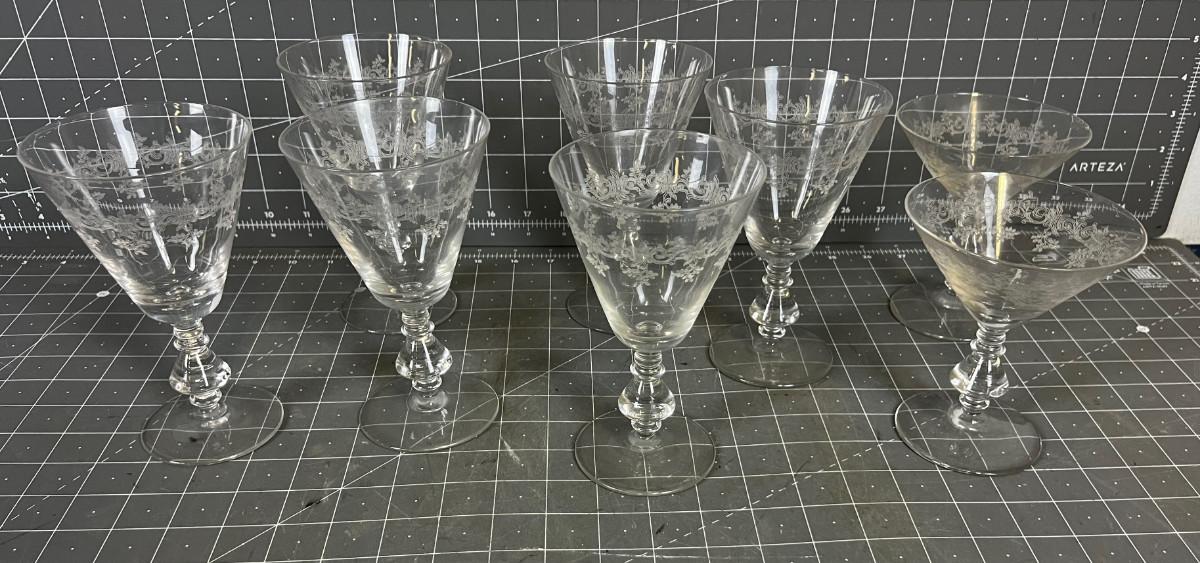 6 Water Goblets and 2 martini Glasses Etched NICE