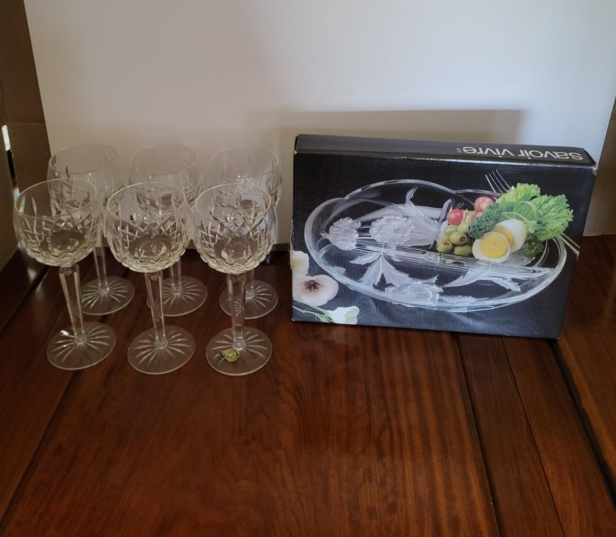 6 WATERFORD LISMORE BALLOON GLASSES AND SAVOIR VIVRE RELISH DISH