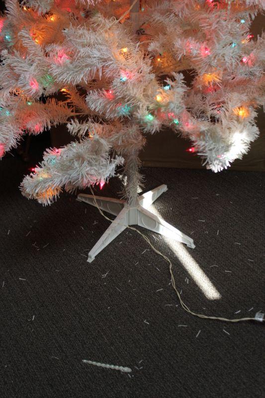 6' White Christmas Tree with multicolored lights. Comes apart in three sections. All strands work. Bottom of tree sits high off floor for plenty of gift space.