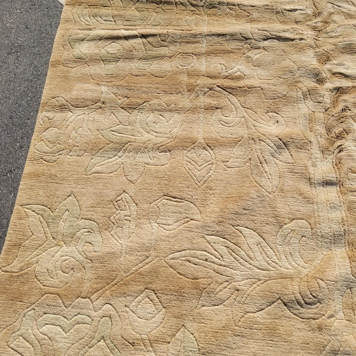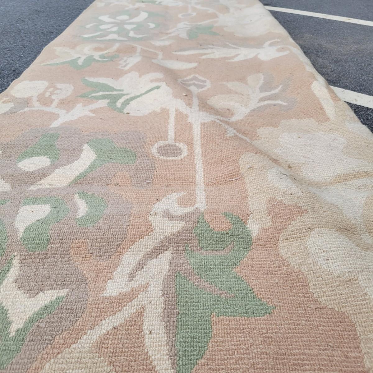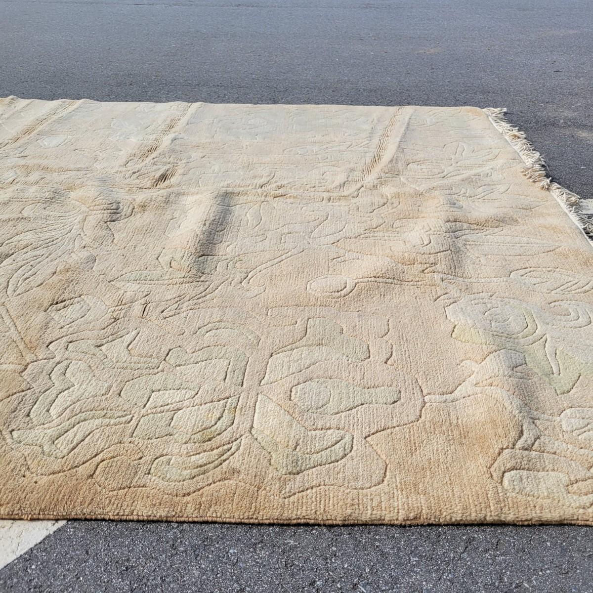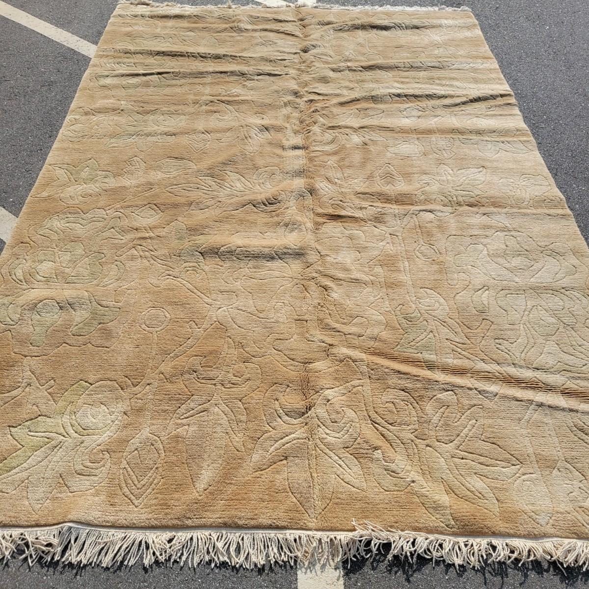 Large, muted area rug in fair condition, but has faded over time. This rug has geometric floral patterns with muted colors from fading. Rug does have an odor to it. Measures approximately 6' x 9' Local pickup only