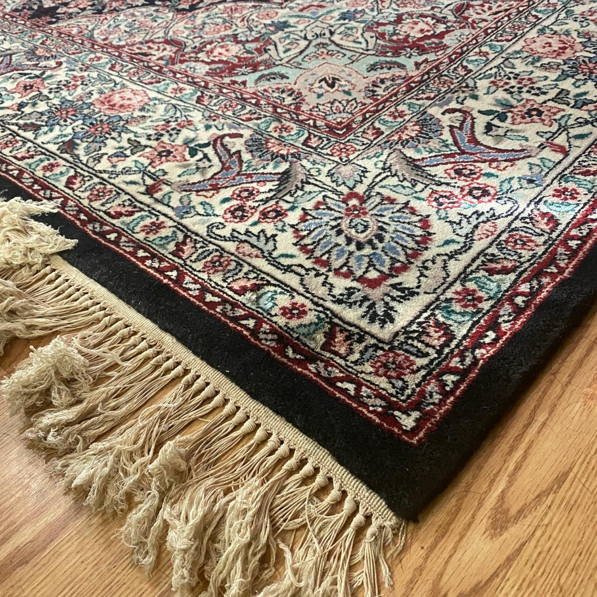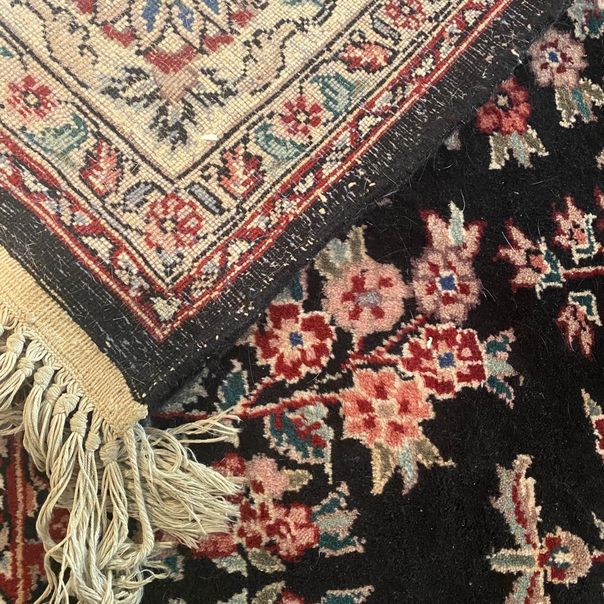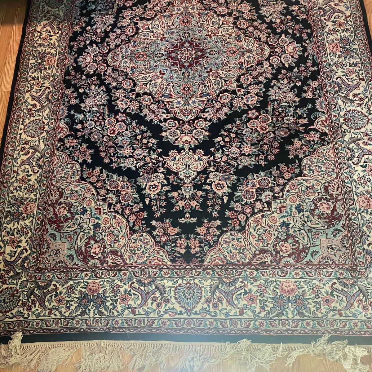 Nice area rug with mainly black coloring with pink and blue accents. In good condition. Measures 6’ x 9’. No tags. One cleaning and it will be good as new. Shipping available