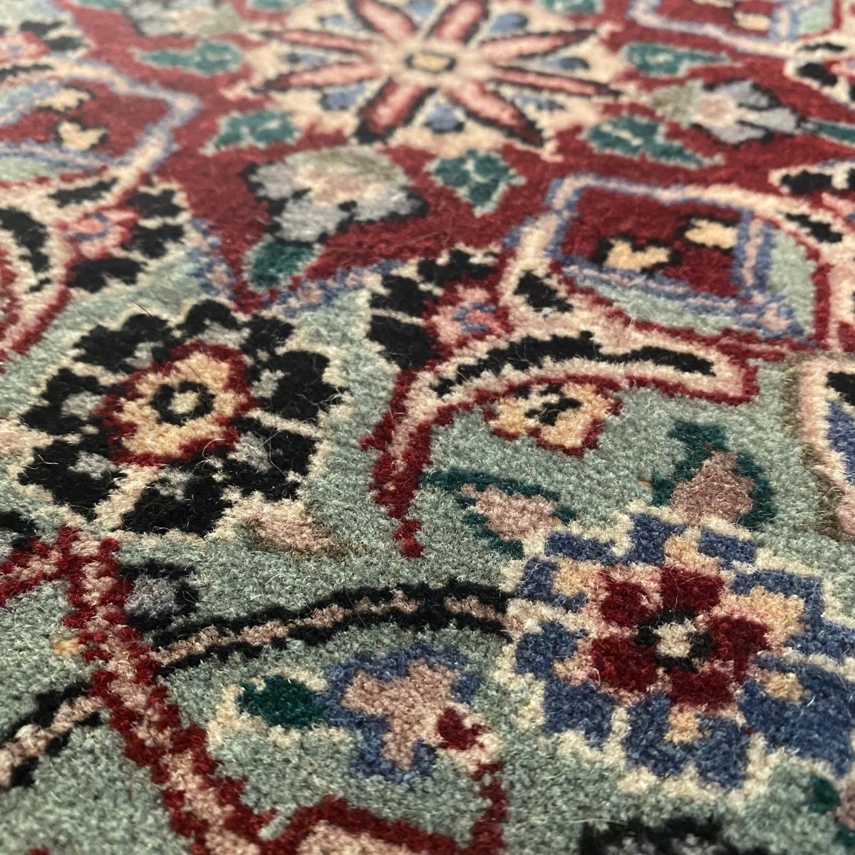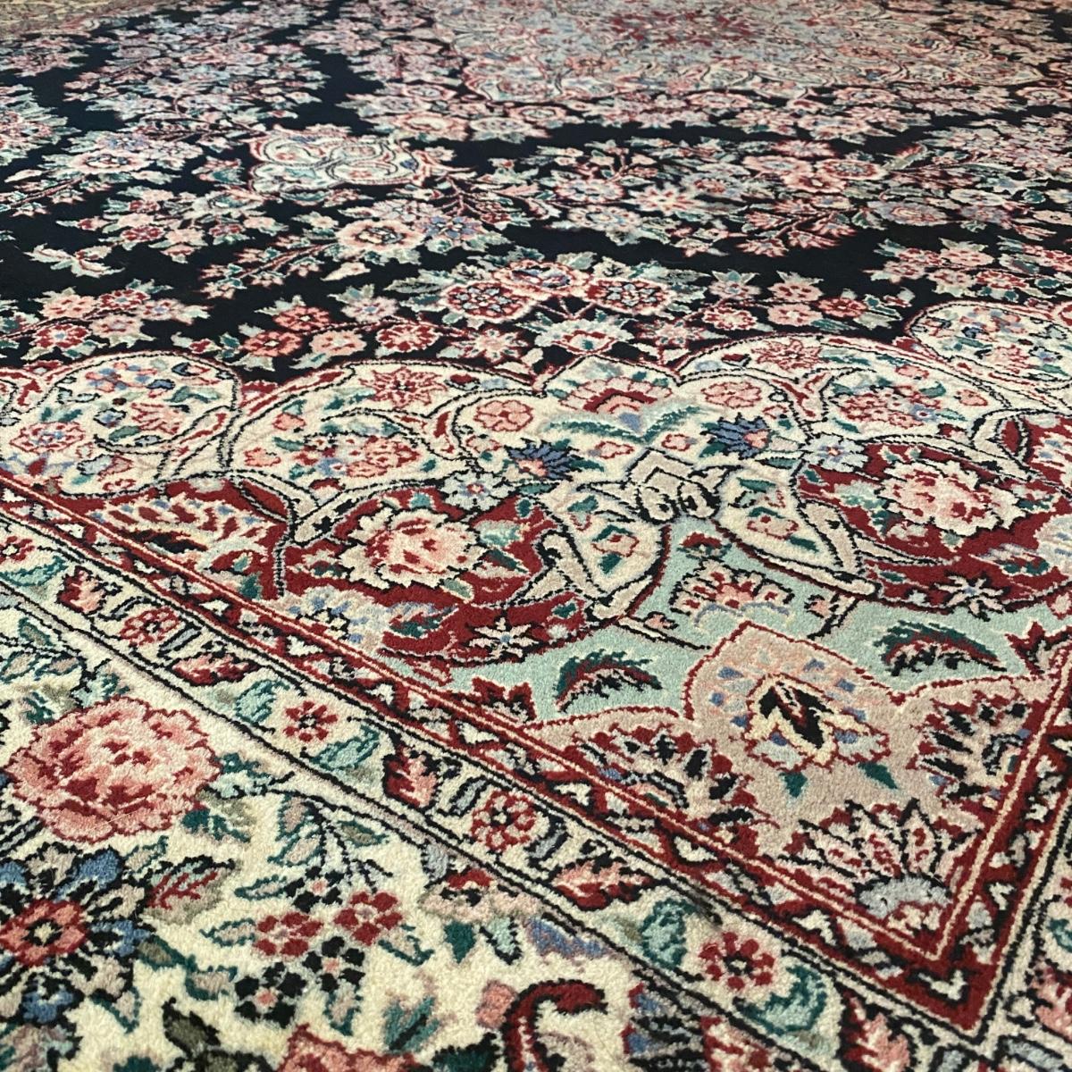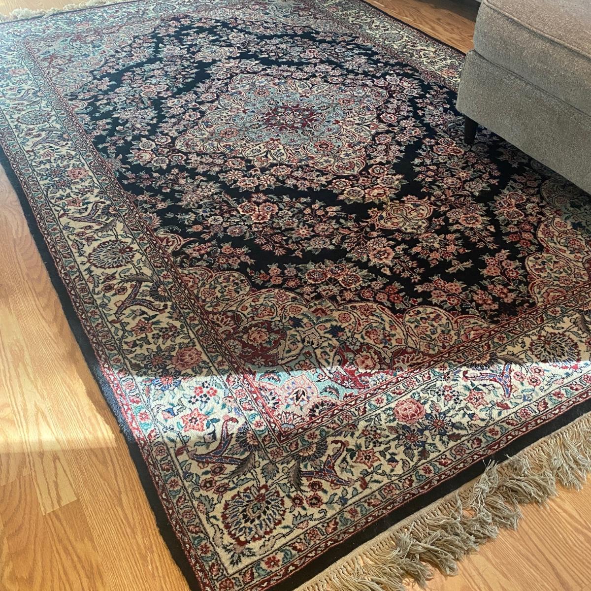 Nice area rug with mainly black coloring with pink and blue accents. In good condition. Measures 6’ x 9’. No tags. One cleaning and it will be good as new. Shipping available