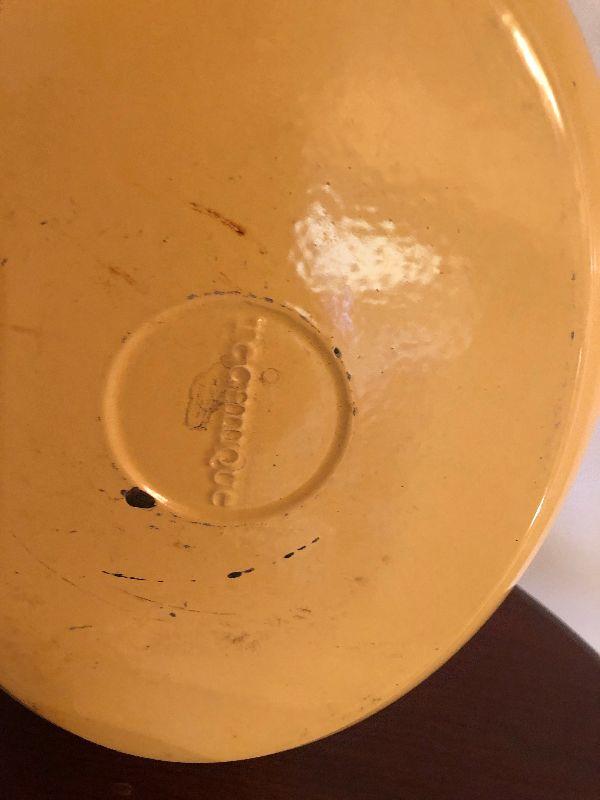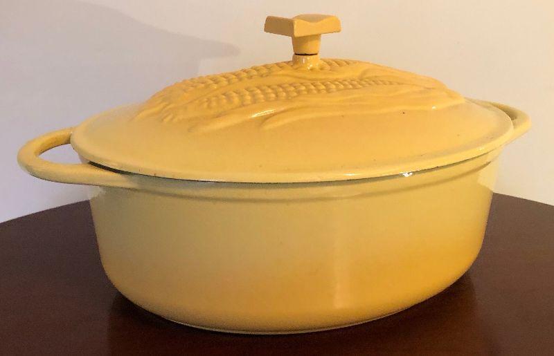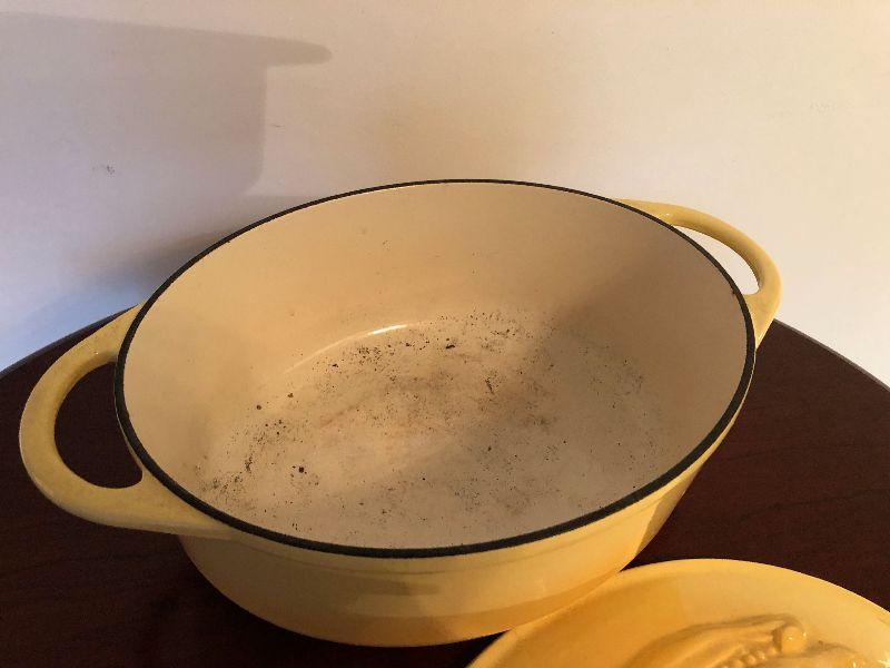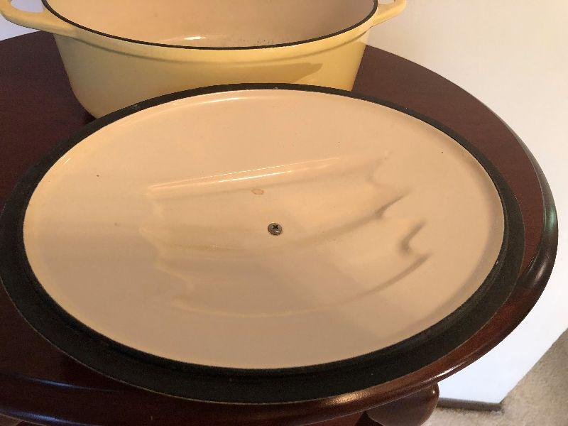 Cast iron, good condition - shows slight wear from use, chip on lid, 14" long