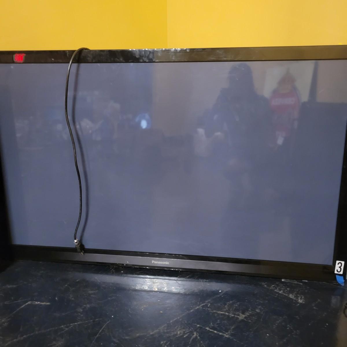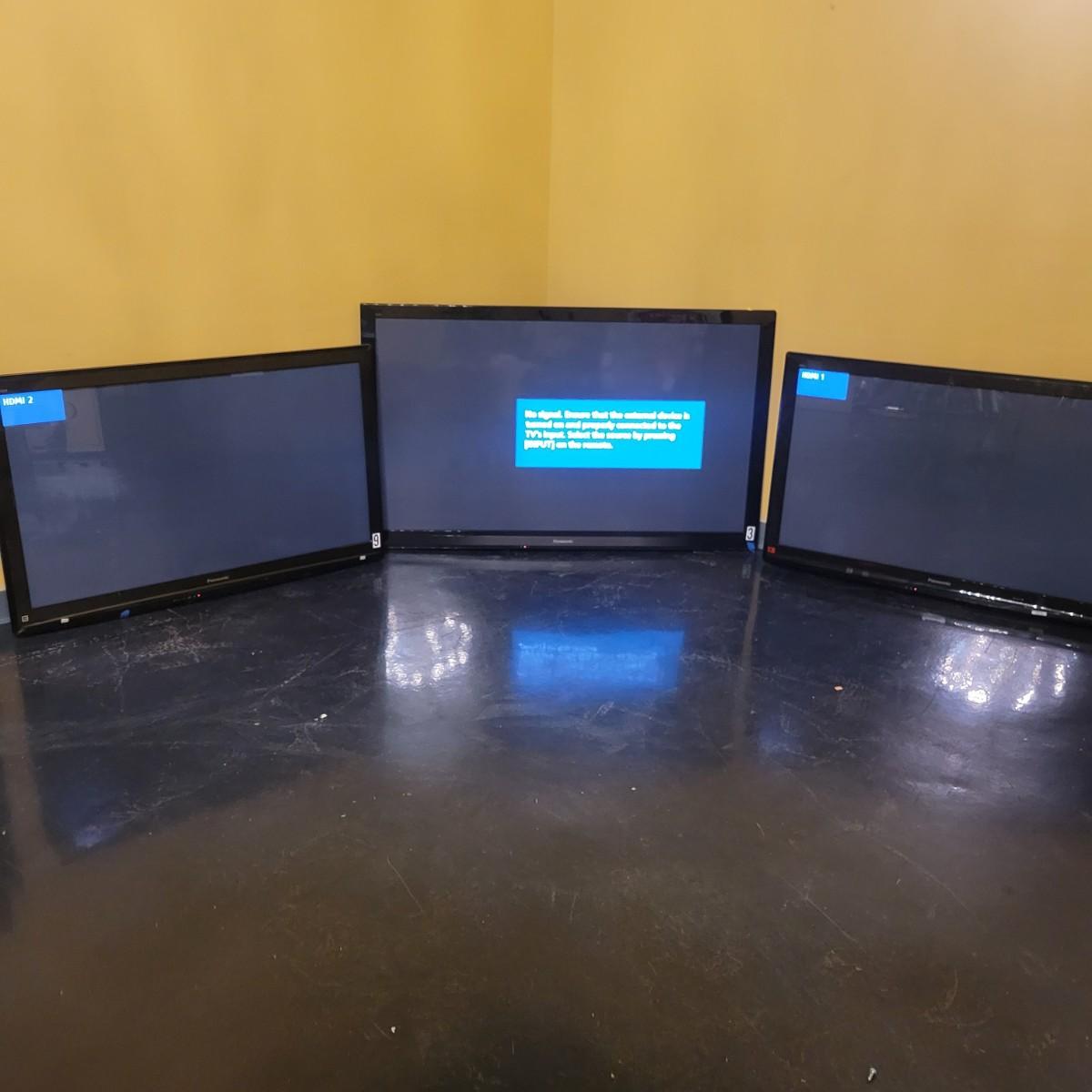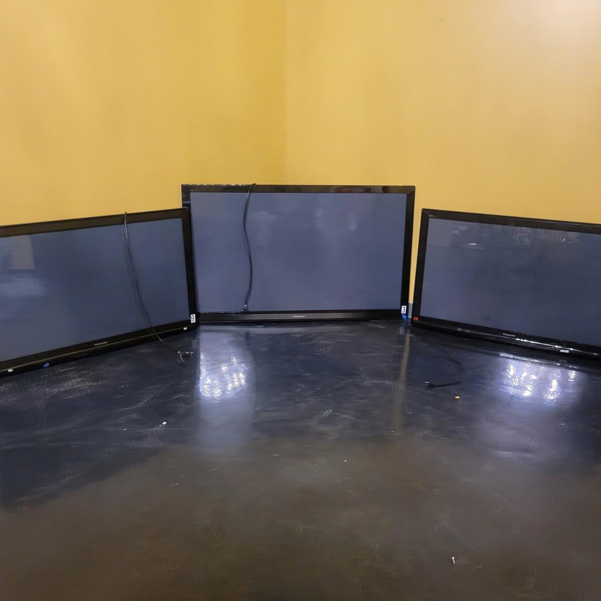 One 60" and 2 50" Panasonic HD TVs used, but in decent condition. All 3 units have been tested and powered on. Some minor scratches and damage to frames and the 60" has a small scratch in the upper right corner of the screen. See attached pictures. All TVs also have mounts on the back. Local pickup only. TVs are quite heavy. The winning bidder will need to bring help to load items. There is a small flight of stairs to go down to the parking lot.