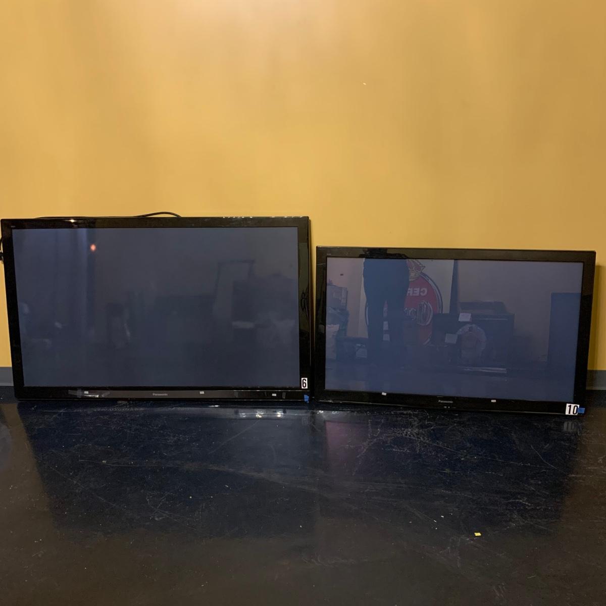 One 60” and one 50” Panasonic Plasma HDTVs. Both powered on when plugged in. The 50” has what appears to be a partial mount. We cannot verify if all mount parts are included. TVs are in good condition, but are a bit dusty so would benefit from a good dusting for a cleaner appearance. The 50” is Model No. TC-P50X3. The 60” is Model No. TC-P60S30. Local pickup only. TVs are quite heavy. The winning bidder will need to bring help to load items. There is a small flight of stairs to go down to the parking lot.