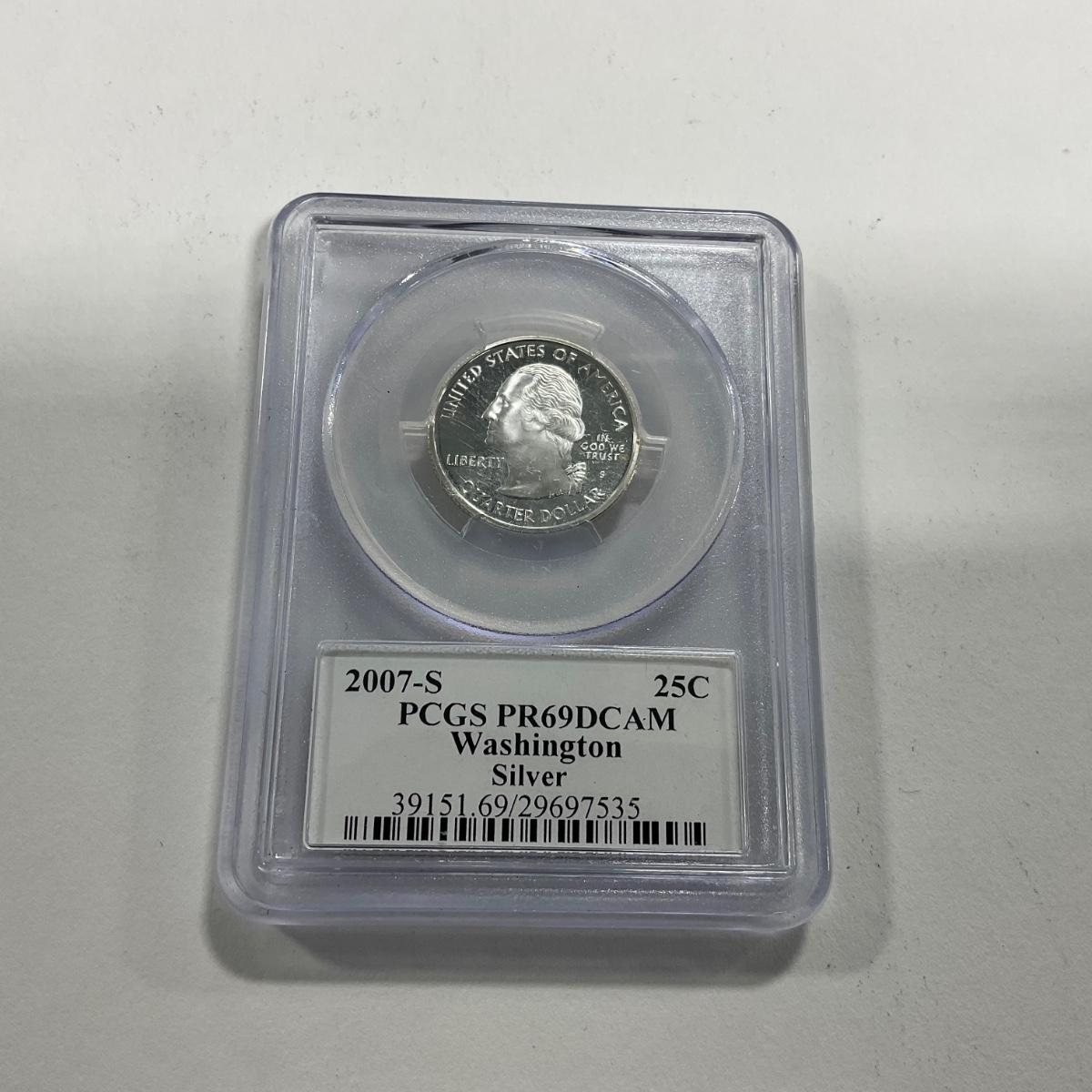 One graded 2007-S Washington silver proof PCGS PR69 DCAM state quarter coin. Please see photos for details and condition. ::: Shipping is available on this lot. If you require shipping you must let us know at the close of the auction. We will coordinate with you after the item has been won. Shipping fees will include insurance up to or exceeding the value of all items being mailed. If you have any questions regarding this lot please contact the auctioneer either via this website, by direct email or by phone. PICK UP TIMES and other important information can be found in the TERMS and DESCRIPTION of the auction. Please take a look for pertinent information. Thanks!