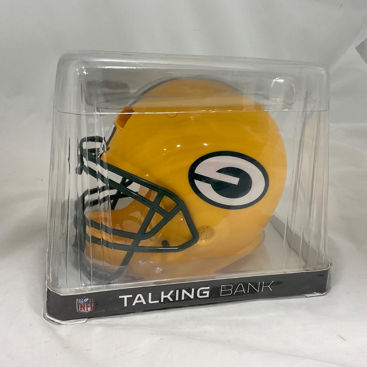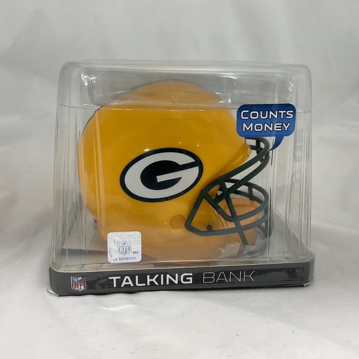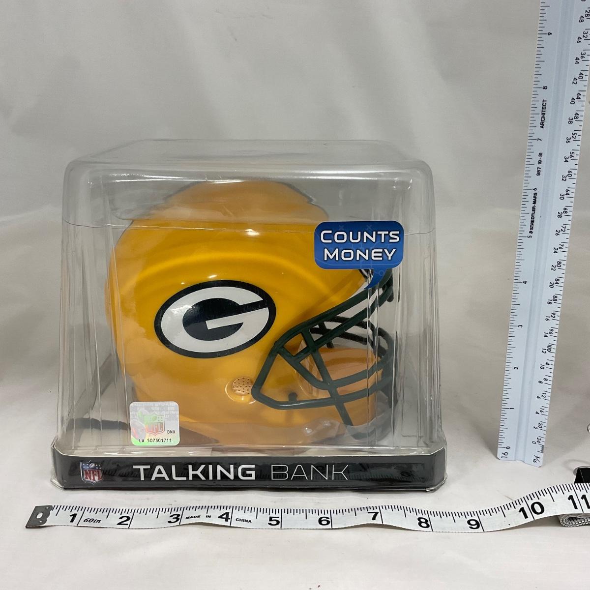 One New in box Green Bay Packers helmet bank, that talks while it counts the money. The perfect piece to gift that young Packer fan in your life! Please see photos for details and condition. ::: Shipping is available on this lot. If you require shipping you must let us know at the close of the auction. We will coordinate with you after the item has been won. Shipping fees will include insurance up to or exceeding the value of all items being mailed. If you have any questions regarding this lot please contact the auctioneer either via this website, by direct email or by phone. PICK UP TIMES and other important information can be found in the TERMS and DESCRIPTION of the auction. Please take a look for pertinent information. Thanks!