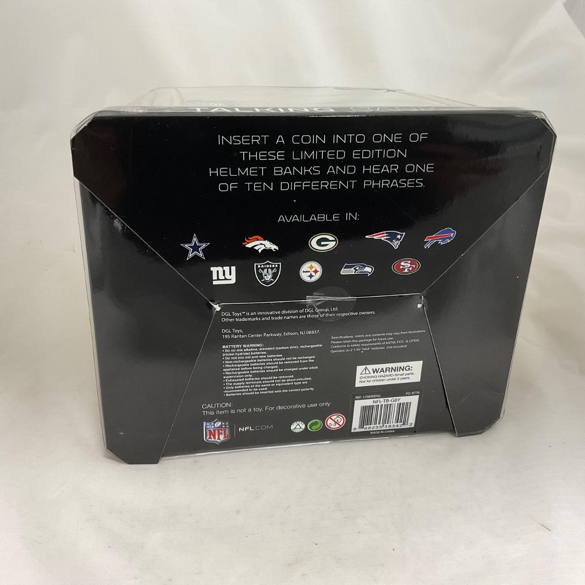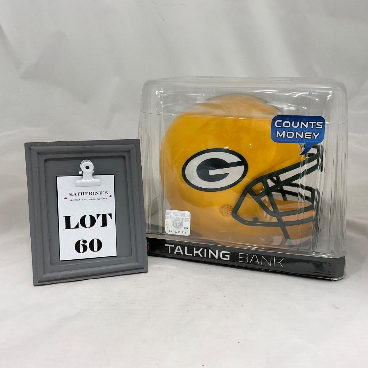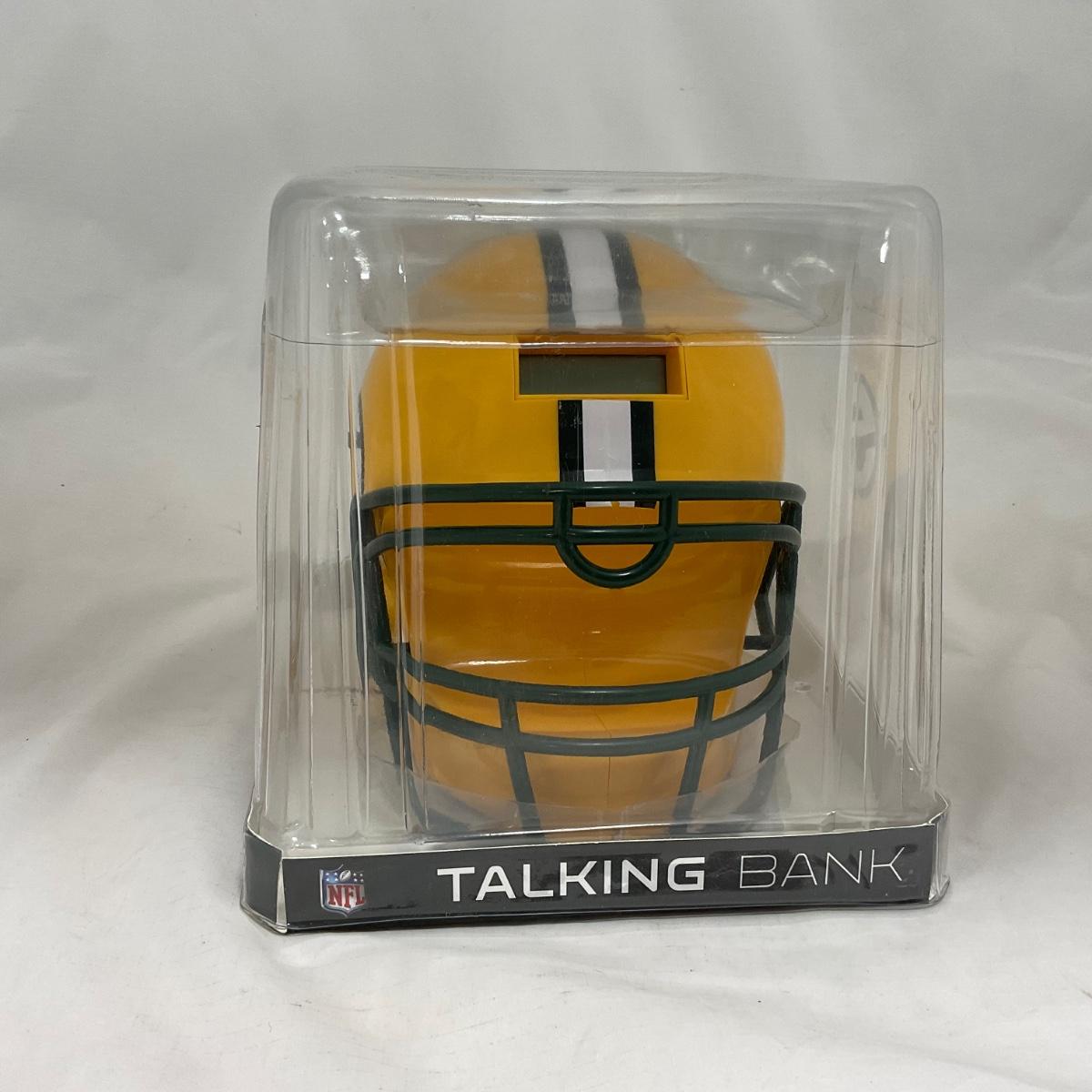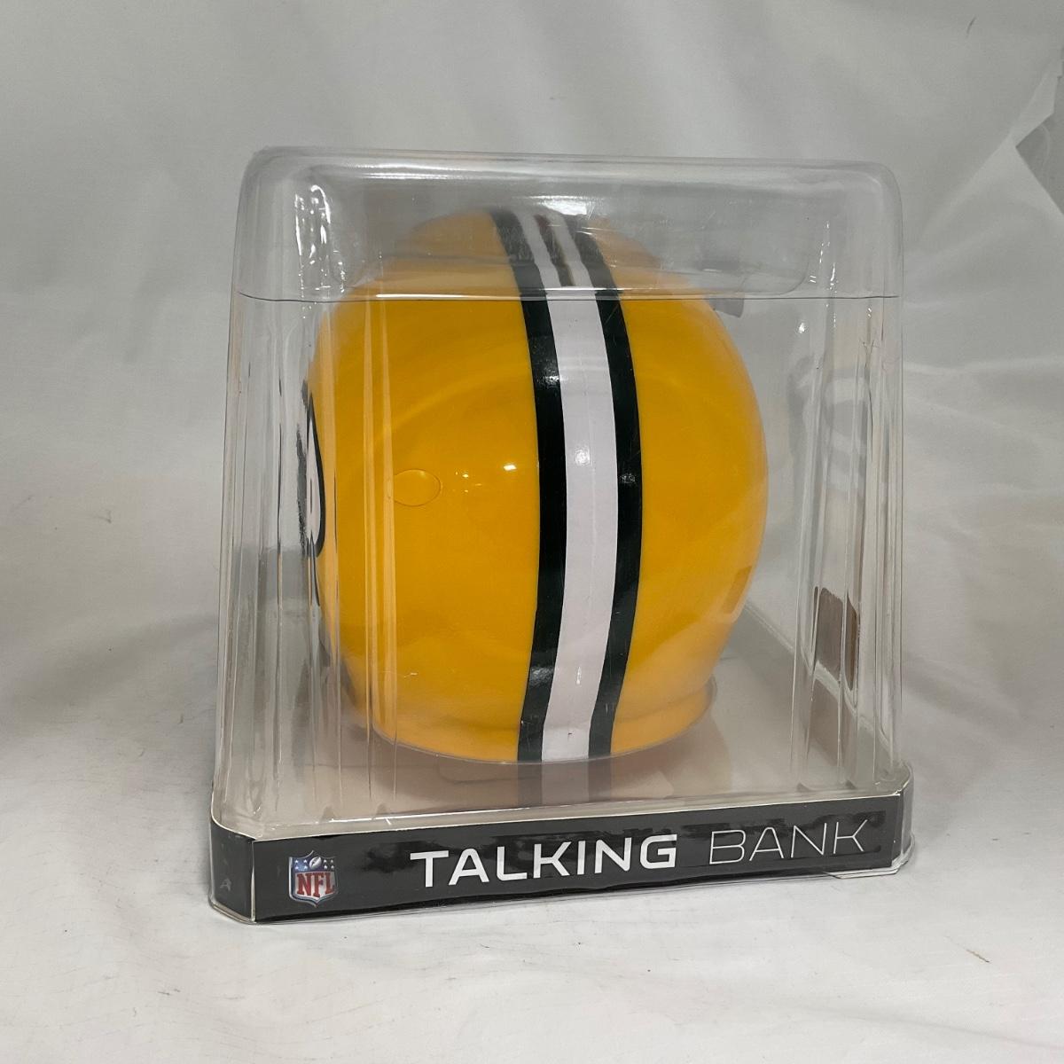 One New in box Green Bay Packers helmet bank, that talks while it counts the money. The perfect piece to gift that young Packer fan in your life! Please see photos for details and condition. ::: Shipping is available on this lot. If you require shipping you must let us know at the close of the auction. We will coordinate with you after the item has been won. Shipping fees will include insurance up to or exceeding the value of all items being mailed. If you have any questions regarding this lot please contact the auctioneer either via this website, by direct email or by phone. PICK UP TIMES and other important information can be found in the TERMS and DESCRIPTION of the auction. Please take a look for pertinent information. Thanks!