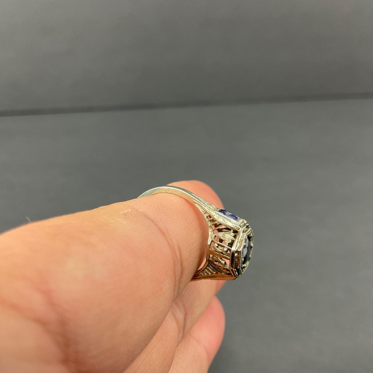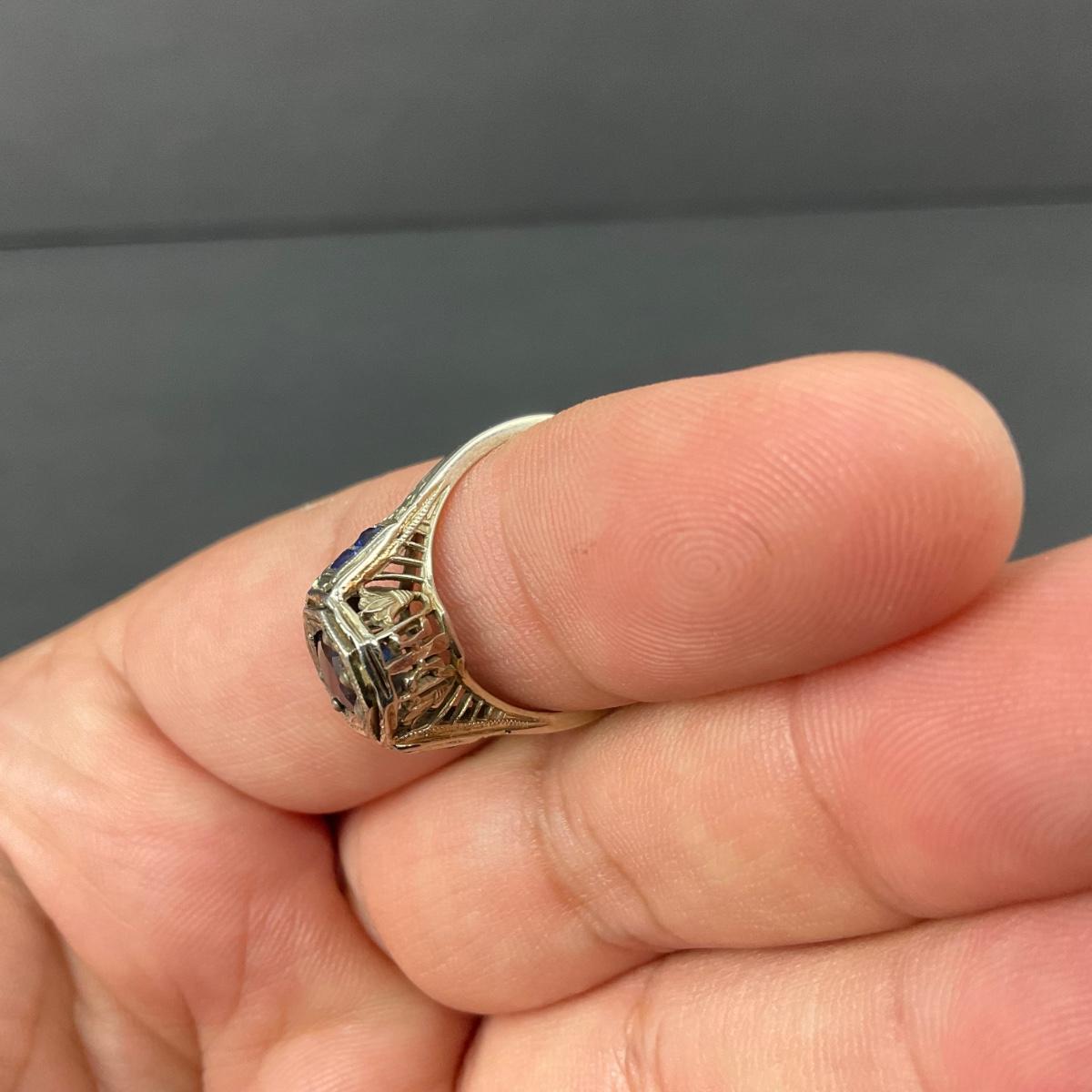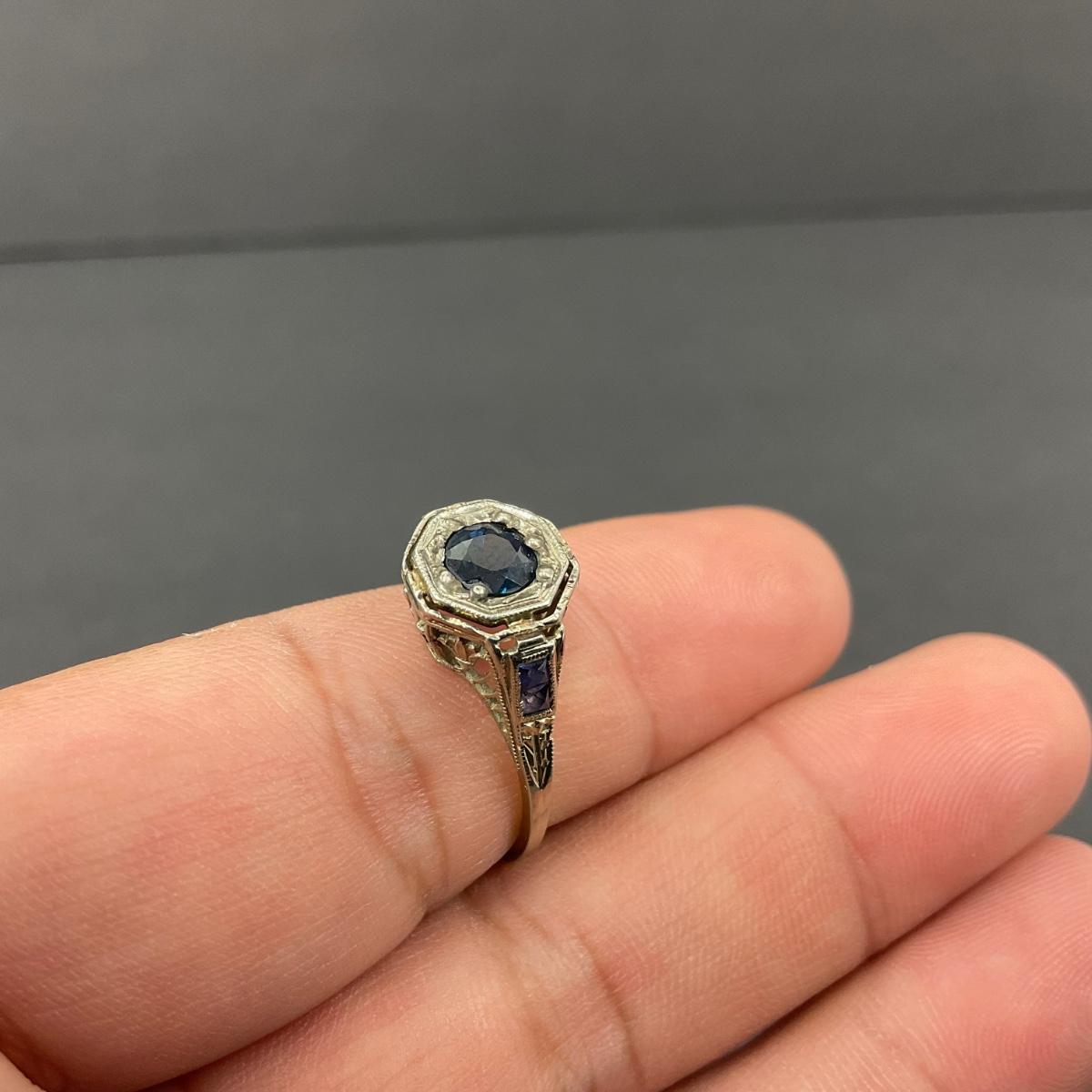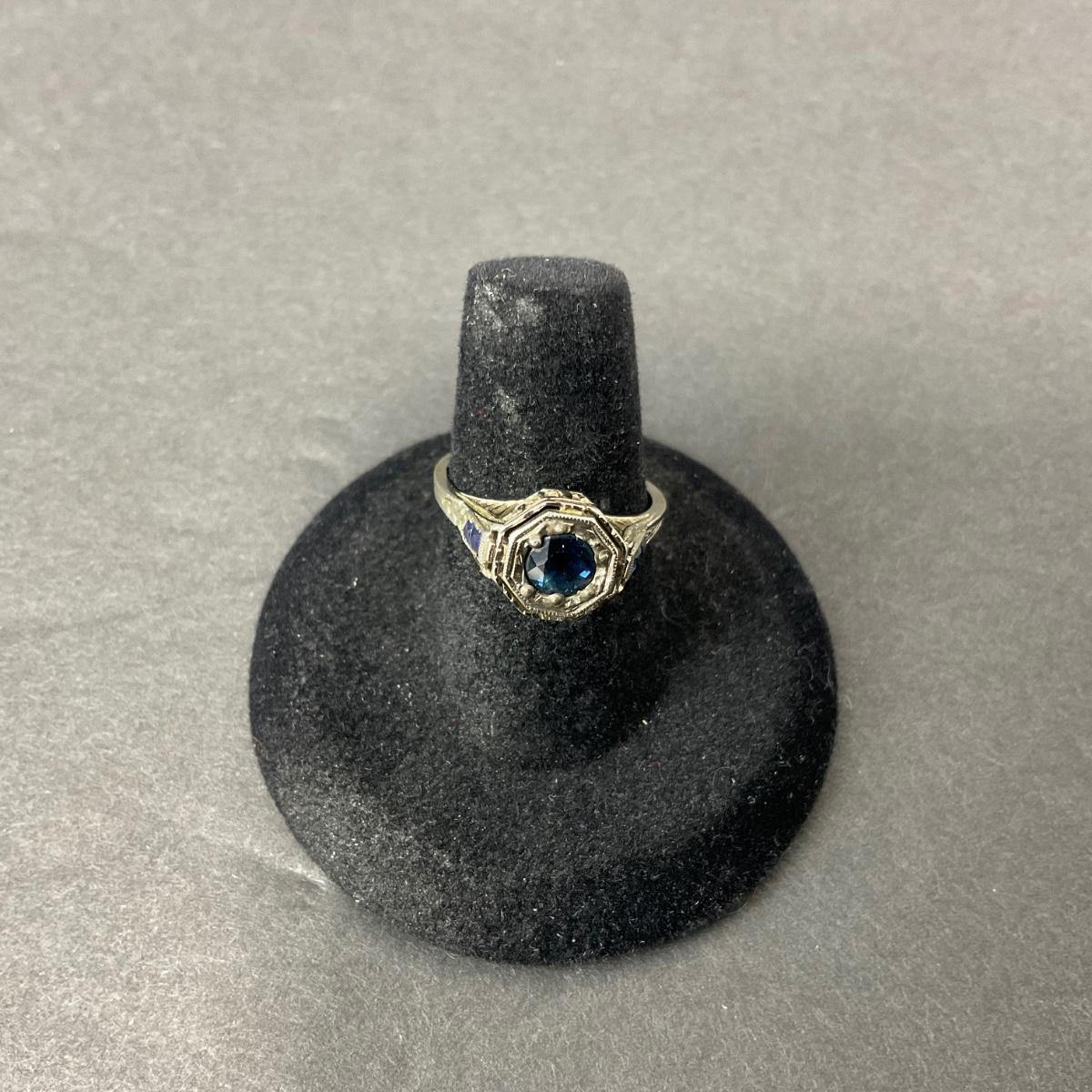 One marked 18K gold and blue stone ring. This piece is a size. The total weight for this piece including the stone 1.5 DWT. Please see photos for details and condition. Any condition statement is given as a courtesy to a client, is an opinion, and should not be treated as a statement of fact. Reference to condition written, oral or within a condition report shall not be regarded as a full account of condition and may not include all defects, alterations, or restorations. Absence of a condition report does not imply a lot is flawless or lacking imperfections or damage. Katherine’s Auction & Appraisal Service shall have no responsibility for any error or omission. Returns shall not be accepted on the basis of condition. ::: Shipping is available on this lot. If you require shipping you must let us know at the close of the auction. We will coordinate with you after the item has been won. Shipping fees will include insurance up to or exceeding the value of all items being mailed. If you have any questions regarding this lot please contact the auctioneer either via this website, by direct email or by phone. PICK UP TIMES and other important information can be found in the TERMS and DESCRIPTION of the auction. Please take a look for pertinent information. Thanks!
