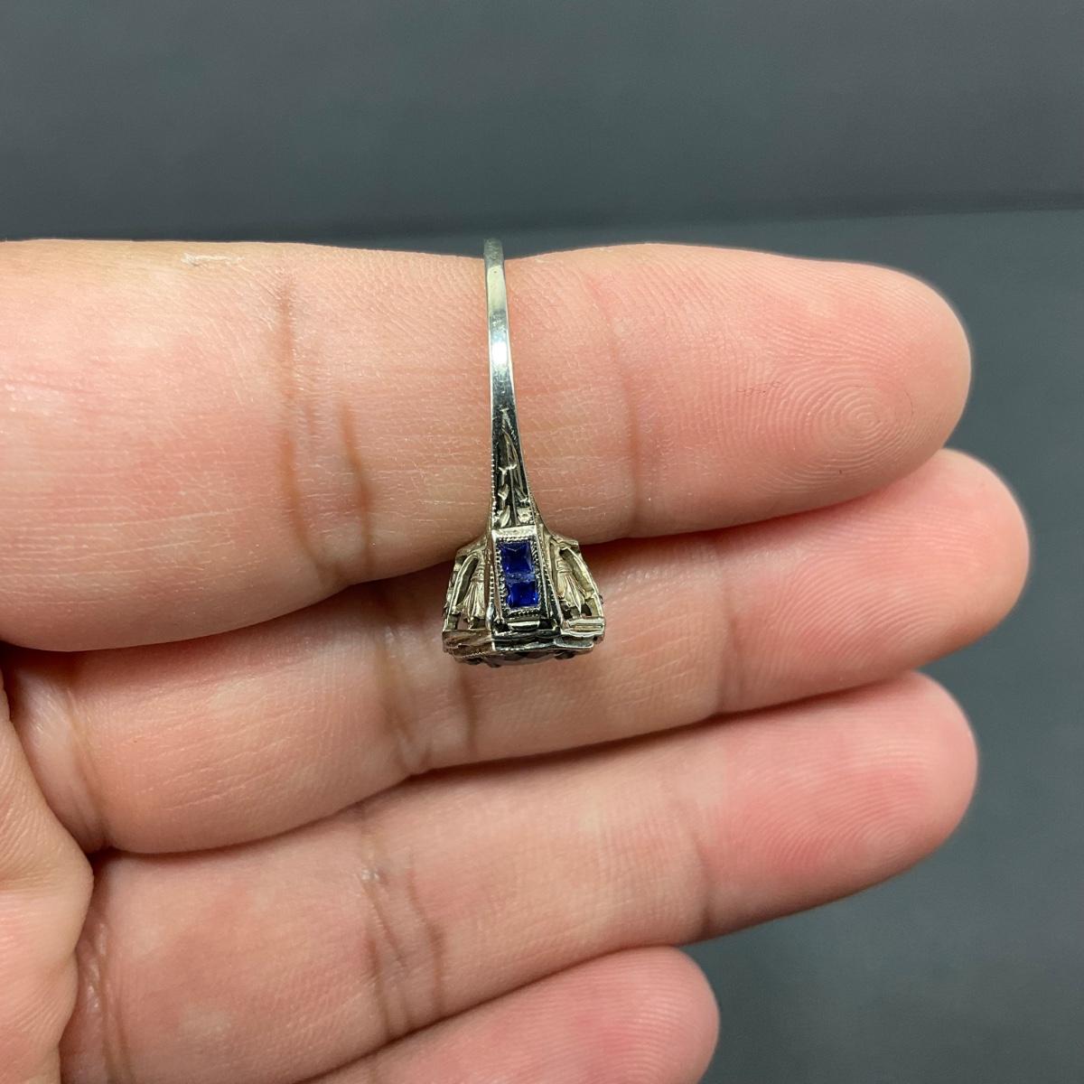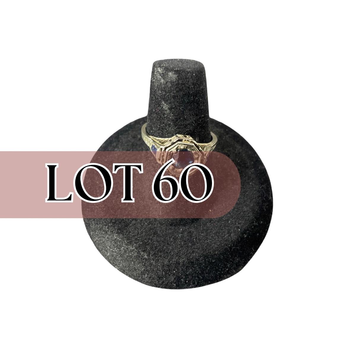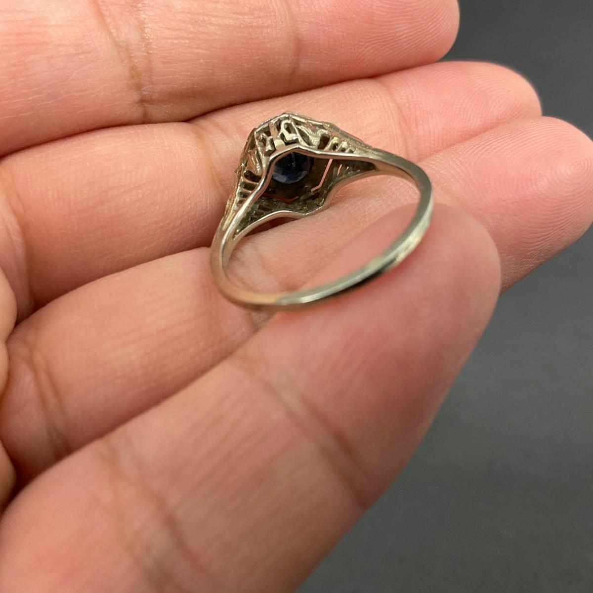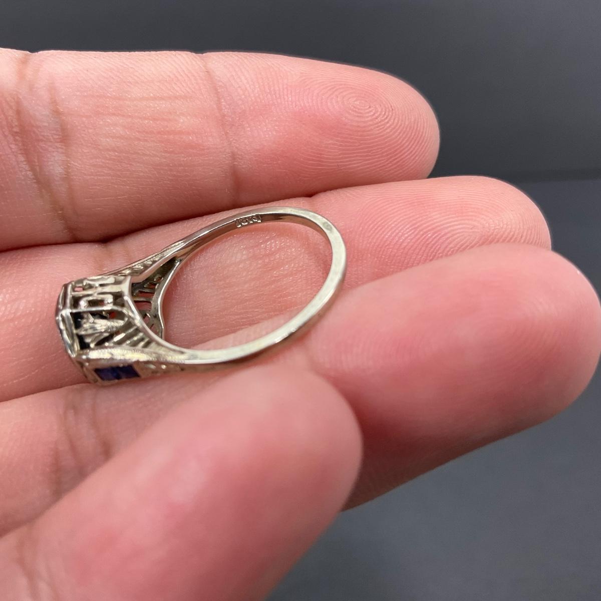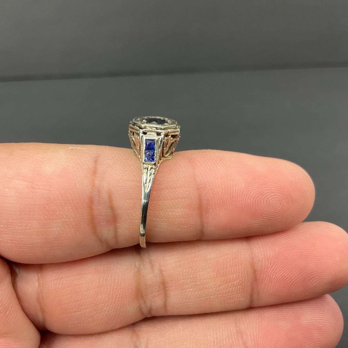 One marked 18K gold and blue stone ring. This piece is a size. The total weight for this piece including the stone 1.5 DWT. Please see photos for details and condition. Any condition statement is given as a courtesy to a client, is an opinion, and should not be treated as a statement of fact. Reference to condition written, oral or within a condition report shall not be regarded as a full account of condition and may not include all defects, alterations, or restorations. Absence of a condition report does not imply a lot is flawless or lacking imperfections or damage. Katherine’s Auction & Appraisal Service shall have no responsibility for any error or omission. Returns shall not be accepted on the basis of condition. ::: Shipping is available on this lot. If you require shipping you must let us know at the close of the auction. We will coordinate with you after the item has been won. Shipping fees will include insurance up to or exceeding the value of all items being mailed. If you have any questions regarding this lot please contact the auctioneer either via this website, by direct email or by phone. PICK UP TIMES and other important information can be found in the TERMS and DESCRIPTION of the auction. Please take a look for pertinent information. Thanks!