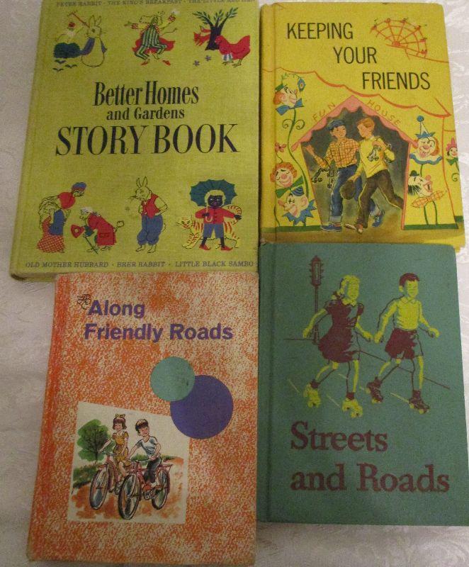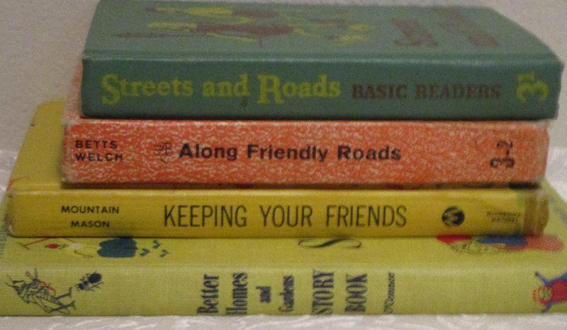 Streets and Roads Basic Readers 3-1 1946-47 edition; Along Friendly Roads 3-2 1963 edition; Keeping Your Friends 1965 edition; Better Homes and Gardens Story Book 1950 edition; some school books