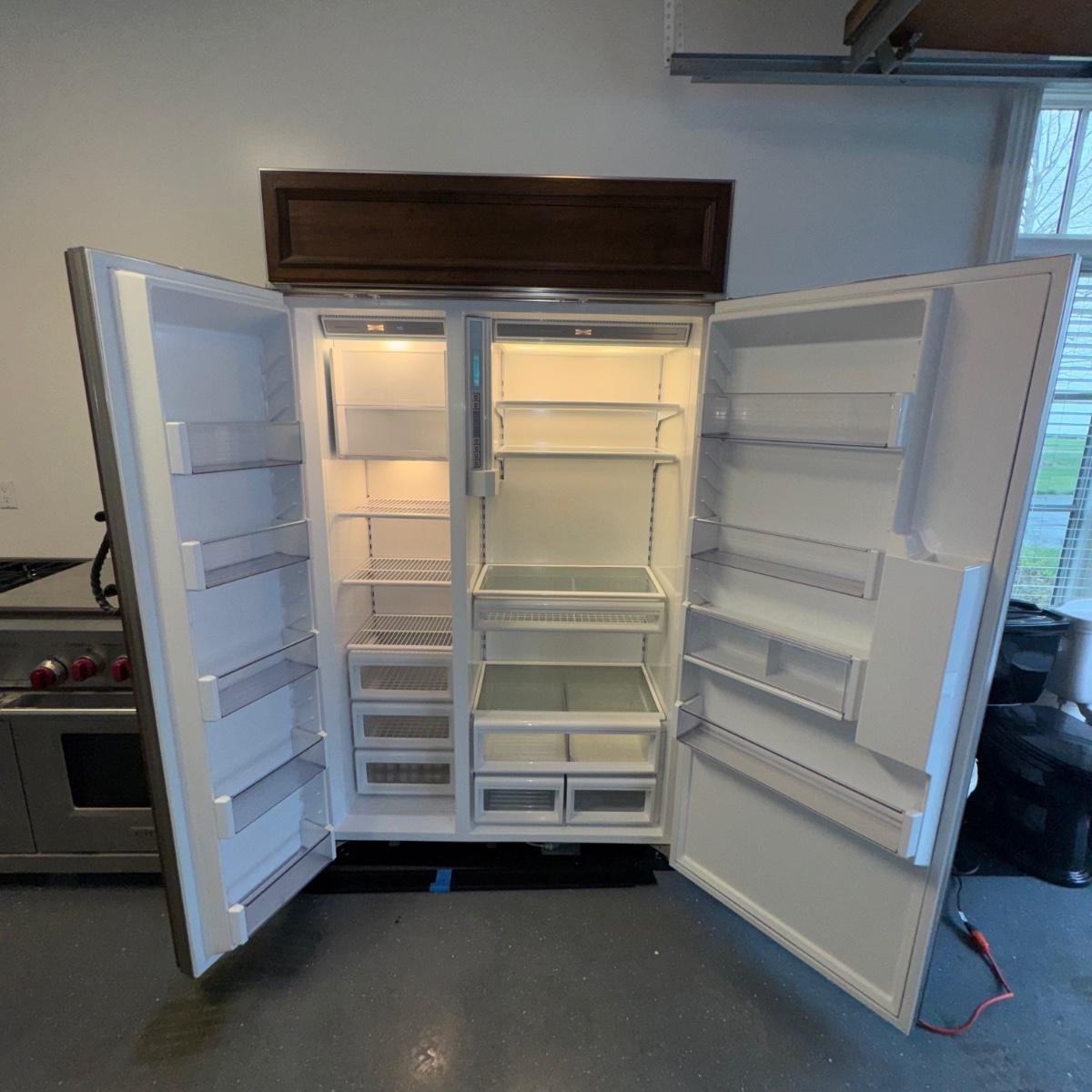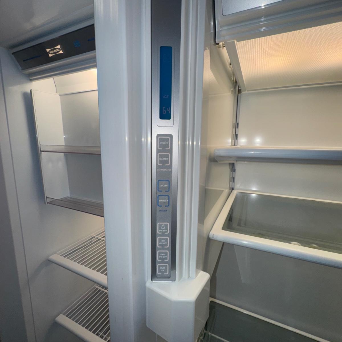 The Sub-Zero Model 695/03 is a 48" classic side-by-side refrigerator/freezer with internal dispenser, featuring a 28 cubic foot capacity, with 18.2 cubic feet for fresh food and 9.8 cubic feet for freezer, and dimensions of 48"W x 84"H x 24"D.