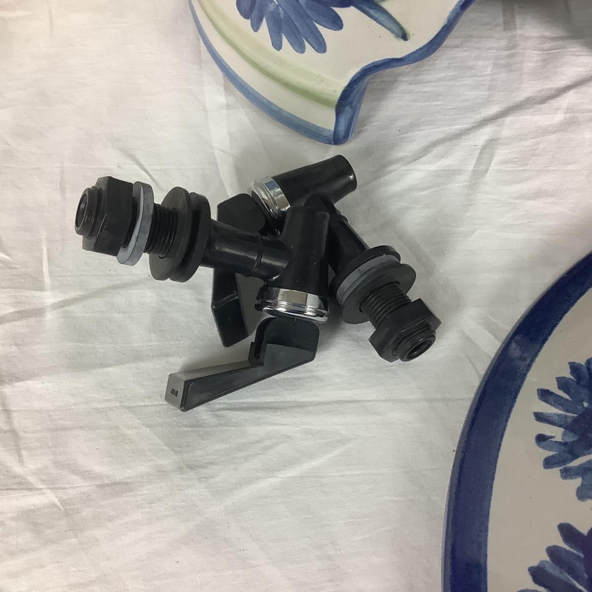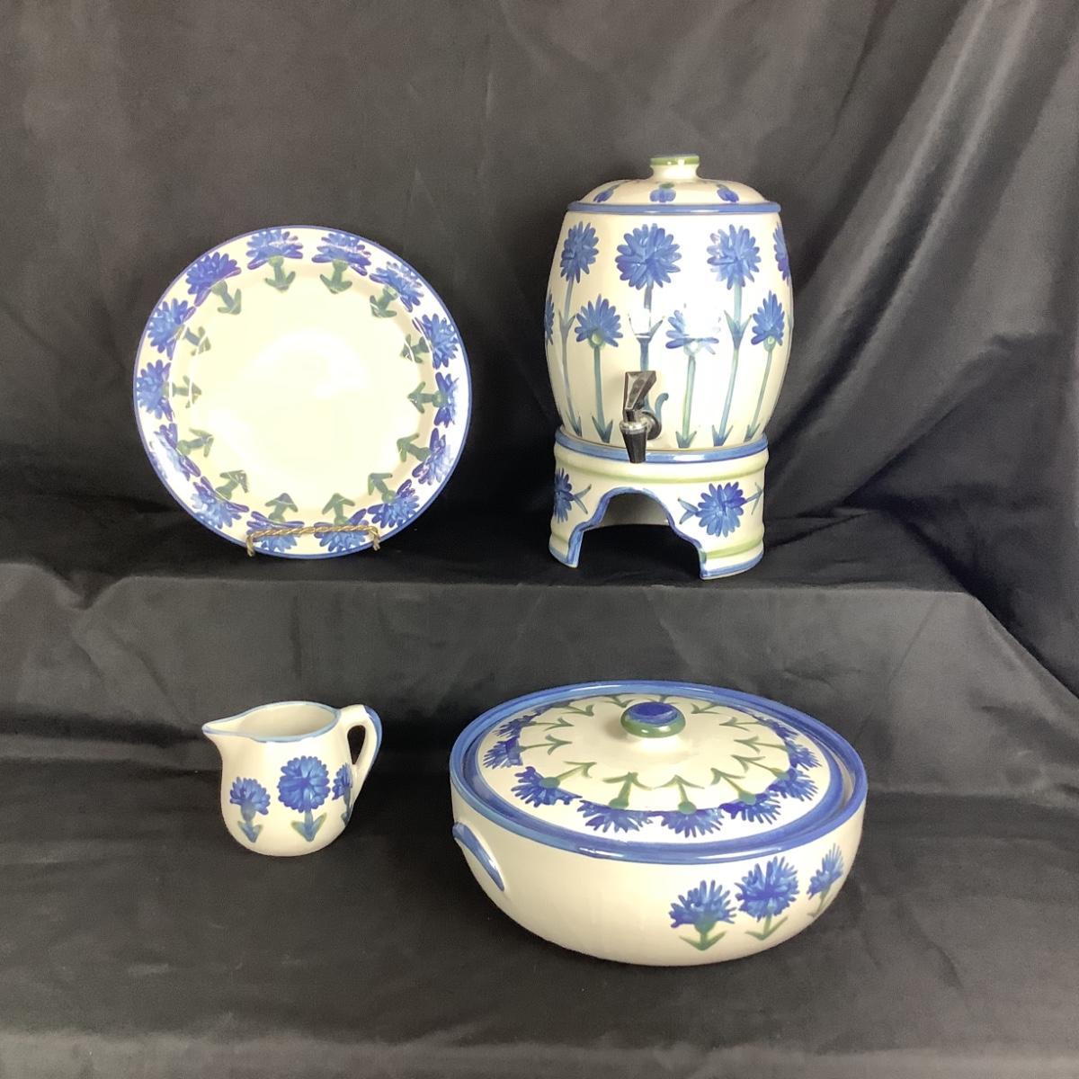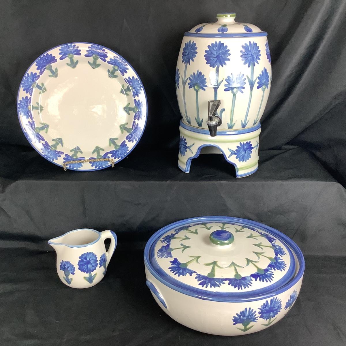 Batchelor Button Cornflower Drink dispenser 15" tall with 2 extra dispenser nozzles, Charger is 13" round, Large Bowl with lid, Bowl 14” Round, is 12 1/2 " round. Creamer 4 1\2 " tall. All in good condition.