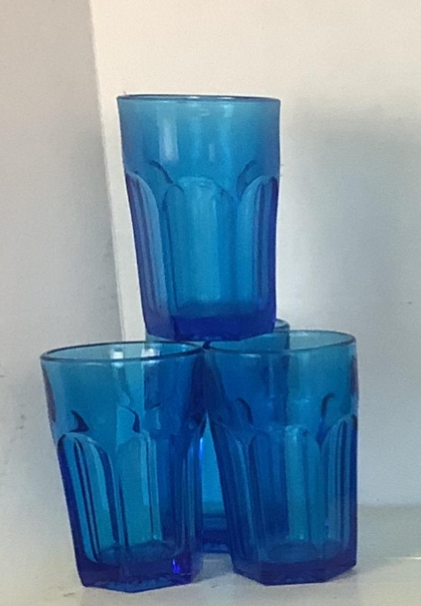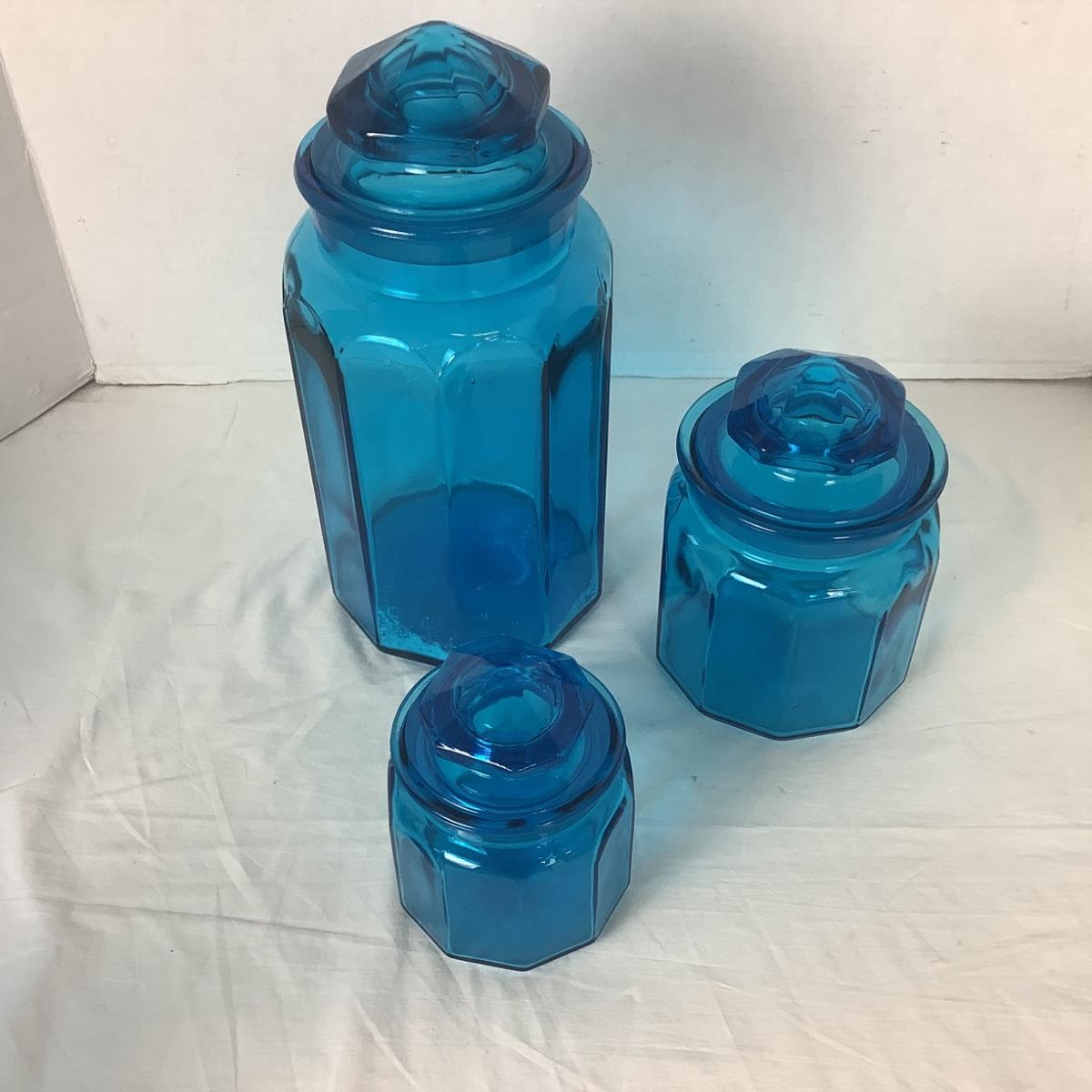 Mid Century Modern Cobalt blue 3 piece canister set. 8 piece vintage Imperial Glass old Williamsburg blue Cobalt Blue Goblets. Vintage set of 4 Libby Crisa Cobalt Blue dinking glasses.