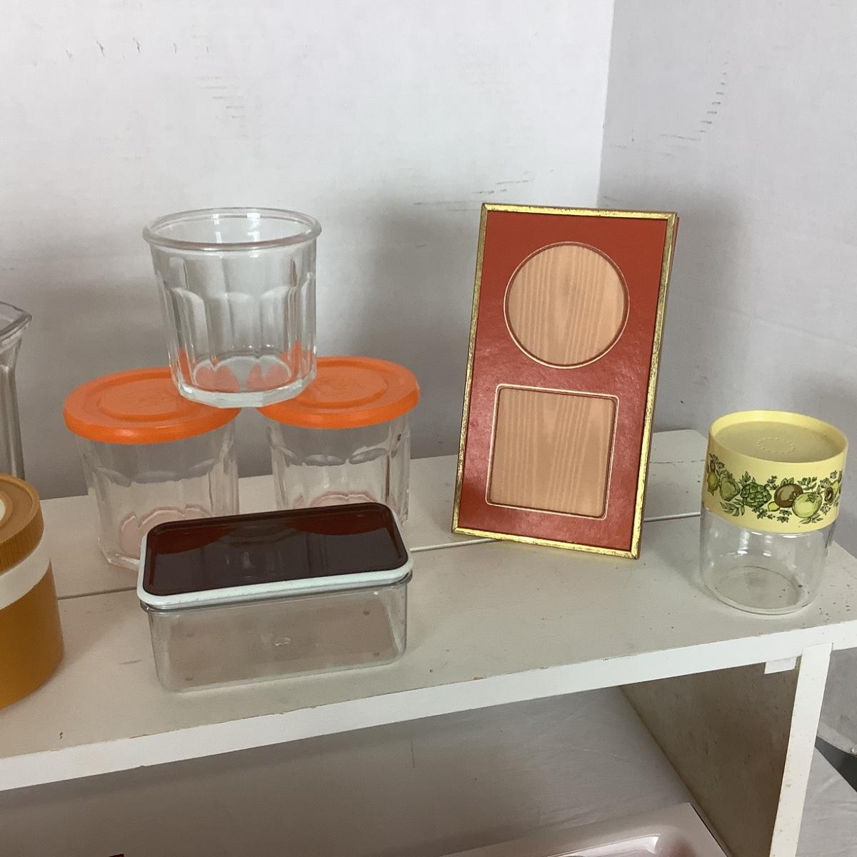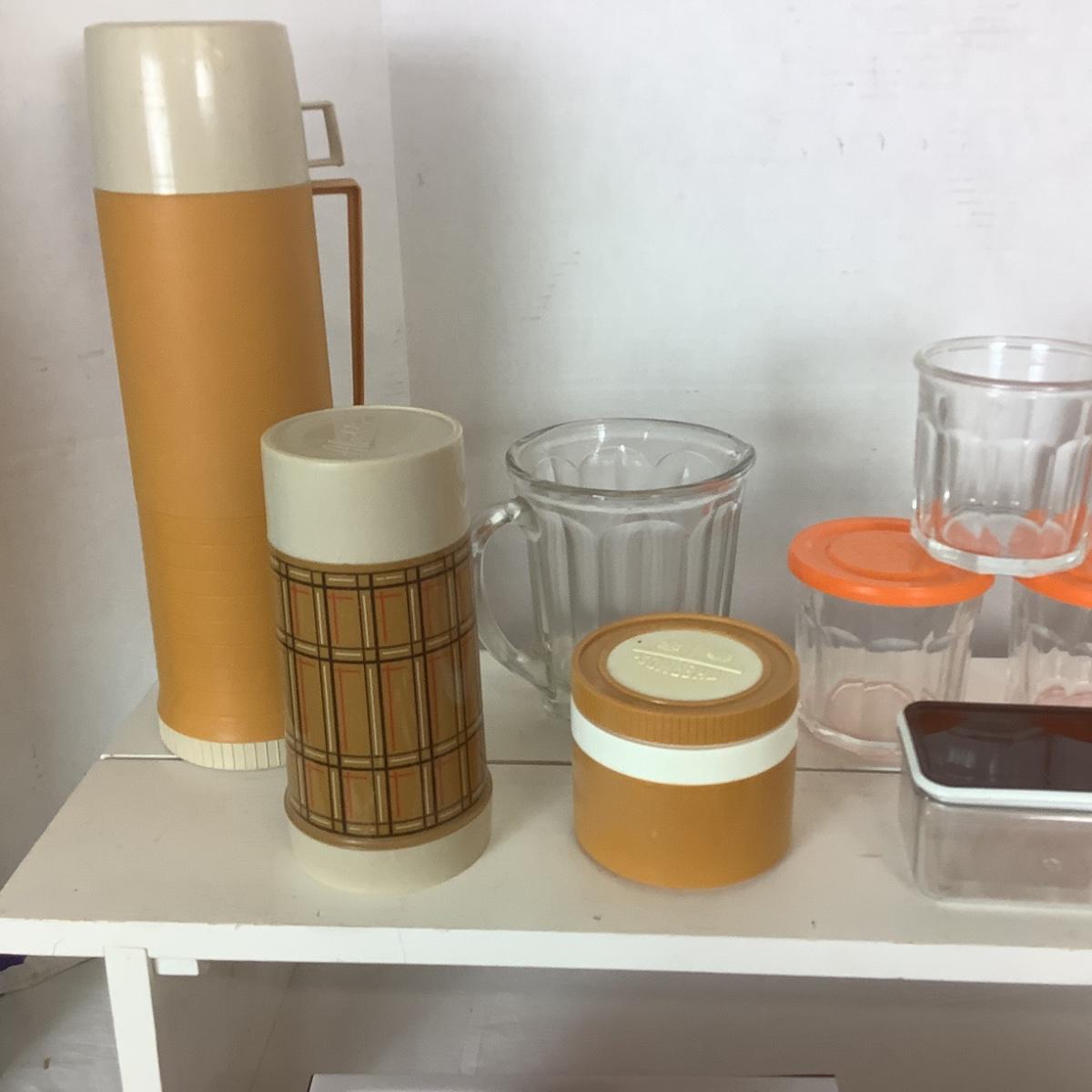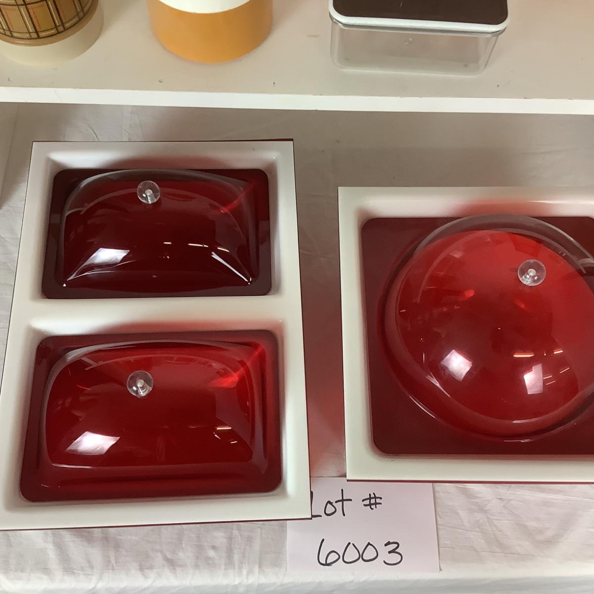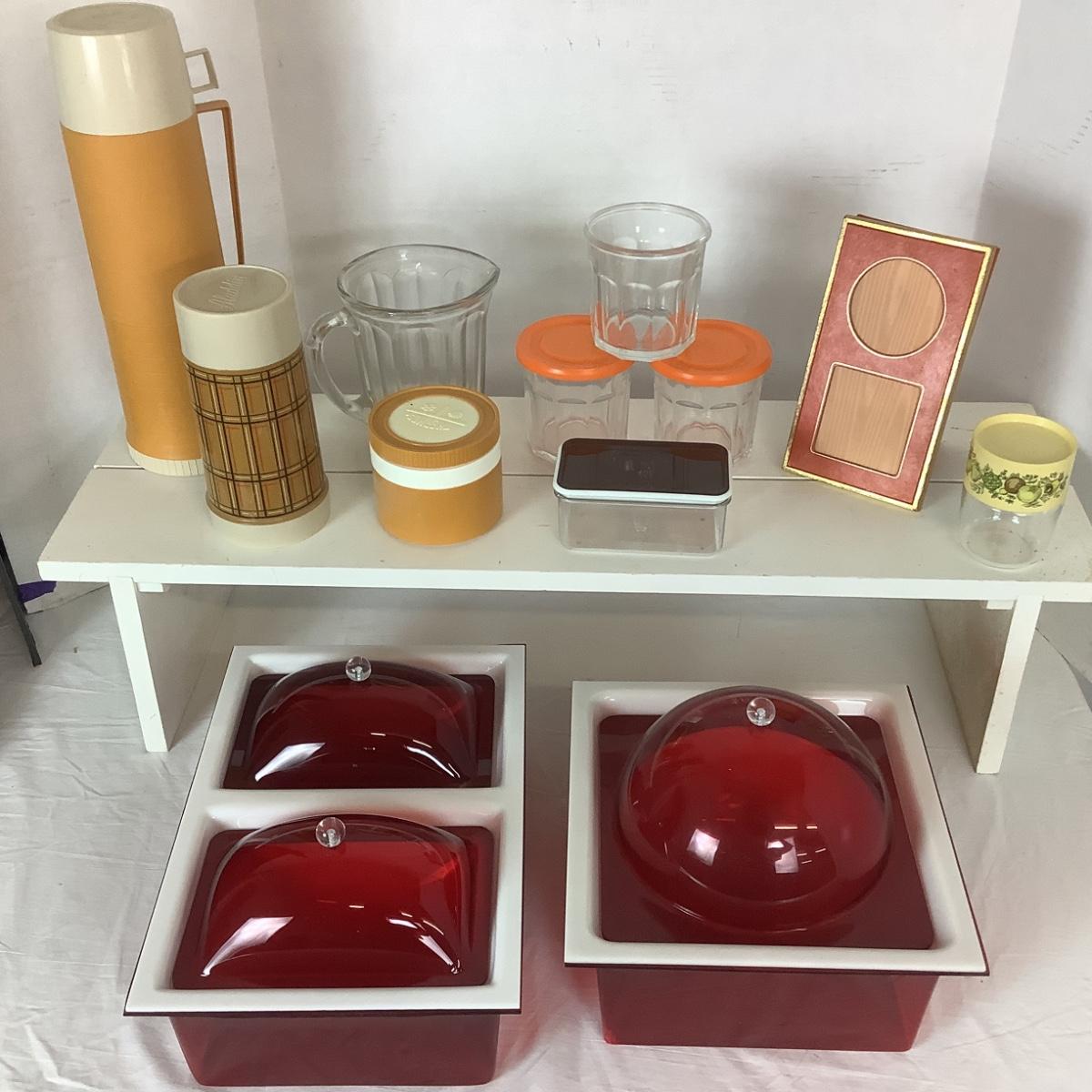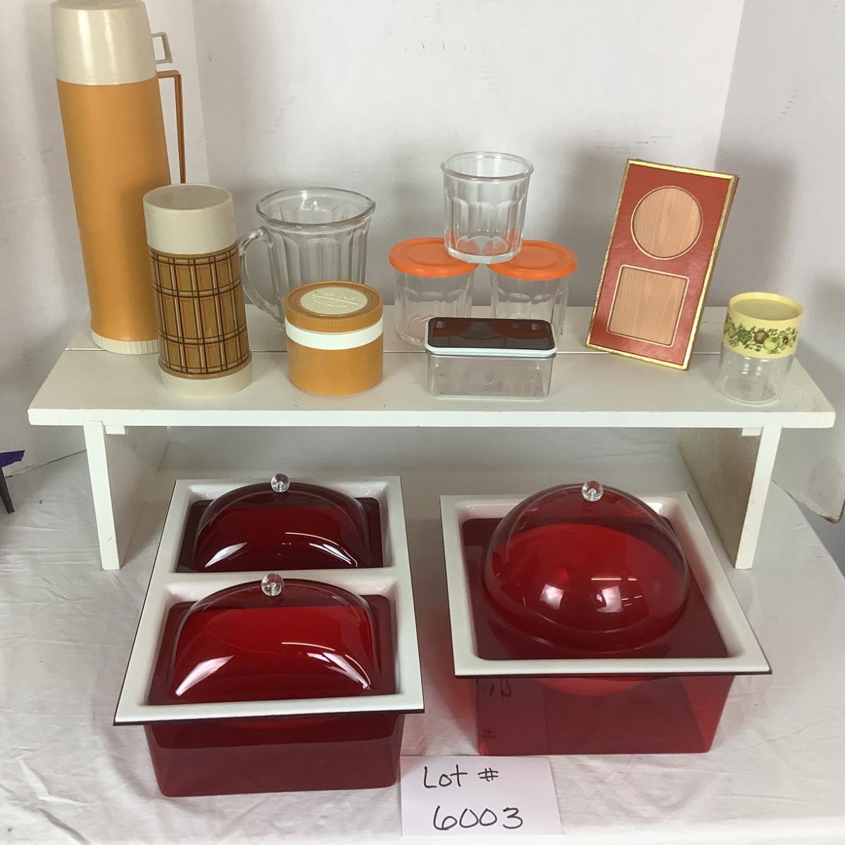 Pair of Vintage Mid Century Red Orb AcrylicIce Buckets, 3 Vintage Thermoses, Set of vintage glass, butter dish, storage plus picture frame.