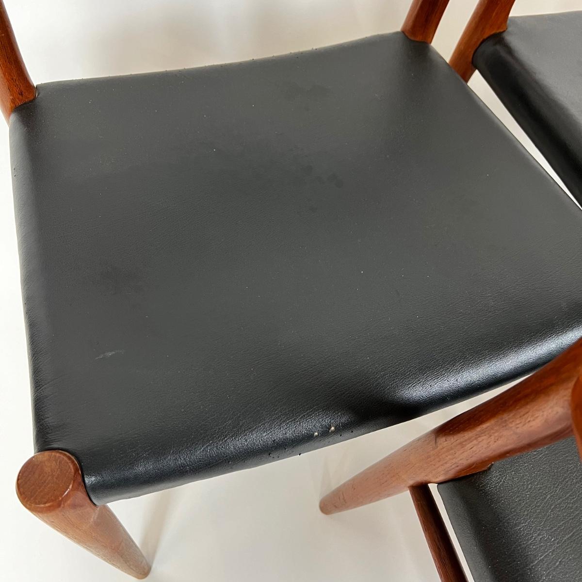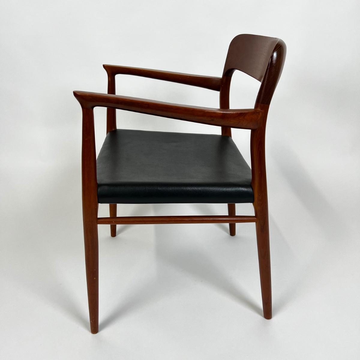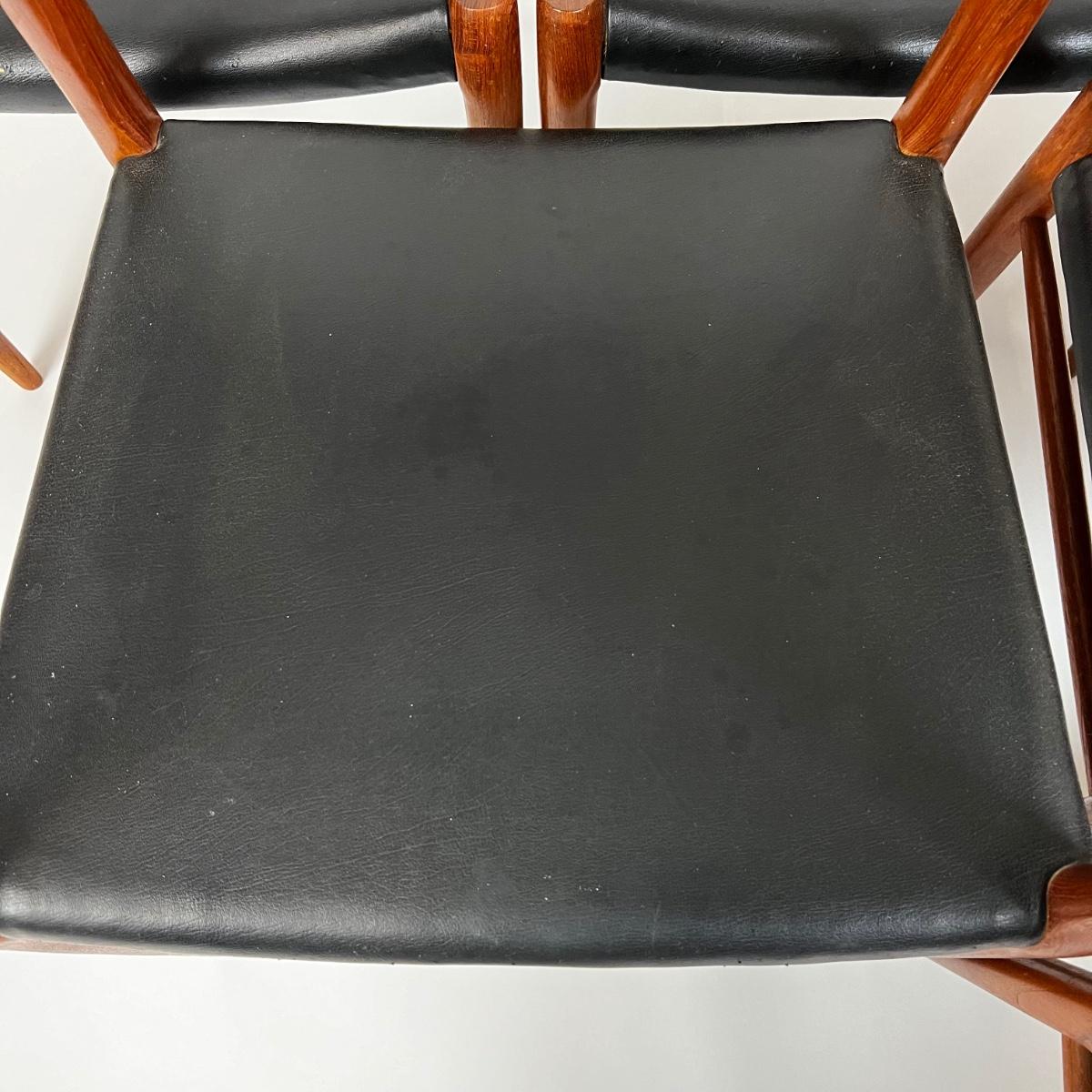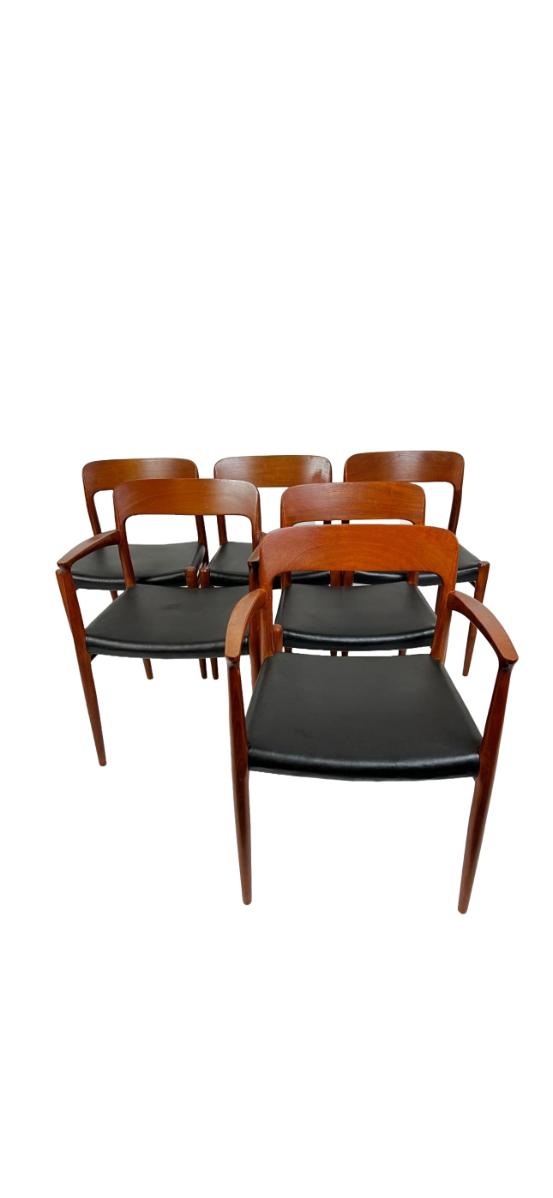 Dining chairs from the 1950s. Mid-century modern set of 6, black leather upholstered seats. The 2 armchairs are model 56 and the chairs are model 75. Designed by Niels O. Møller for his own furniture production company J.L. Møllers Møbelfabrik.