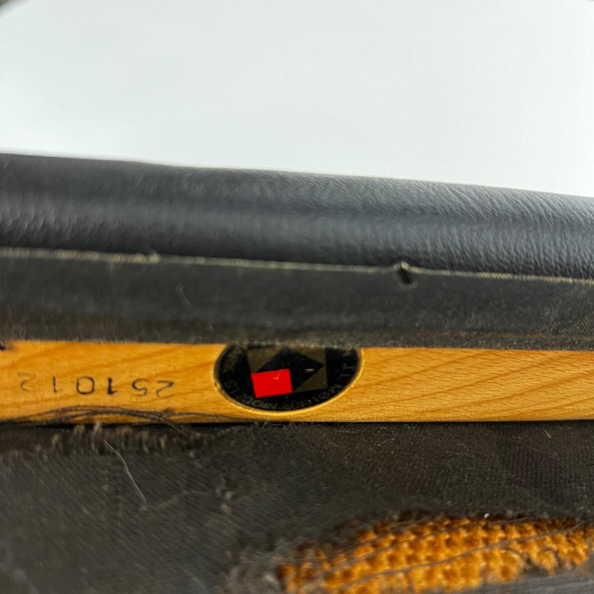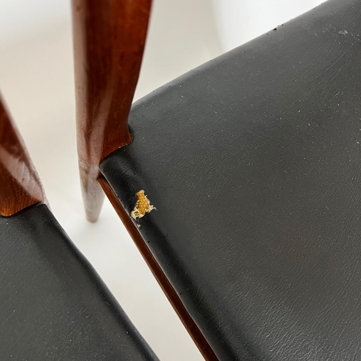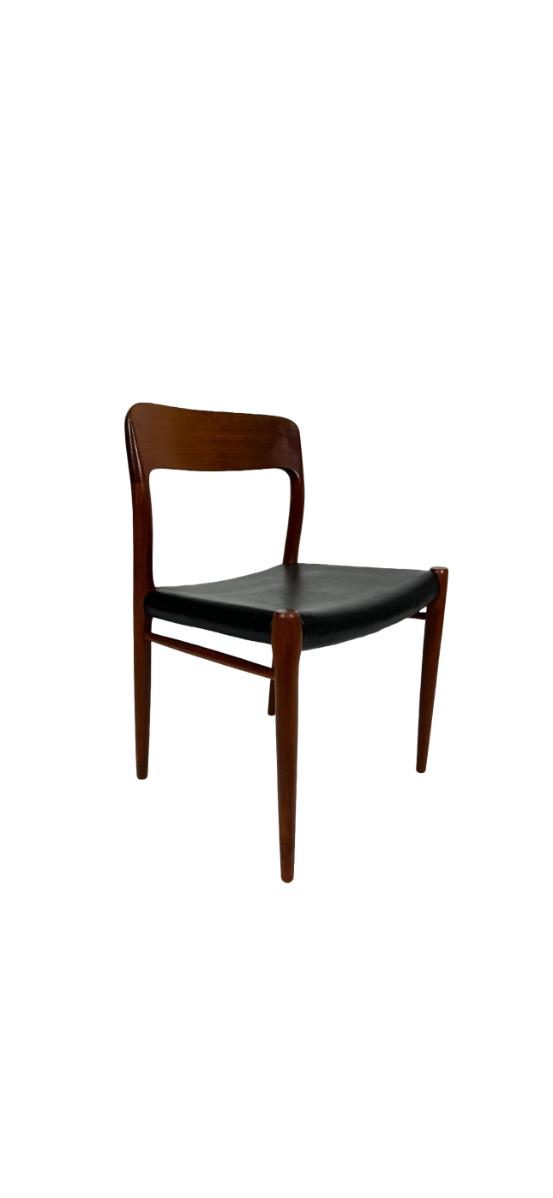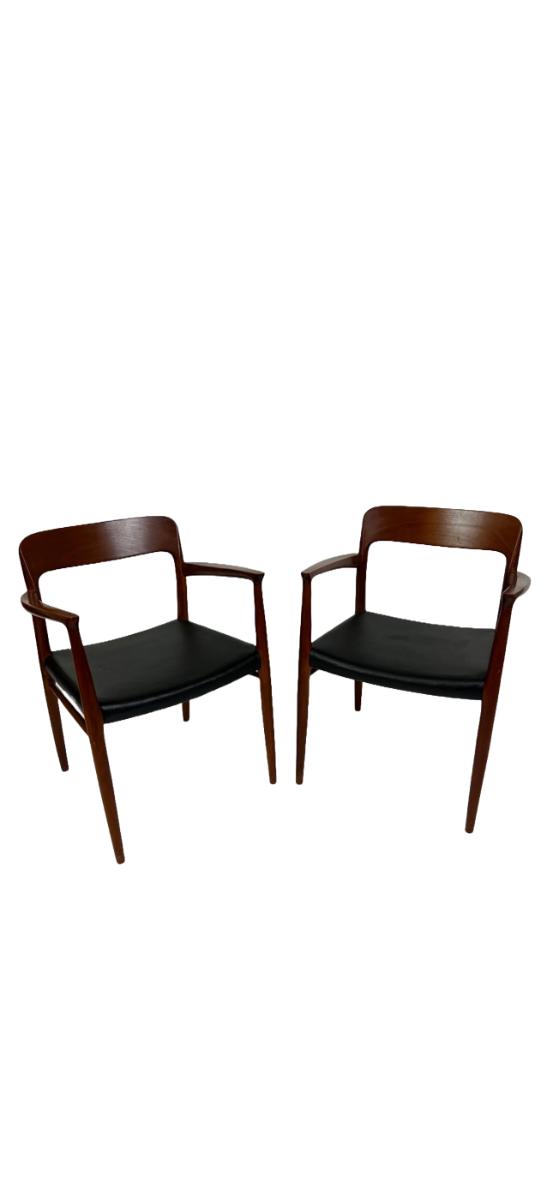Dining chairs from the 1950s. Mid-century modern set of 6, black leather upholstered seats. The 2 armchairs are model 56 and the chairs are model 75. Designed by Niels O. Møller for his own furniture production company J.L. Møllers Møbelfabrik.