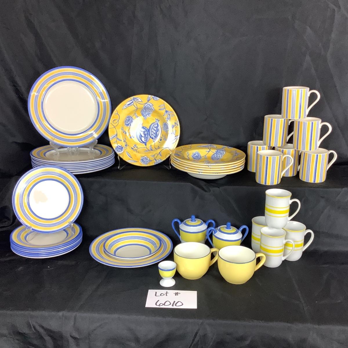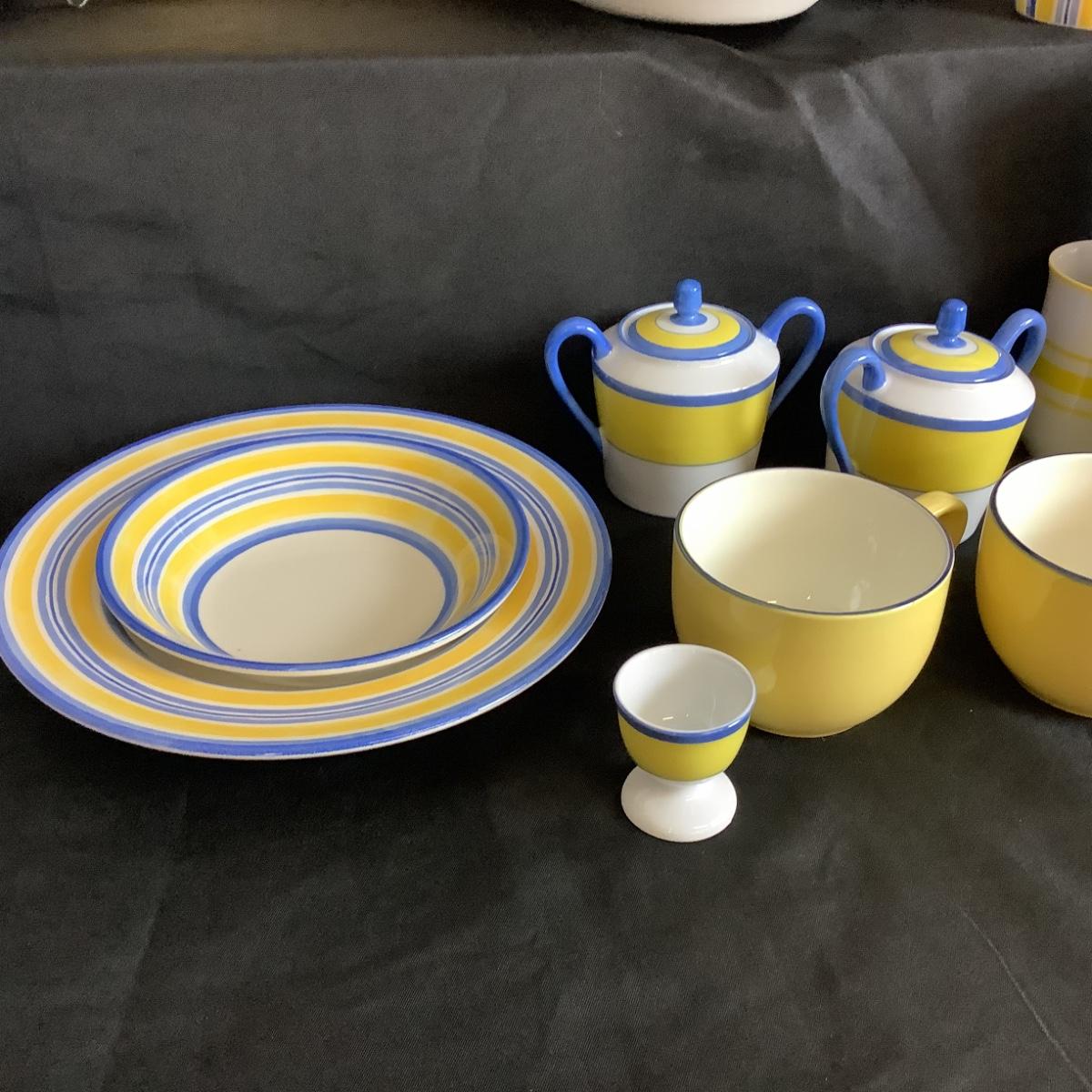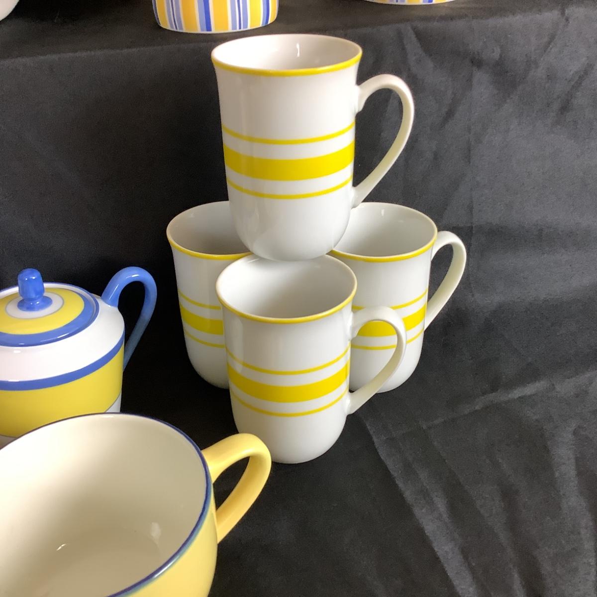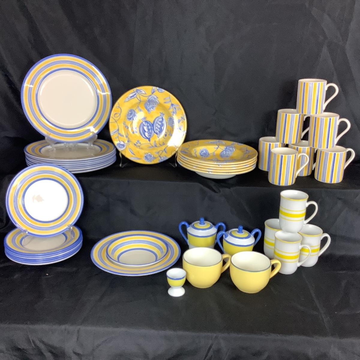 8 Dinner Plates, 6 bowls, 7 side plates, 1 bowl, 1 salad bowl, 7 mugs, 4 mugs, 2 cups, 1 egg cup, tea and sugar cups with lids