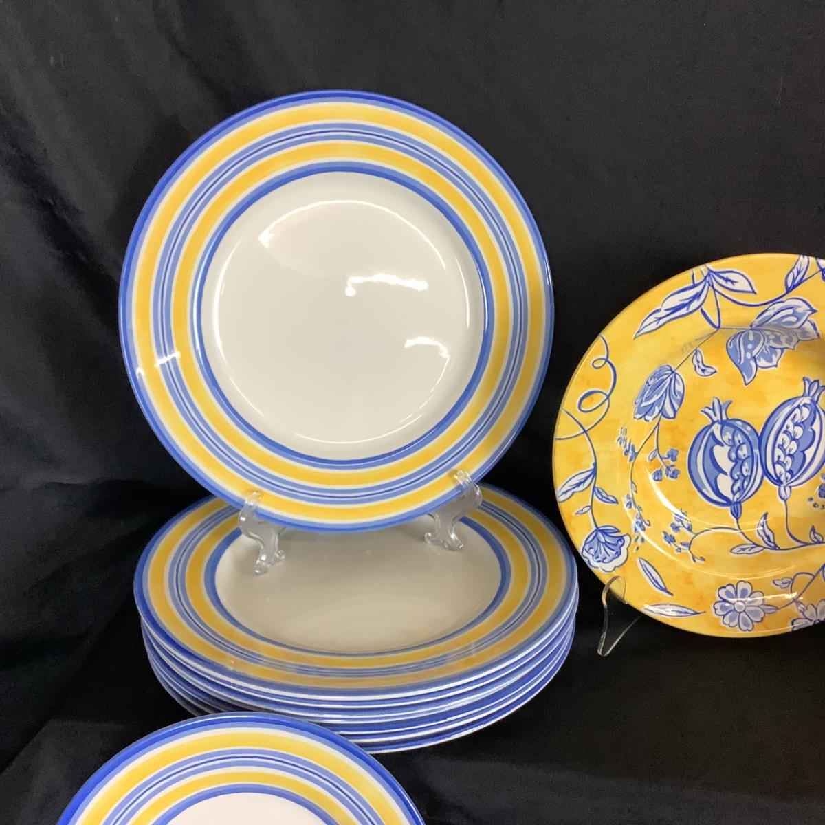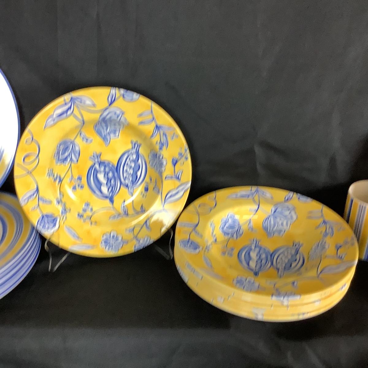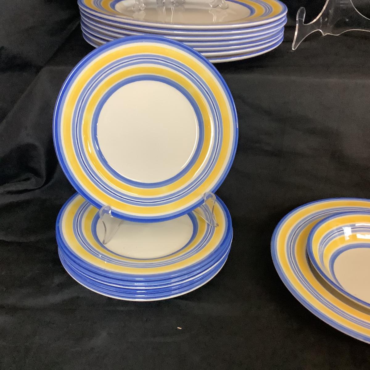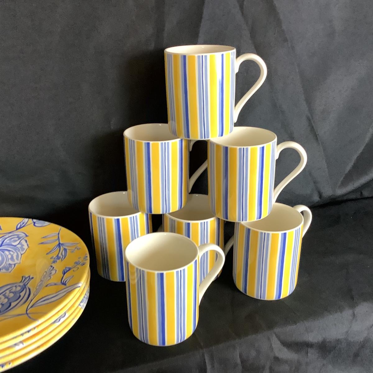 8 Dinner Plates, 6 bowls, 7 side plates, 1 bowl, 1 salad bowl, 7 mugs, 4 mugs, 2 cups, 1 egg cup, tea and sugar cups with lids