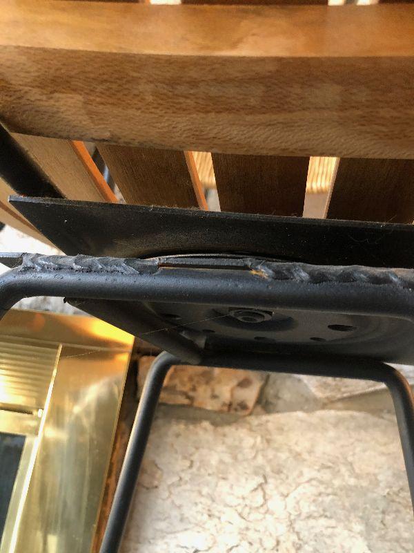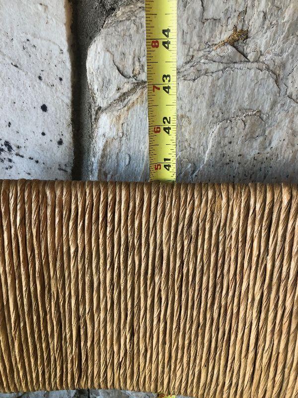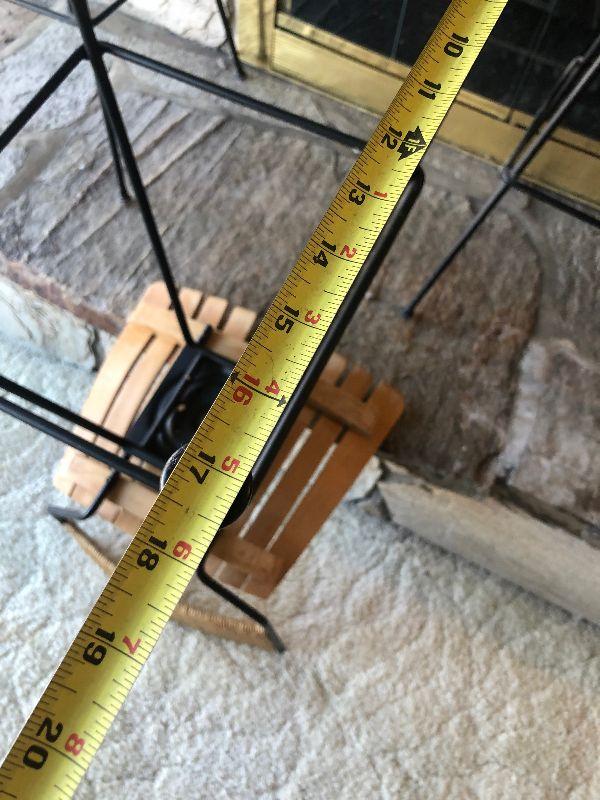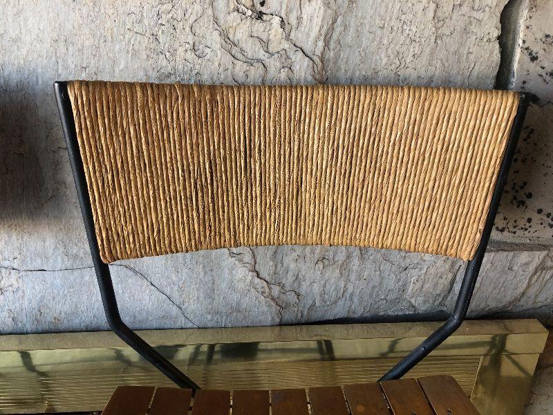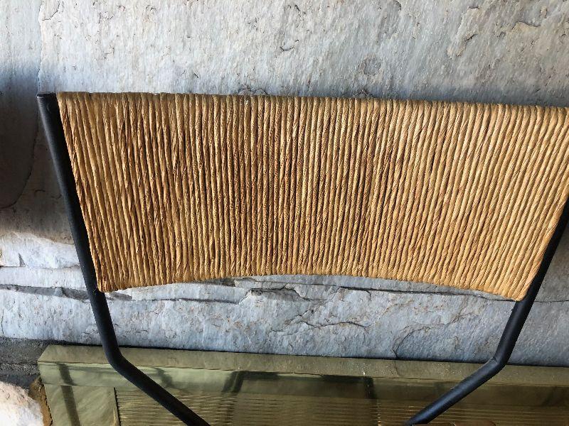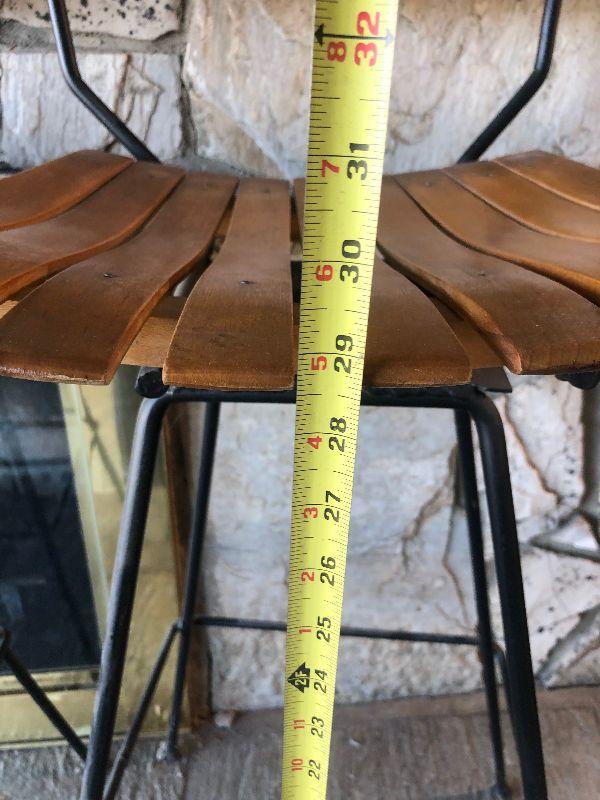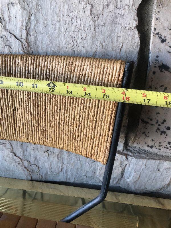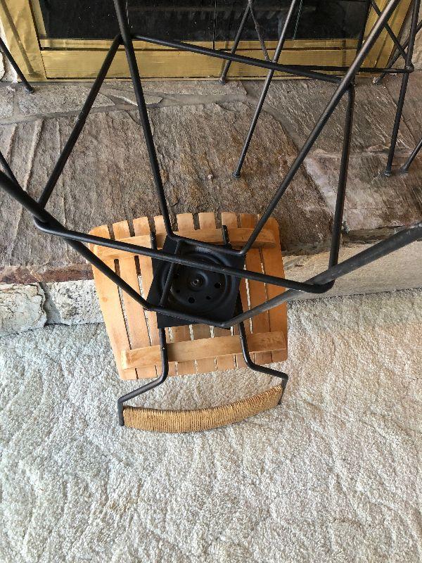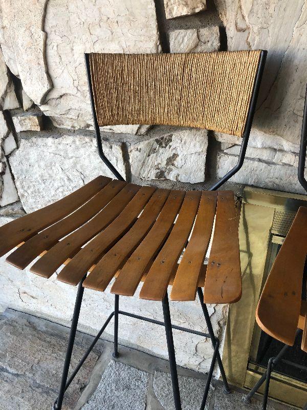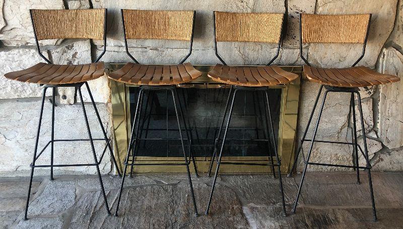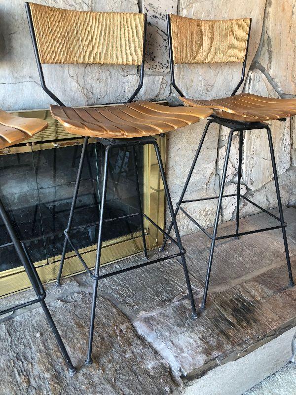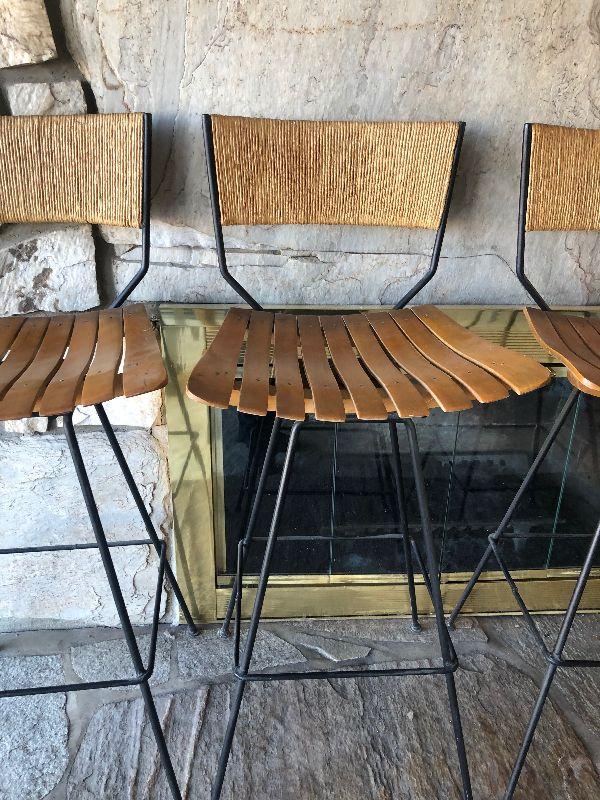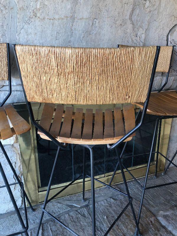 In great condition, some wear from use, vintage1960's wrought iron base, wood slat seat and raffia/rush back. Stools swivel, 29" floor to seat, 41" tall. Genuine vintage mid-century furniture from a period home. No shipping available but will help facilitate drop of to a shipping company