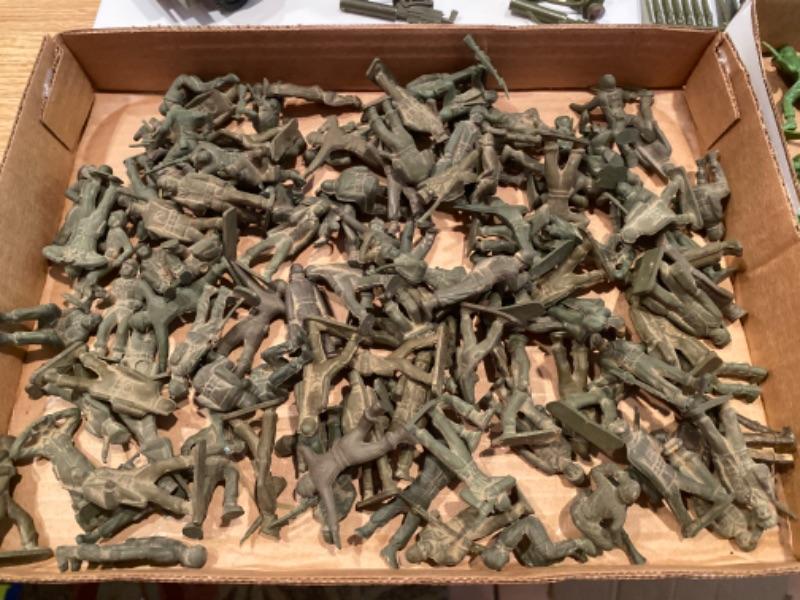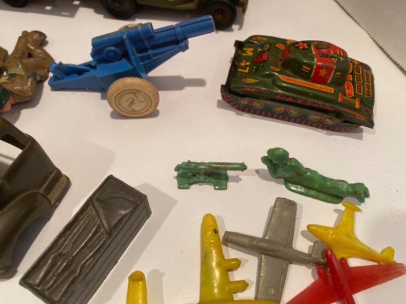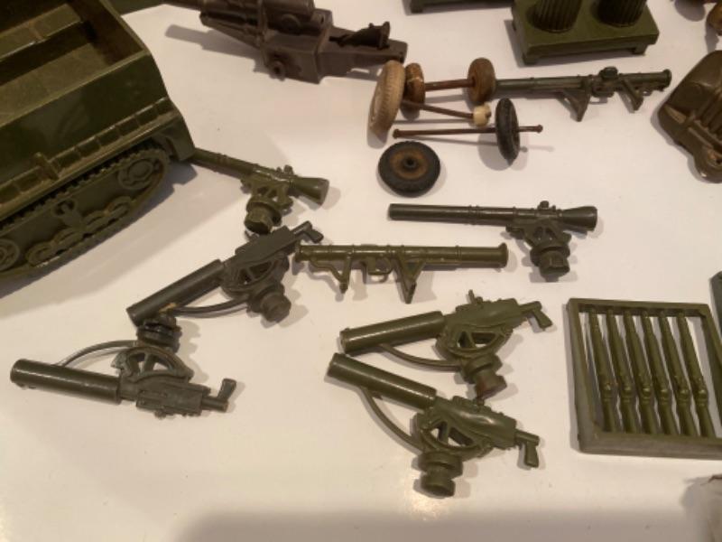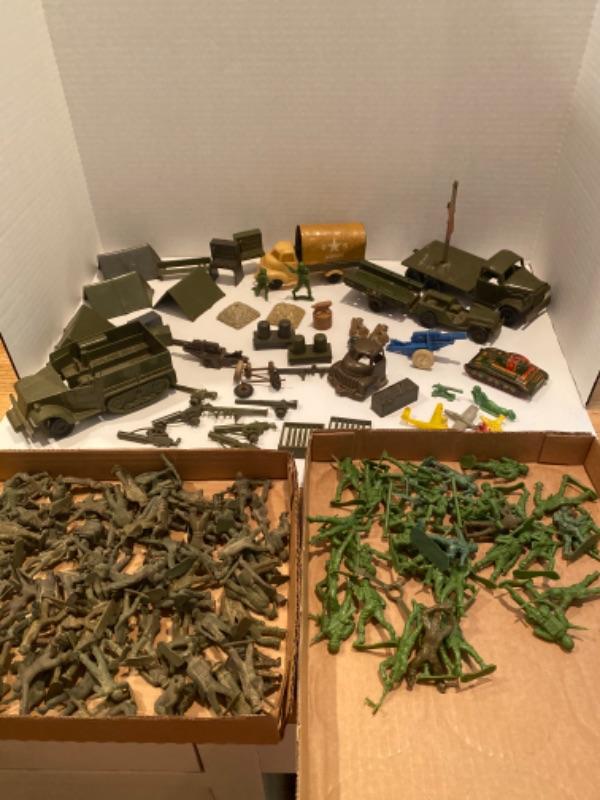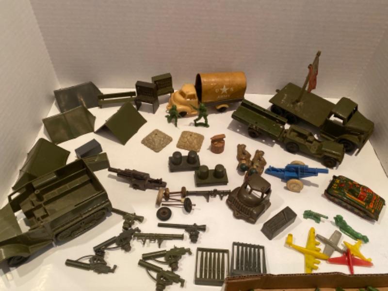 Lot of Antique Army Toys with trucks and small 1” green army men