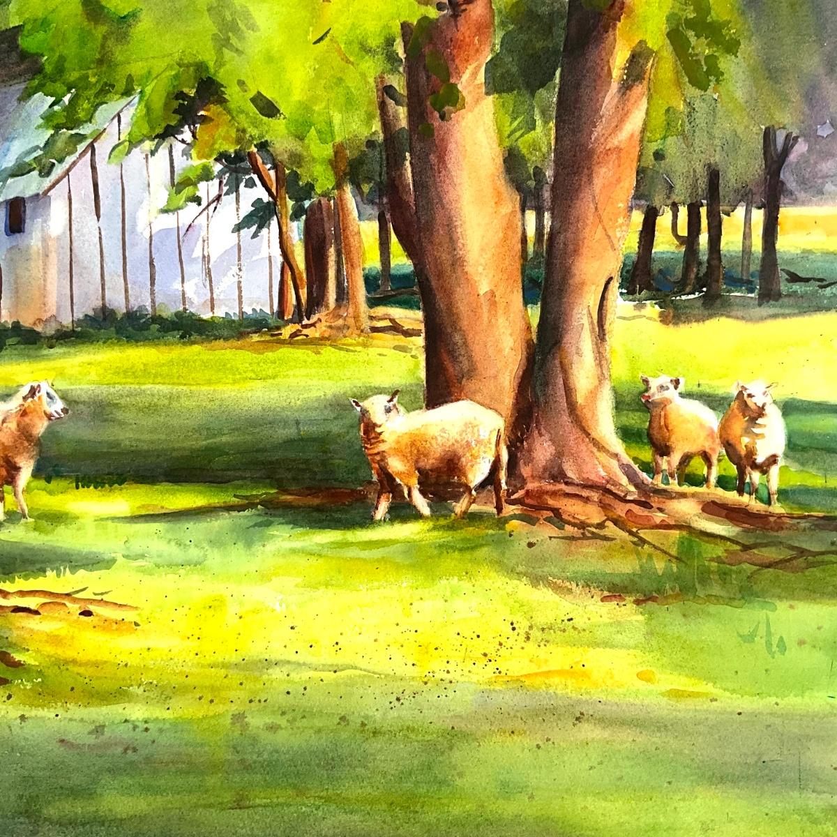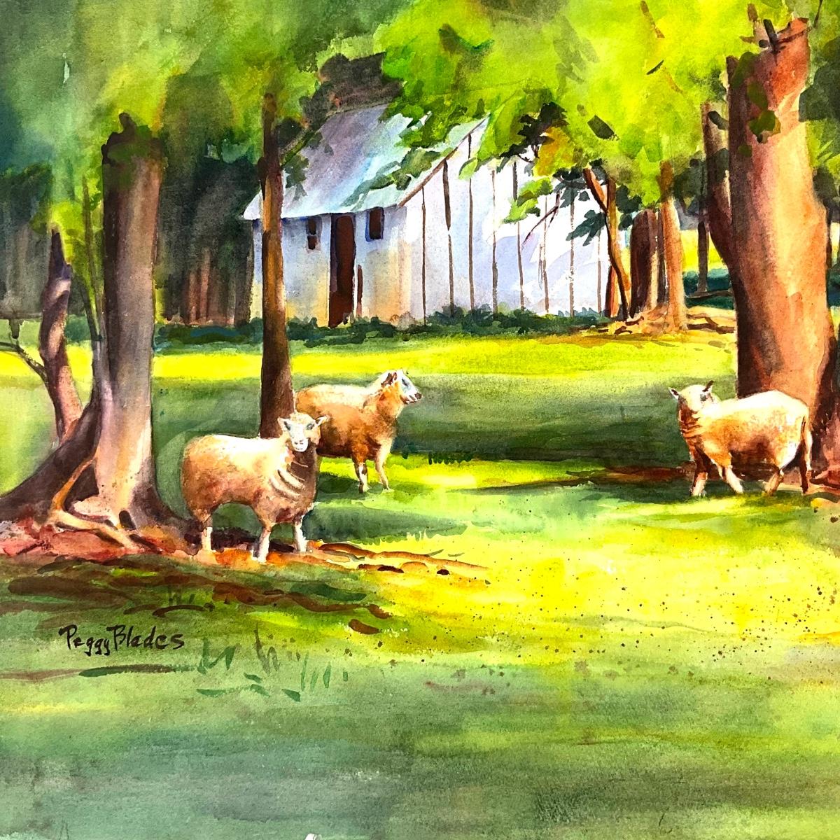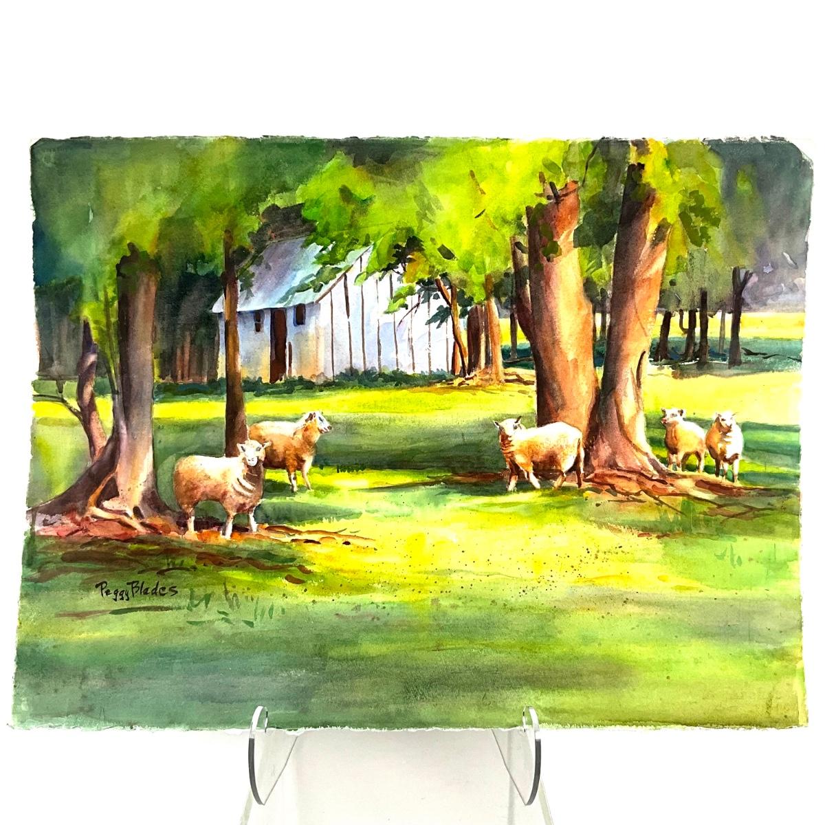 605 Original Watercolor of Sheep in Field by Peggy Blades