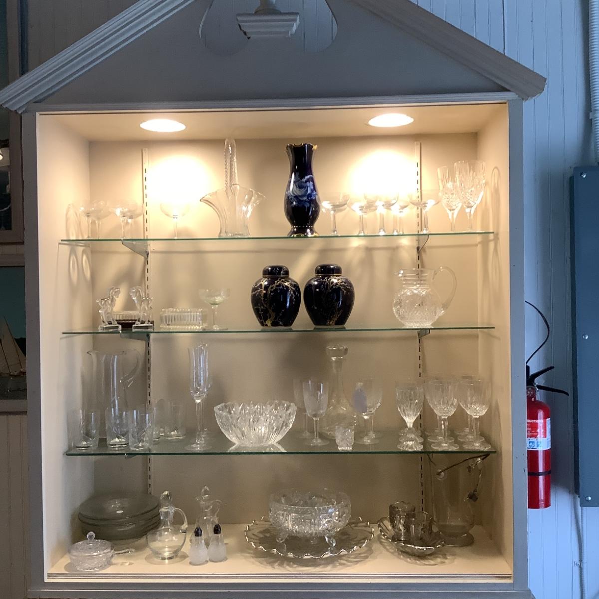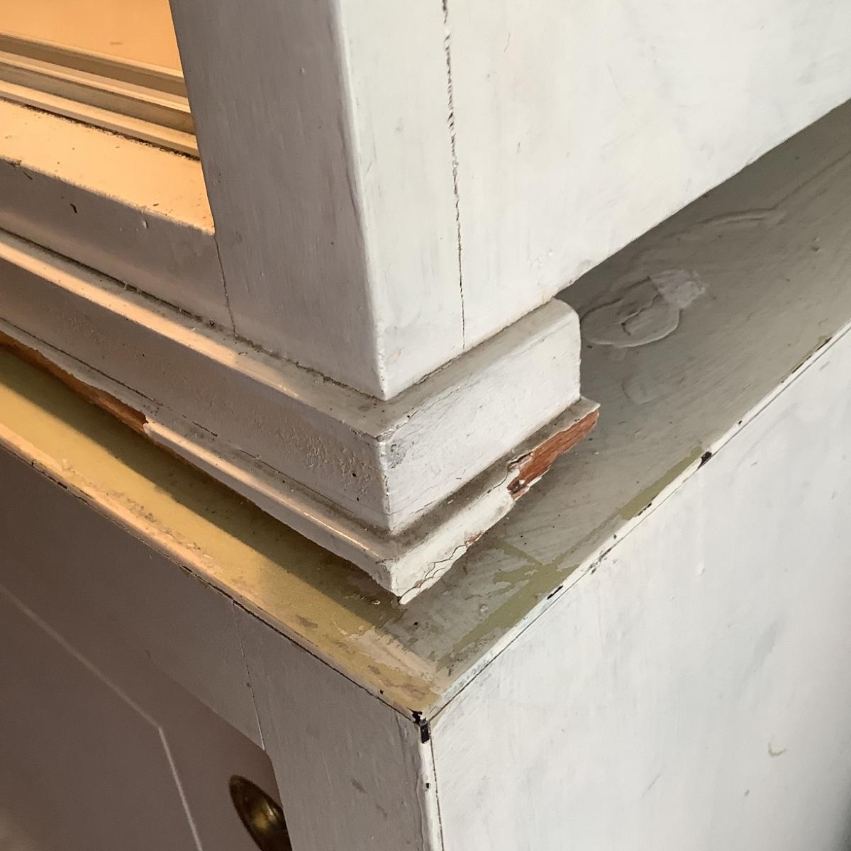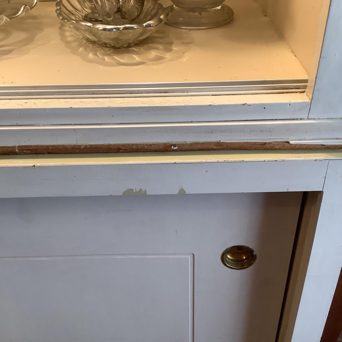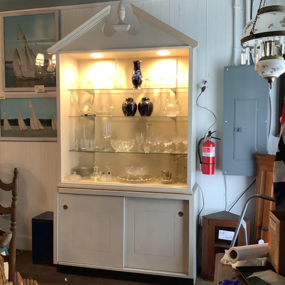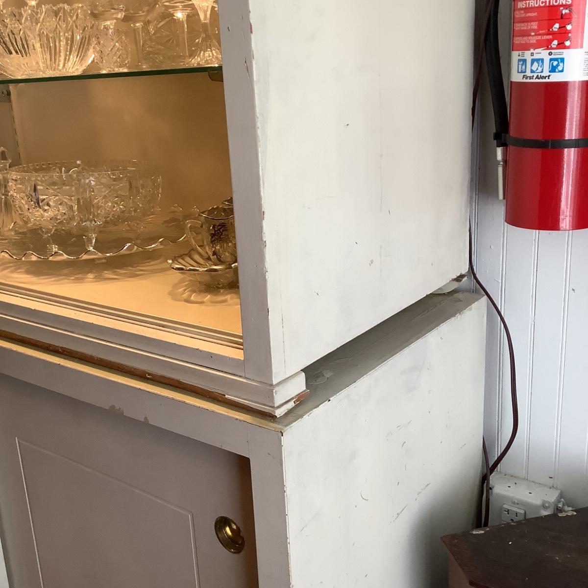 Vintage Display Cabinet Painted White. Top and bottom are two separate pieces. Bottom doors are little hard to slide open, from top has some damage, see pics. Qty 3 glass shelves, adjustable-shelves are 9.75"D