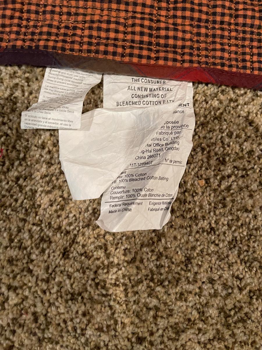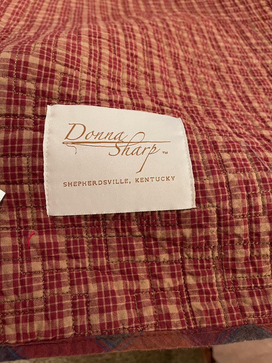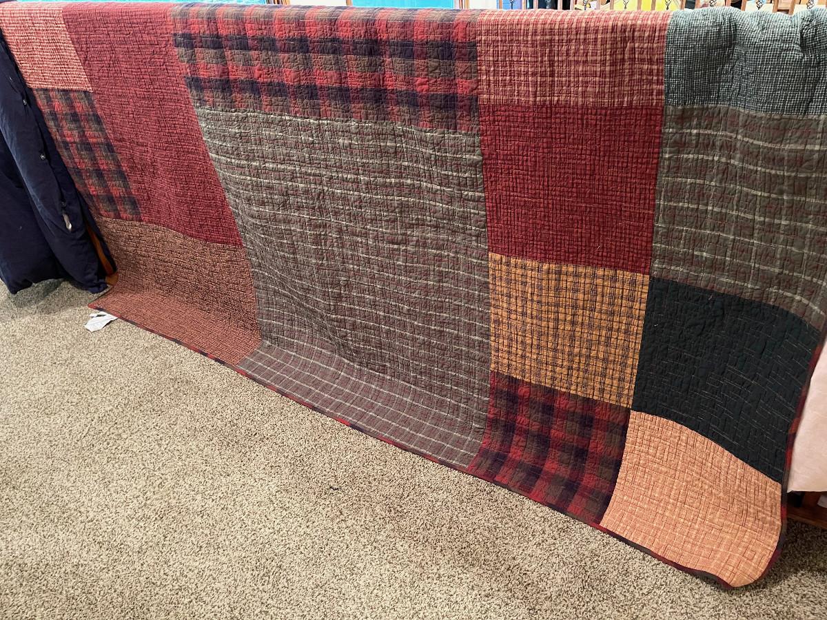 #606  King Plaid Quilt - Browns, Blues, Green Patches Machine Made