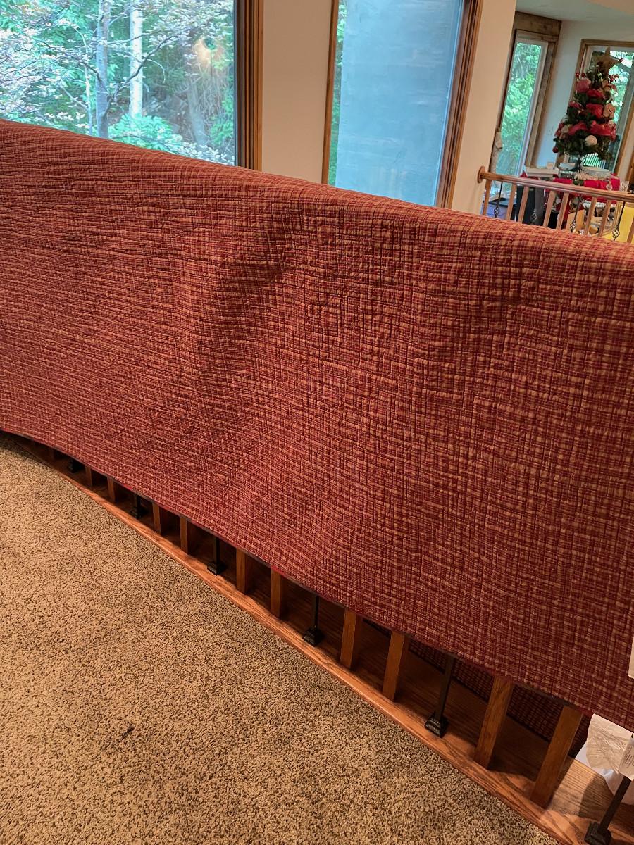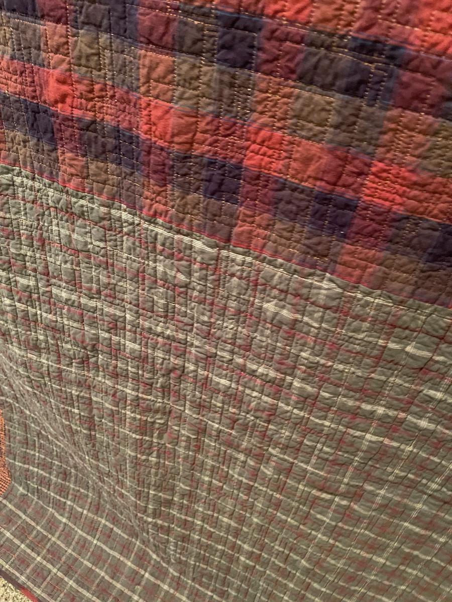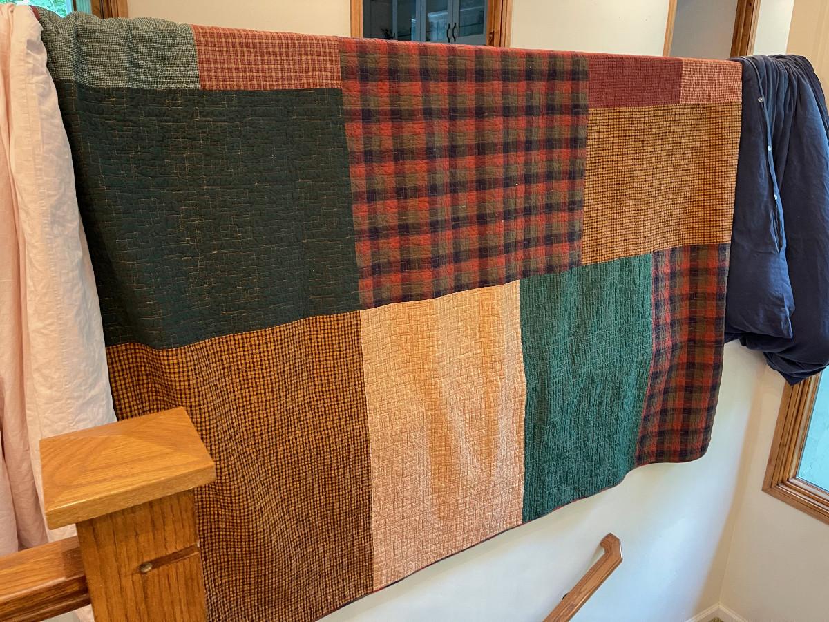 #606 King Plaid Quilt - Browns, Blues, Green Patches Machine Made