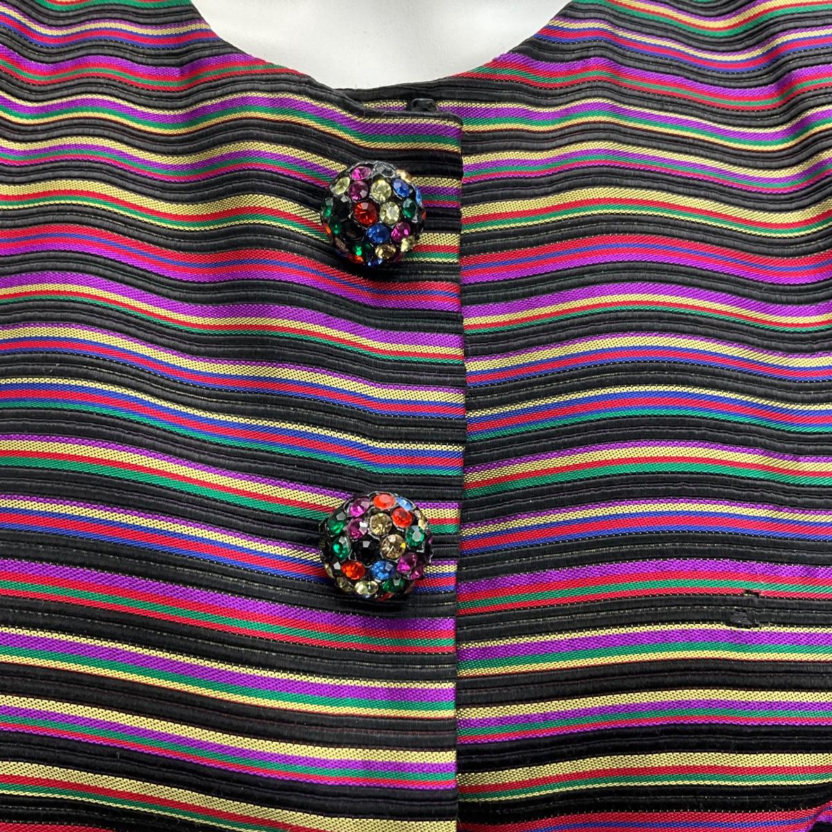 Blazer/Jacket is fully lined, silk blend, dazzle buttons, ribbon design. It is a size 10 and measures 18" from armpit to armpit, 28" overall length. The pants are by Silk Principe, size 8 and they measure 14" from hip to hip when flat, 38" overall length.