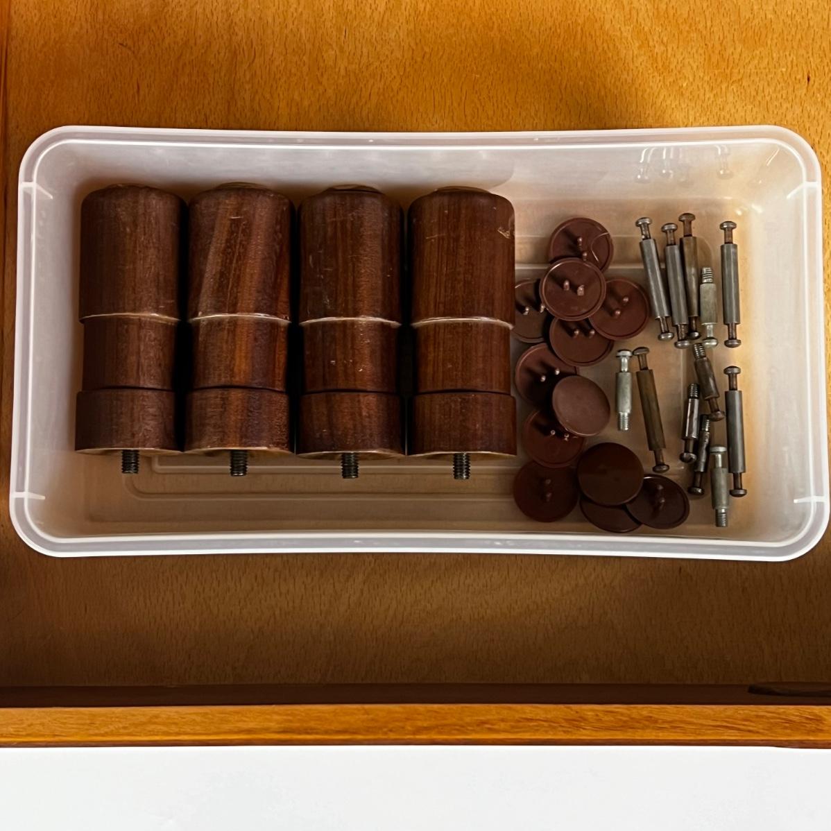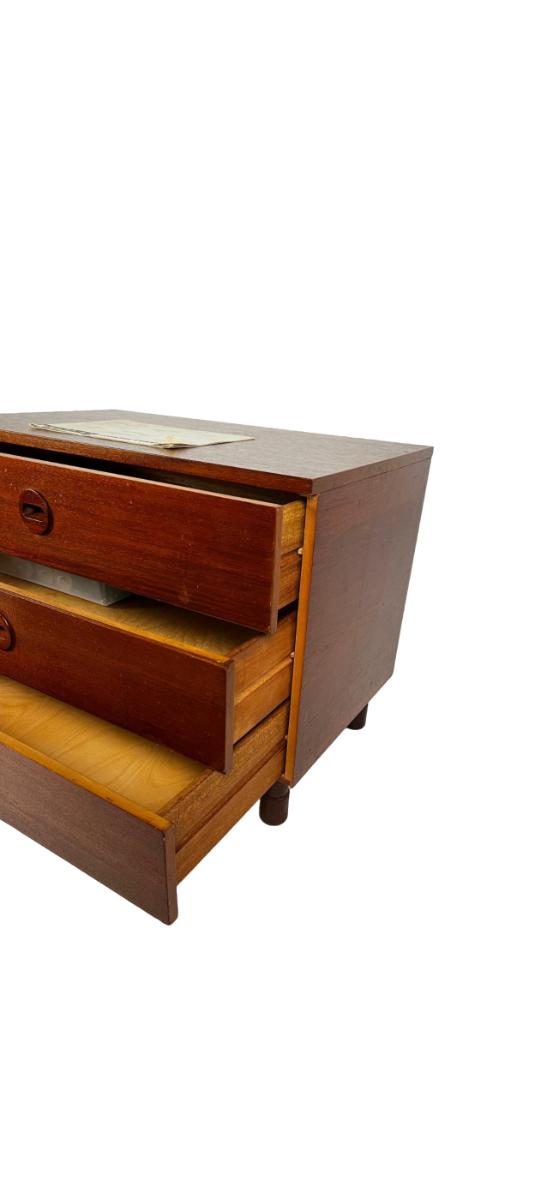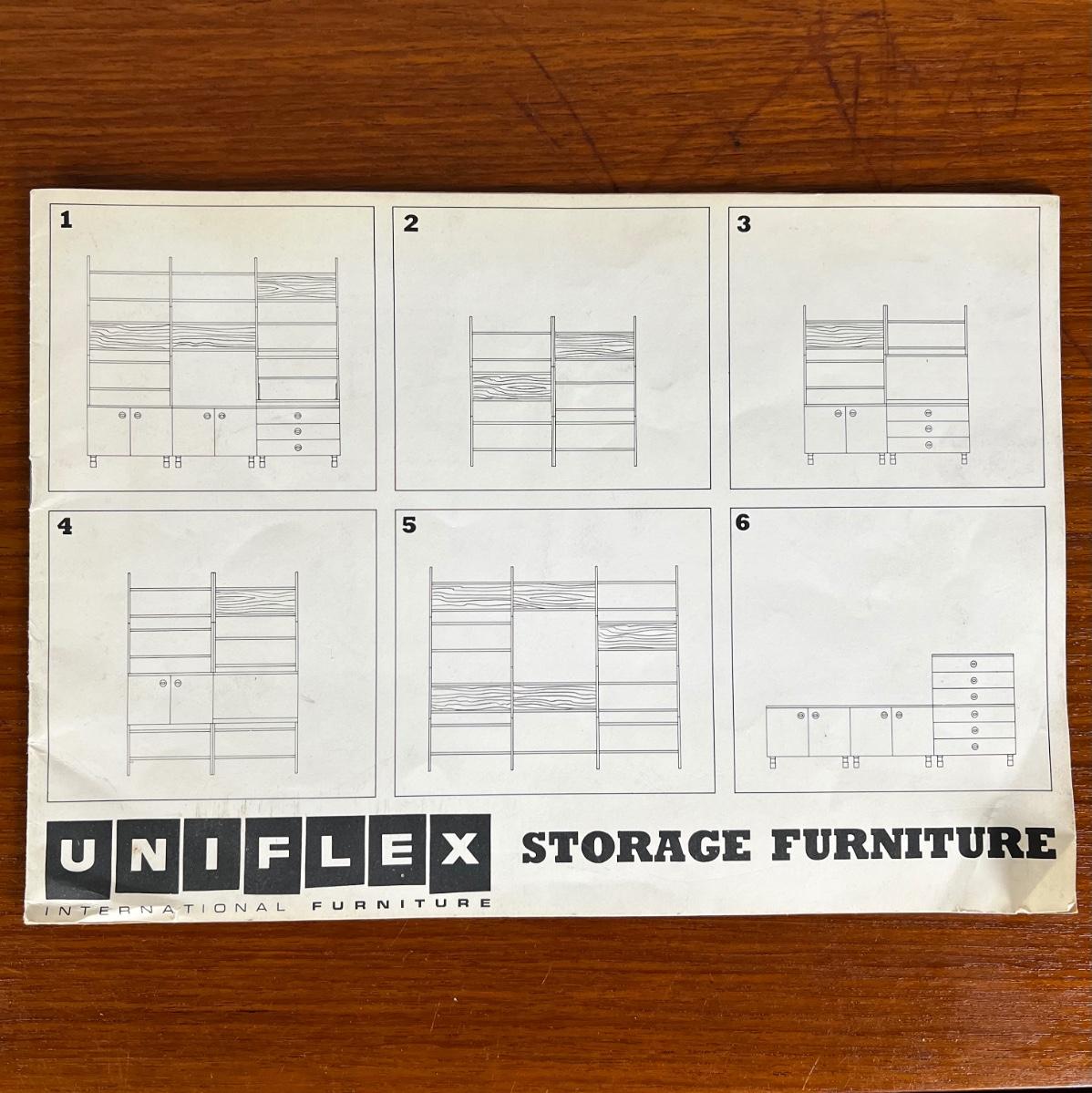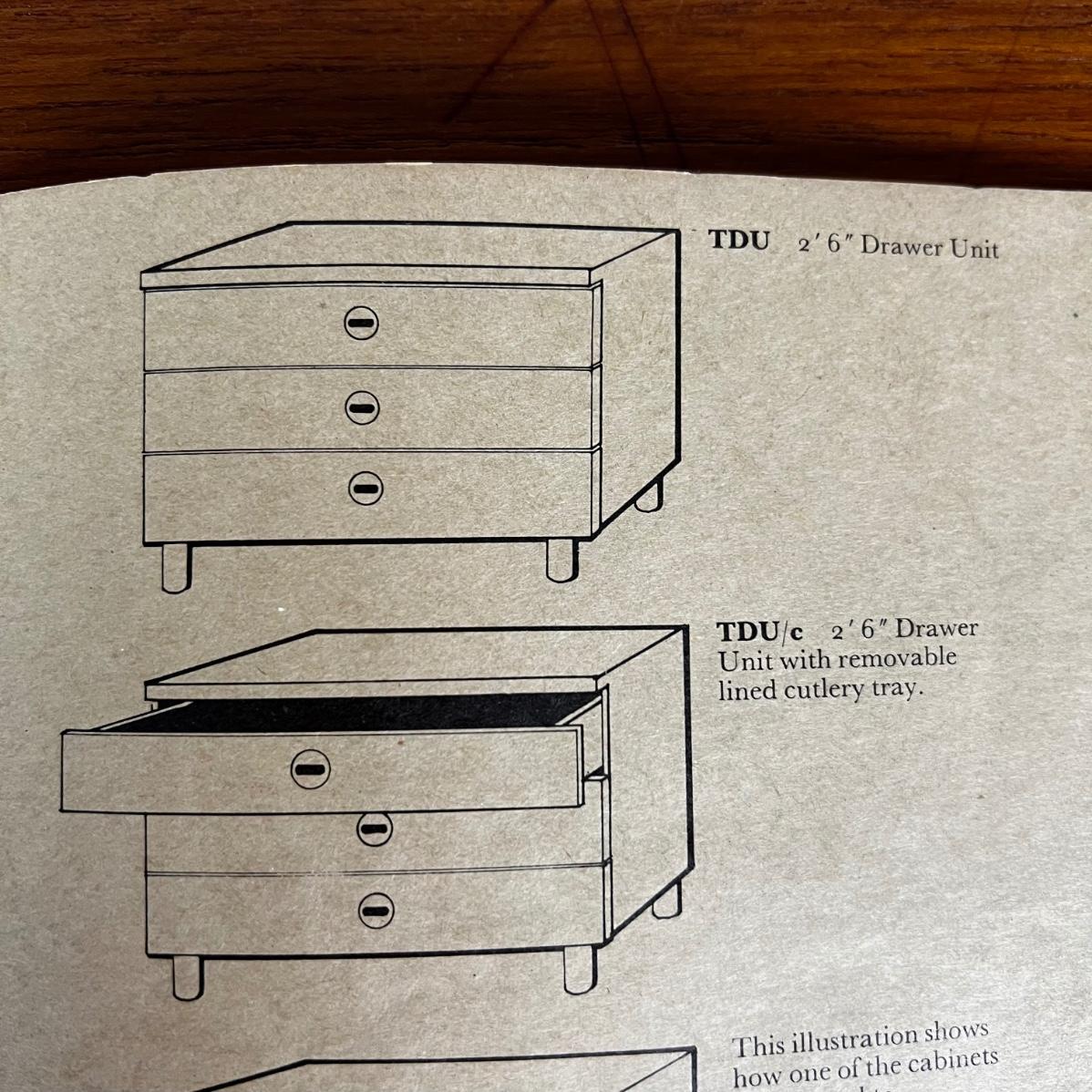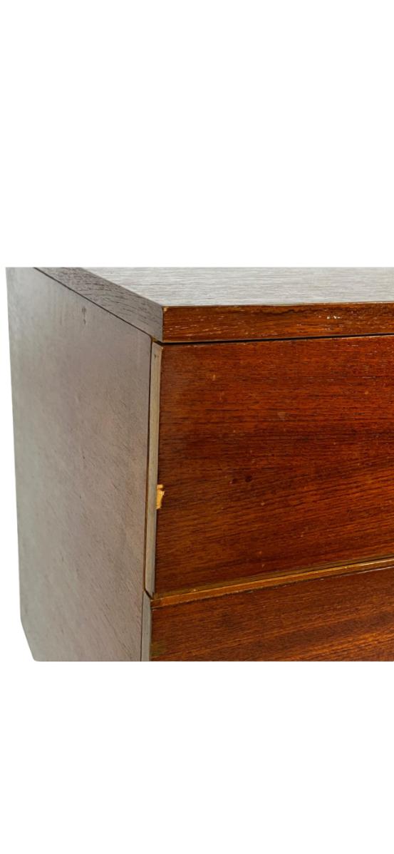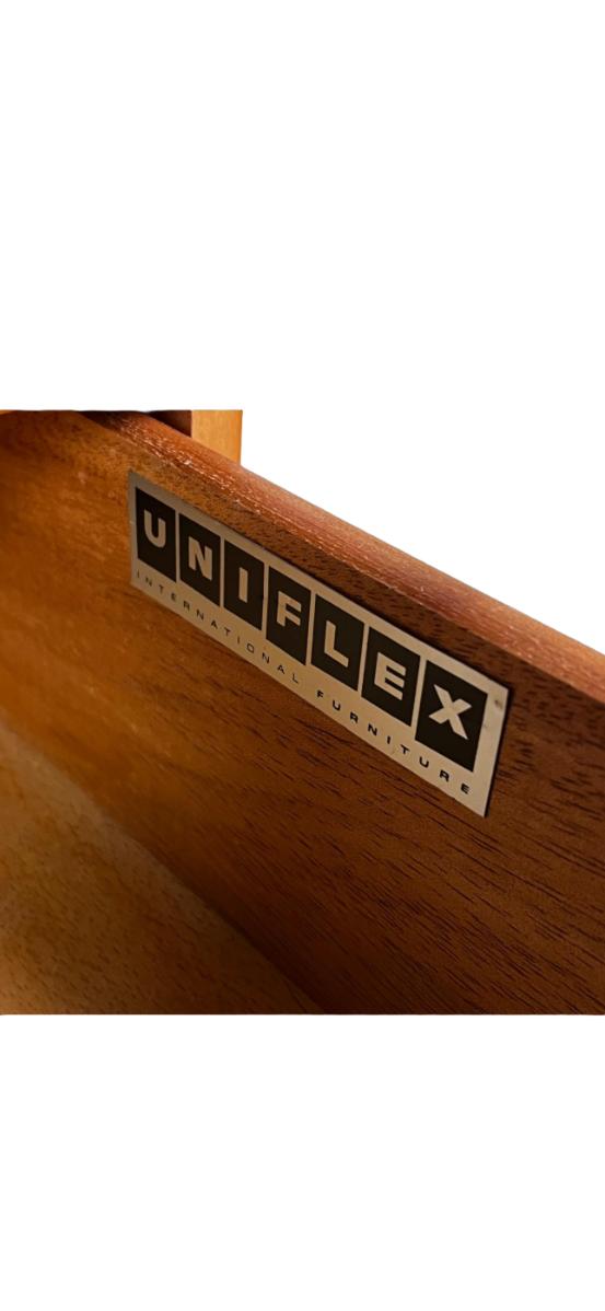 This mid century furniture was made by Uniflex International Furniture and it was originally a piece to a large storage furniture set, its model part was TDU and it was considered a drawer unit. Inside the chest comes with additional feet and screws that would belong to the other models.