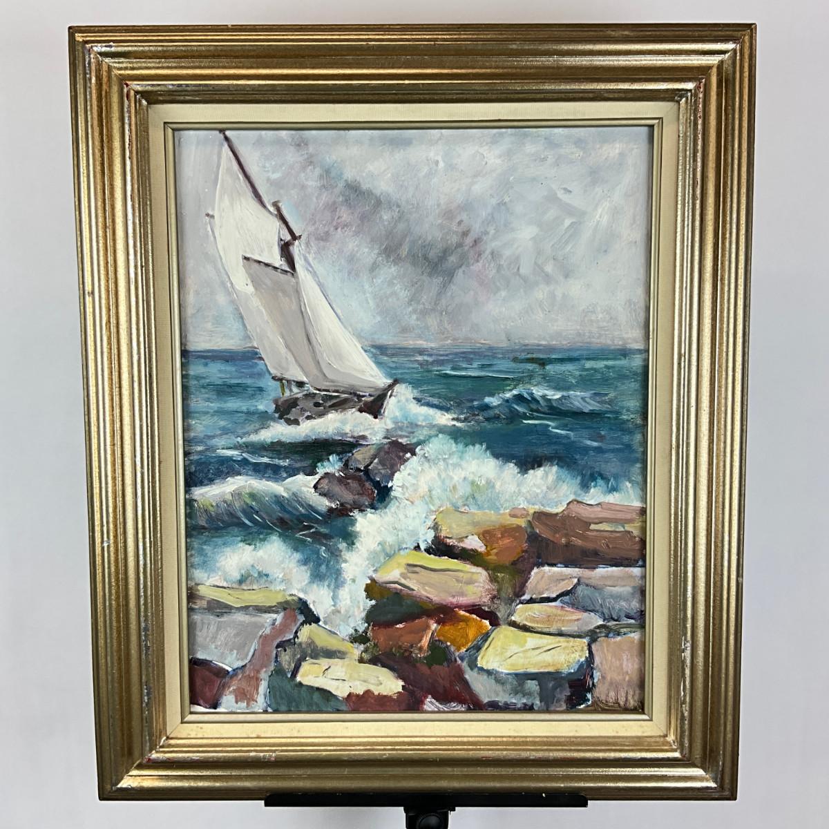 608 Oil On Board Sail Boat With Rocks Scene