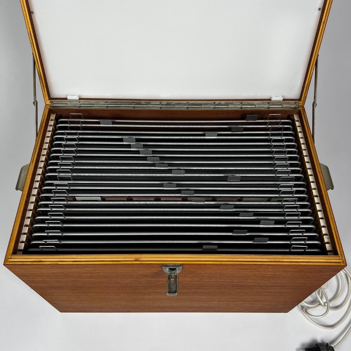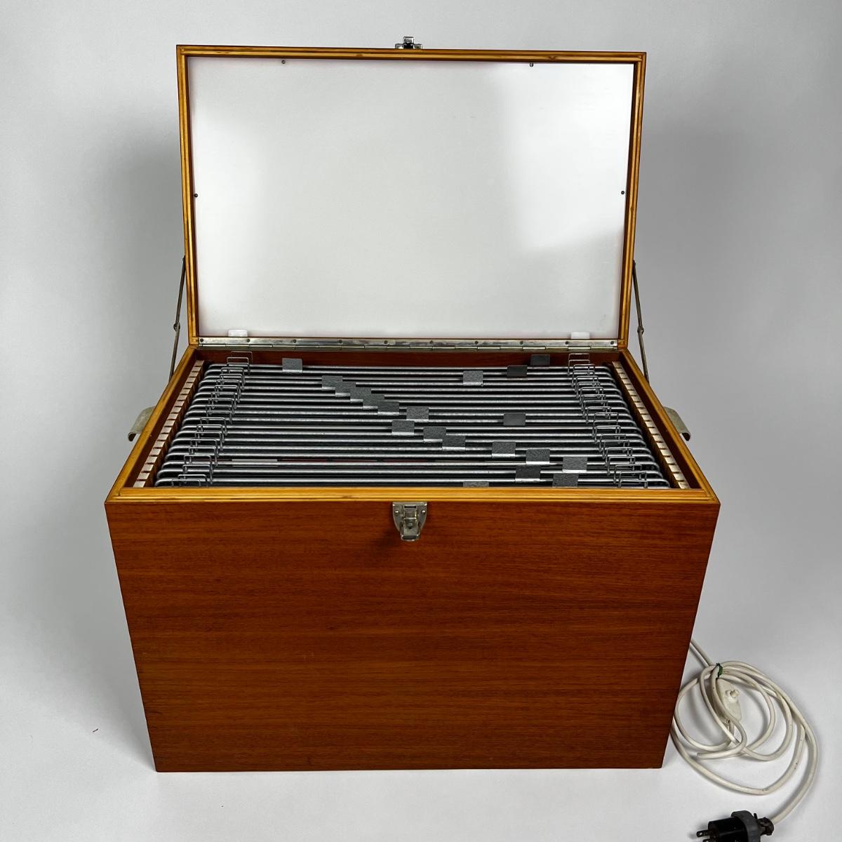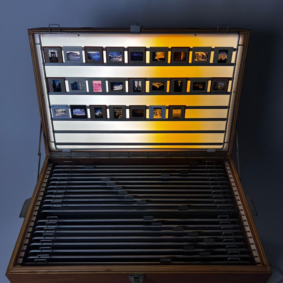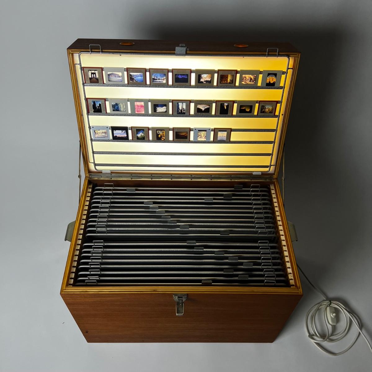 This light box top has an installed light that you can plug in with a ventilation for heat, you then place photo slides into the metal racks and place it in front of the lighting area which makes the photos visible.