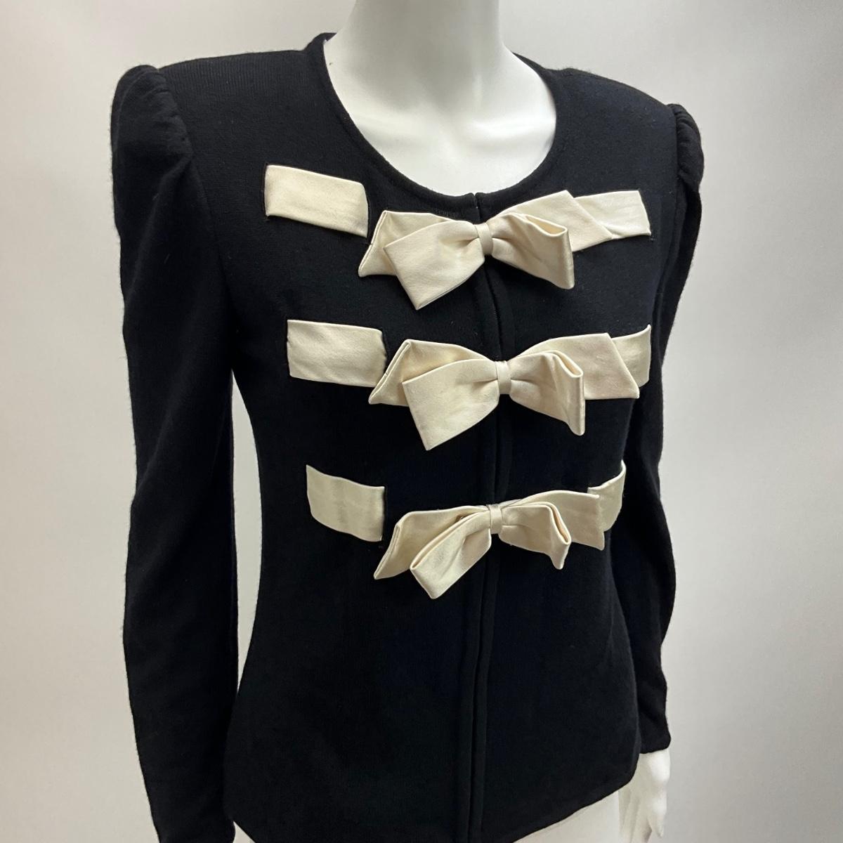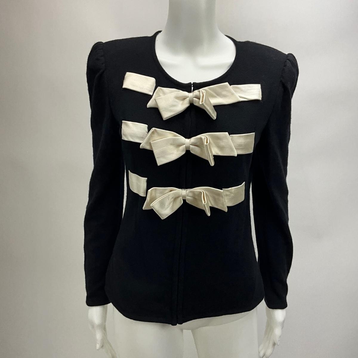 The black cardigan with white ribbon satin design, size small, full zip, with shoulder pads, measures 18" from armpit to armpit, 24" overall length, sleeve is 22" from shoulder to cuff.