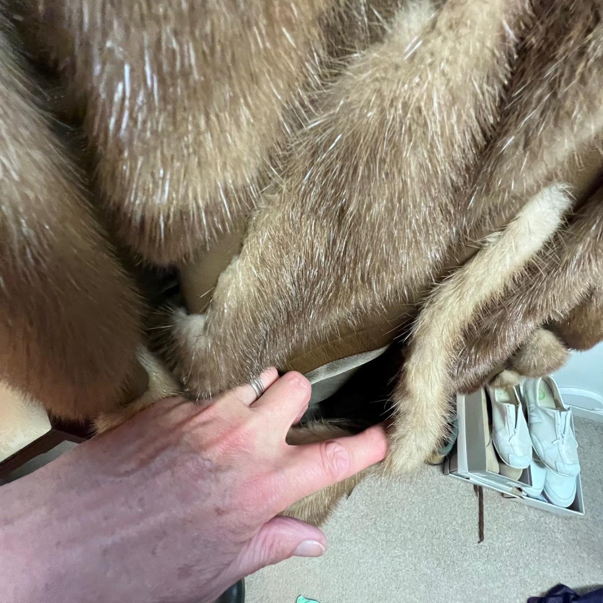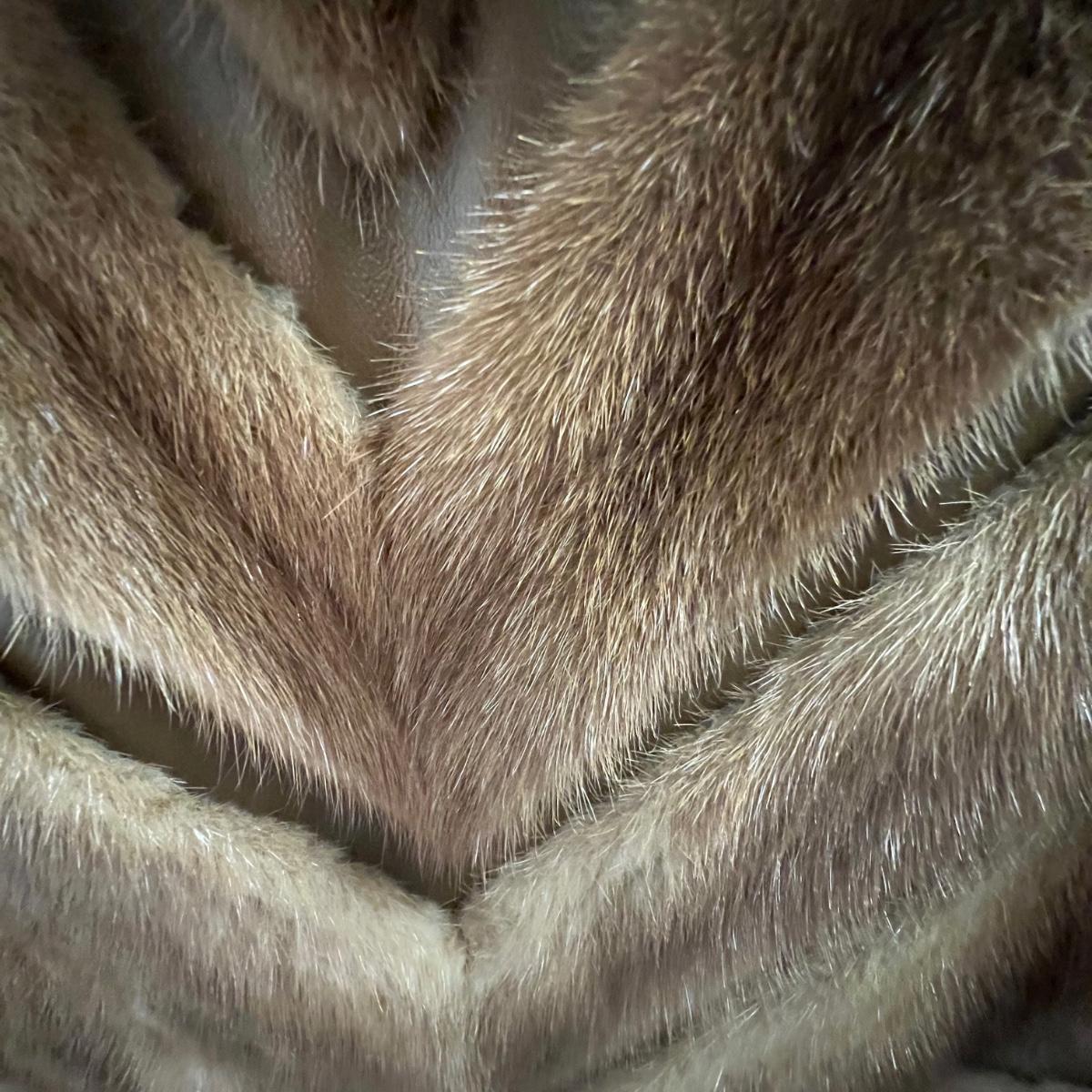 This gorgeous geometric patterned fur coat has been very carefully looked after and is in excellent condition. It has a silk lining and a built in belt. There is no size label but it will fit size small or medium.