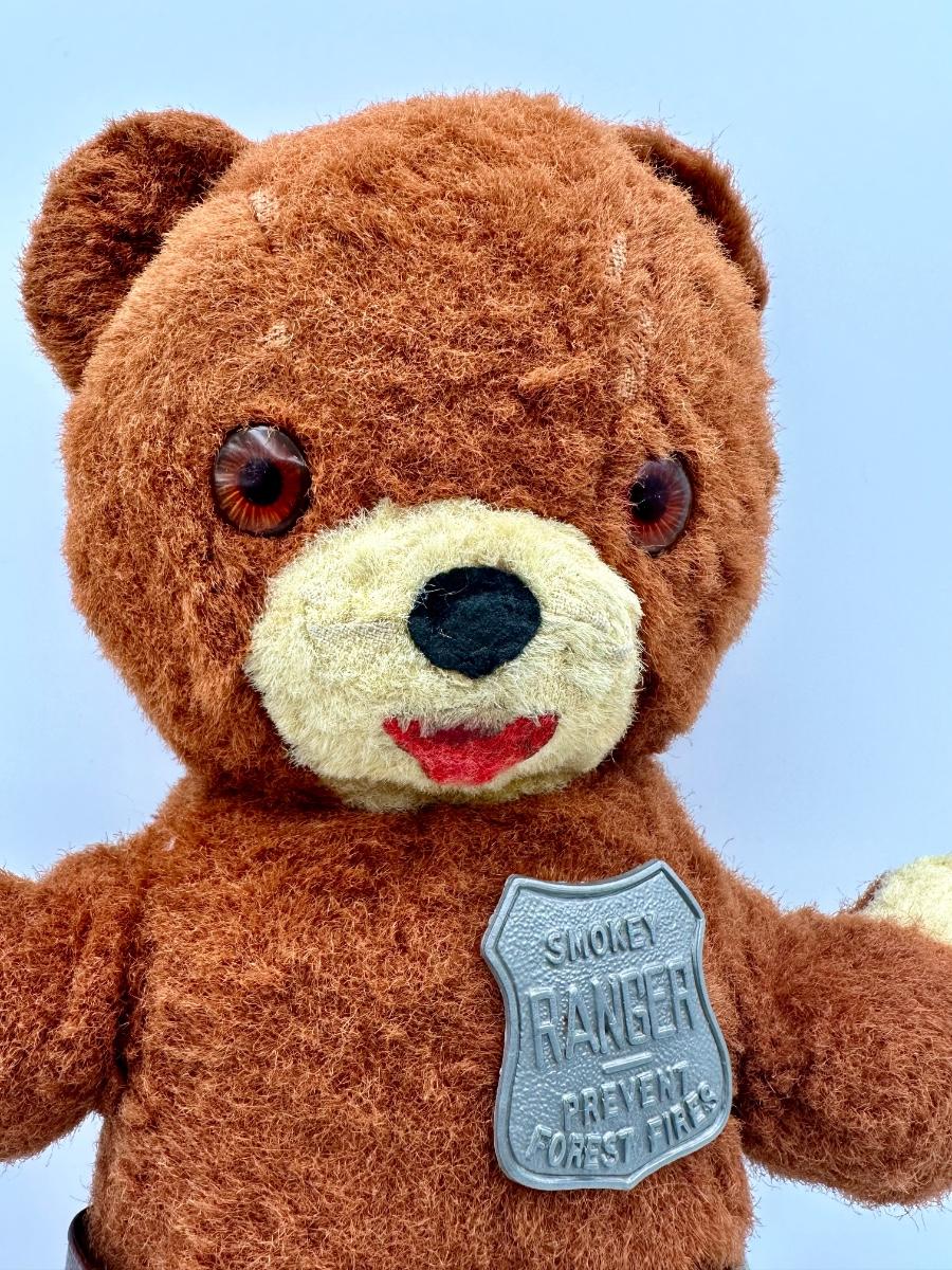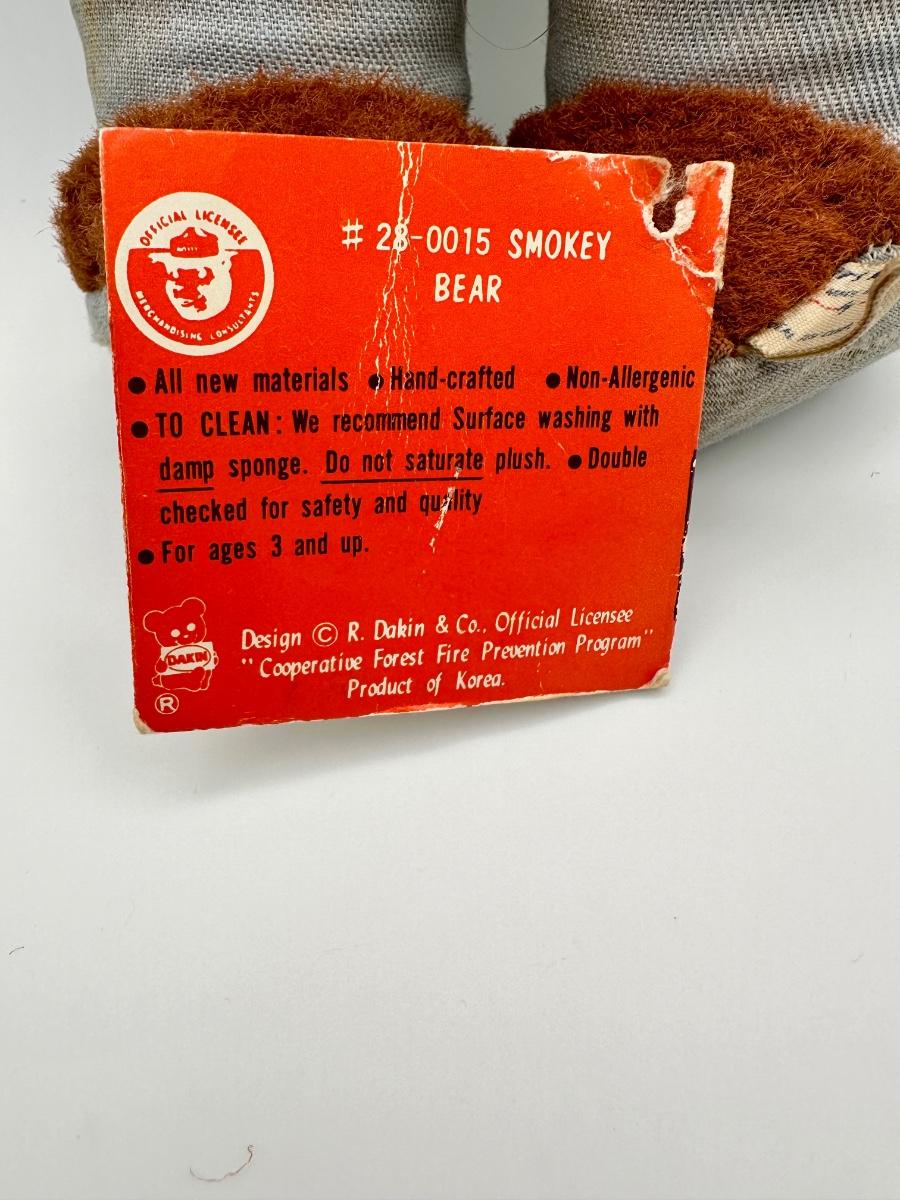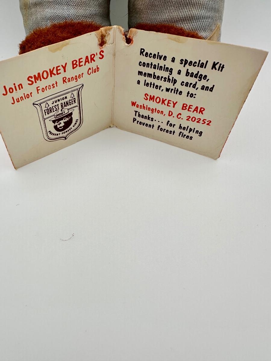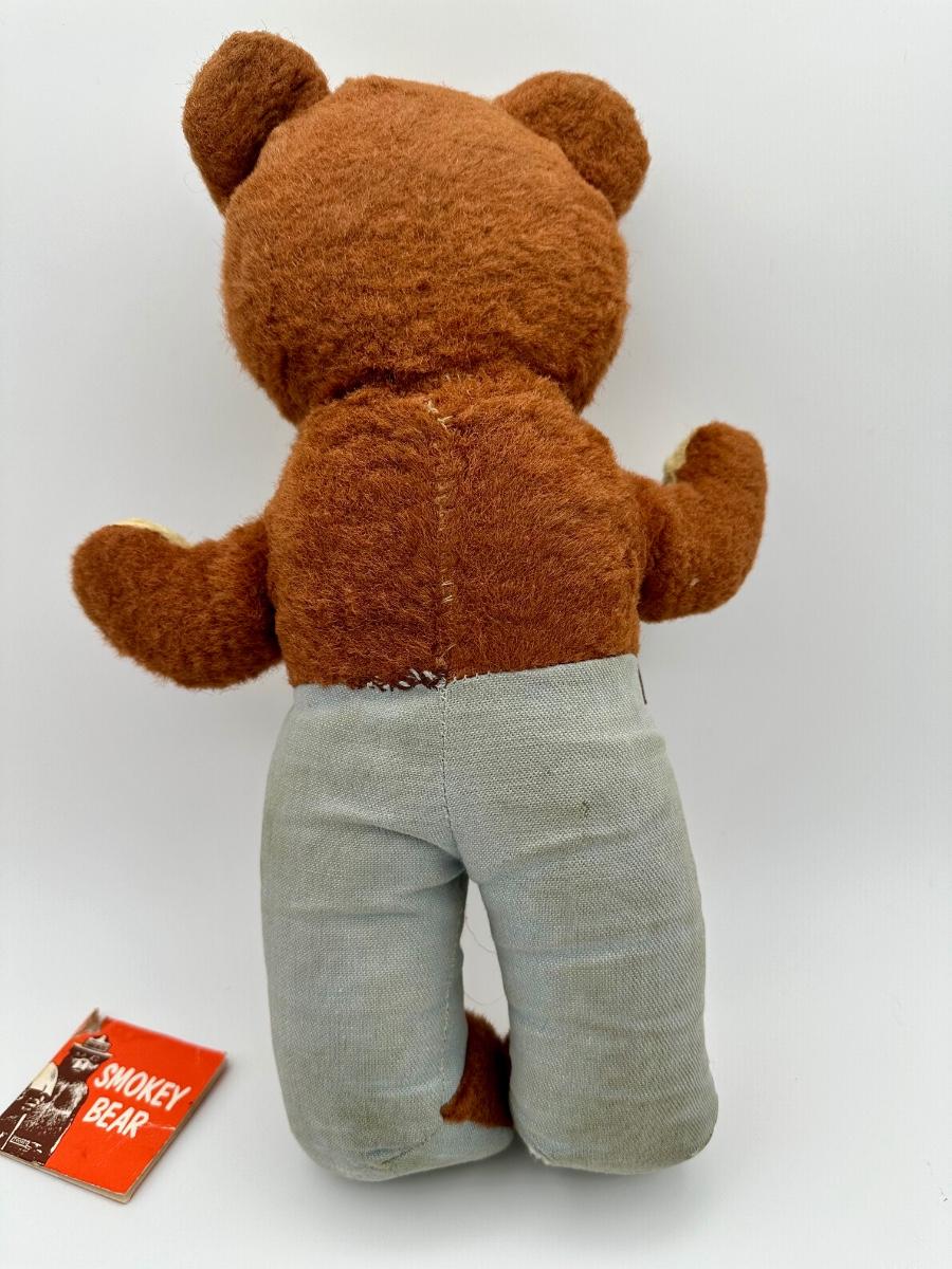 1960’s Smokey Bear with badge, belt and tag. His jeans could use a cleaning, but just worn, no rips or tears. Stands 12” tall. This is a vintage item and sold as memorabilia for collectors. It might not conform to regulatory standards of today, so is not suitable for children and is not sold as a toy.