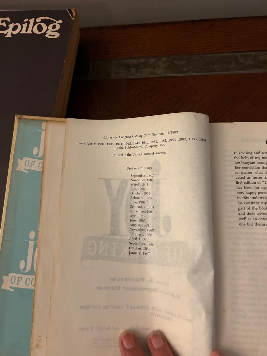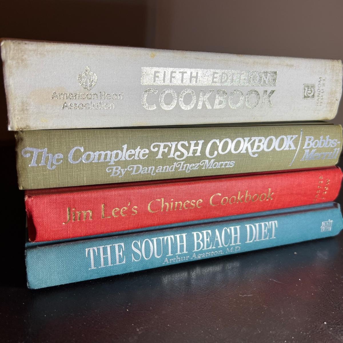 Eight cookbooks mostly from the 1960’’s - 1970’s with a few that are more recent. See images for full inventory and note the Joy of Cooking has red tape holding its spine together.