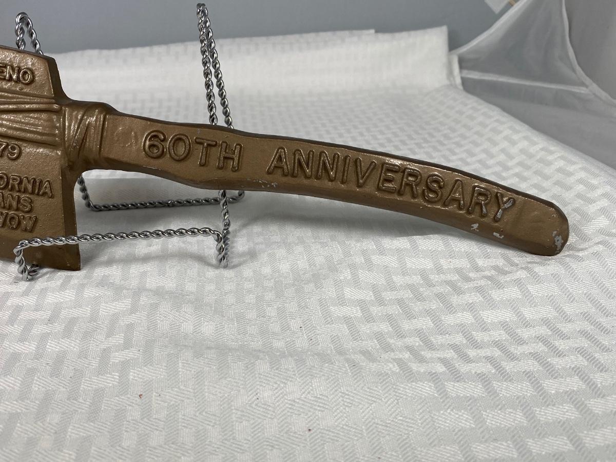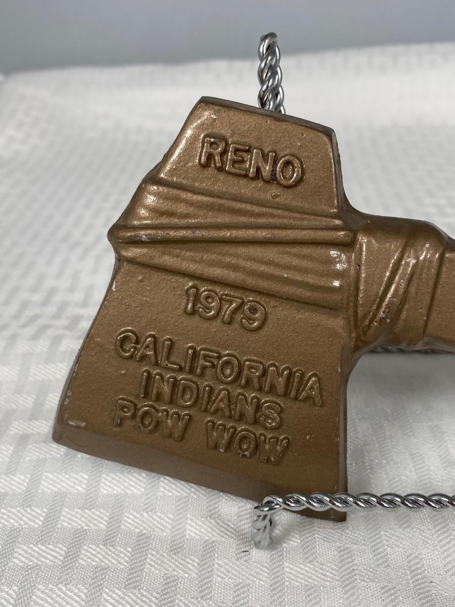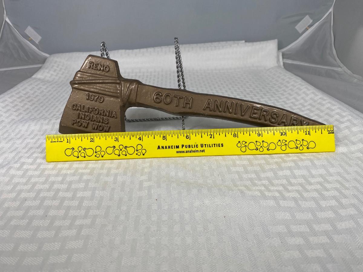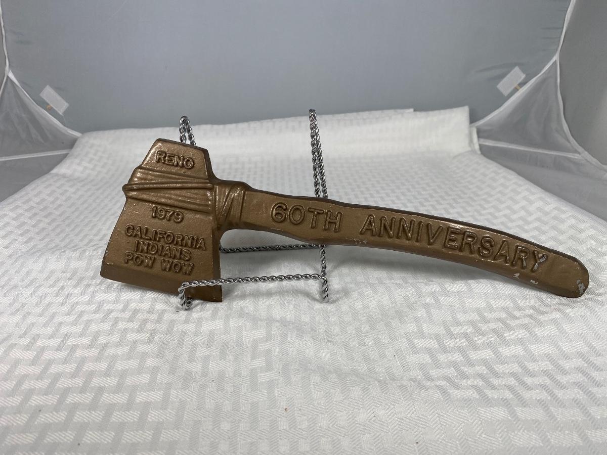 60th Anniversary Cast Painted Metal Hatchet 1979 California Indians Pow Wow Plaque. About 12" length.