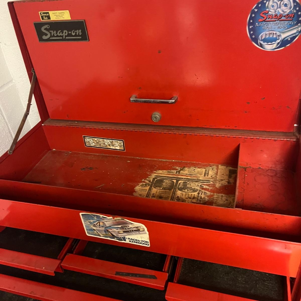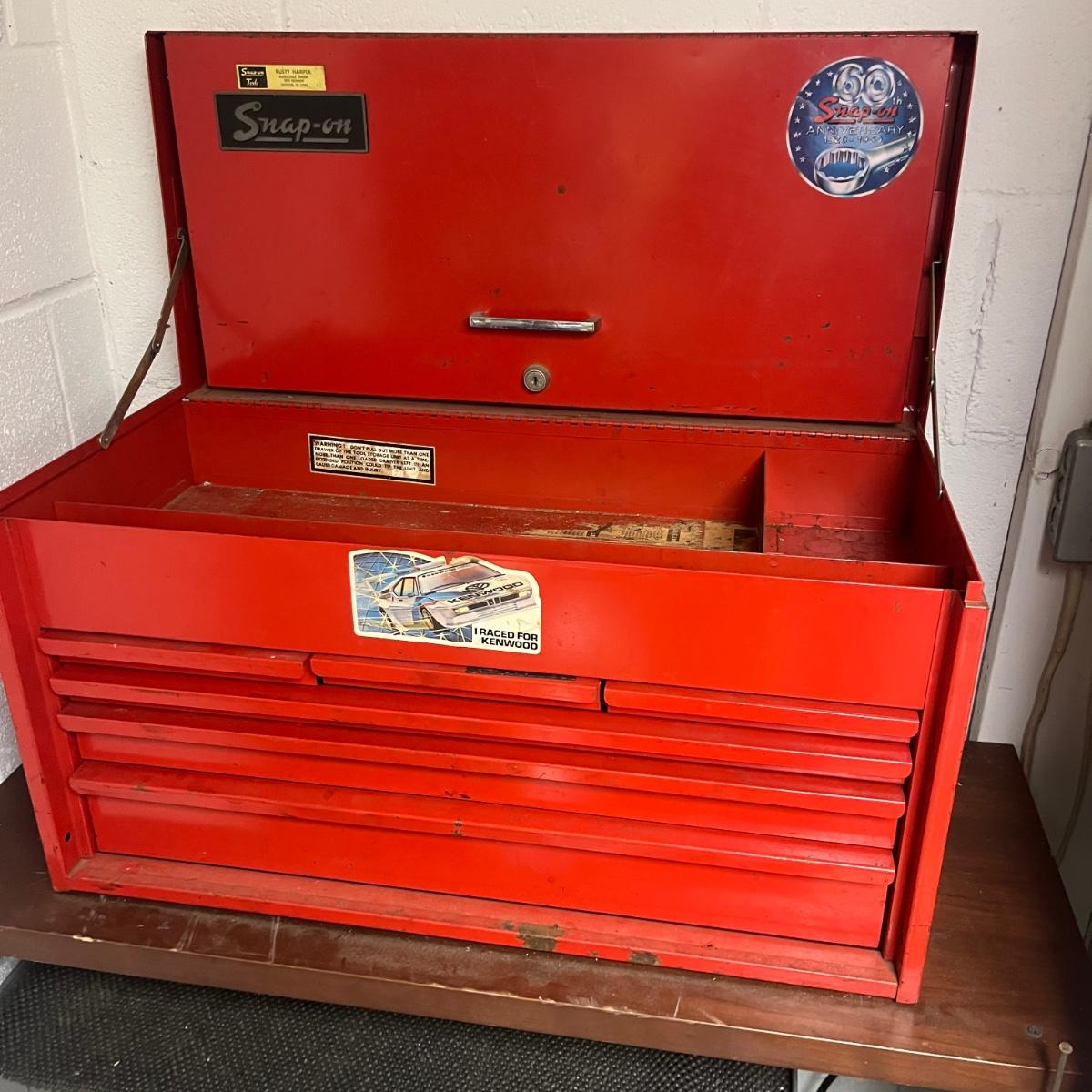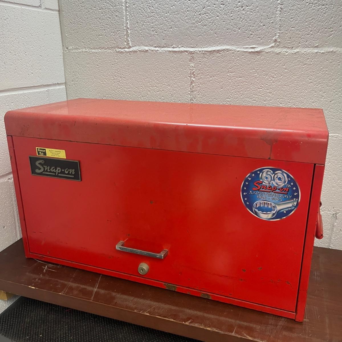 Lot includes a metal six drawer 60th Anniversary Snap On toolbox. Box measures 26” x 12” x 15”H.