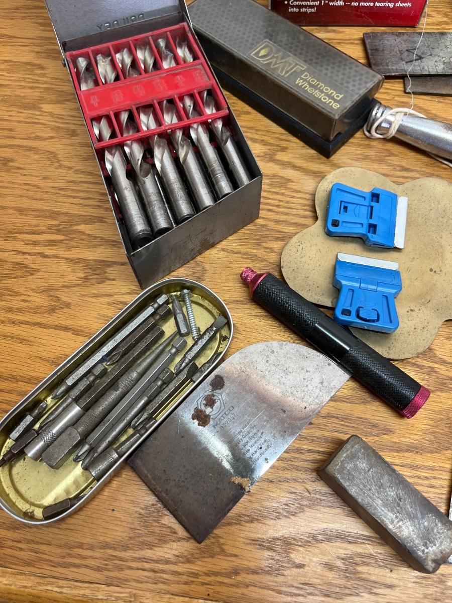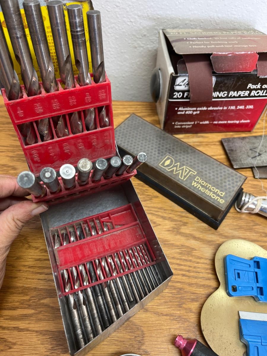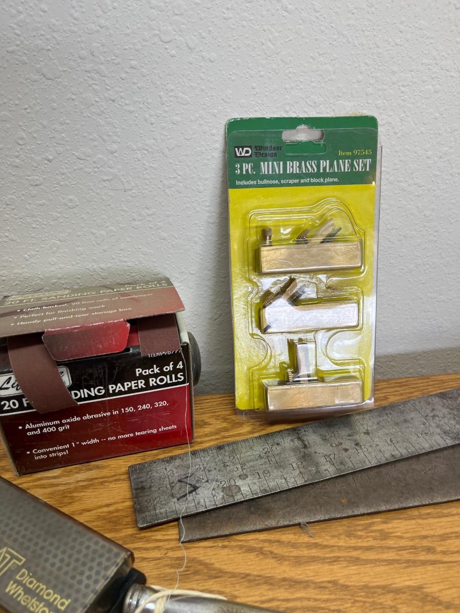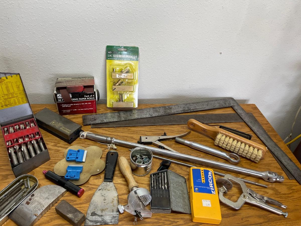 Drill bits, levels, sanding paper rolls, brass plane set, etc