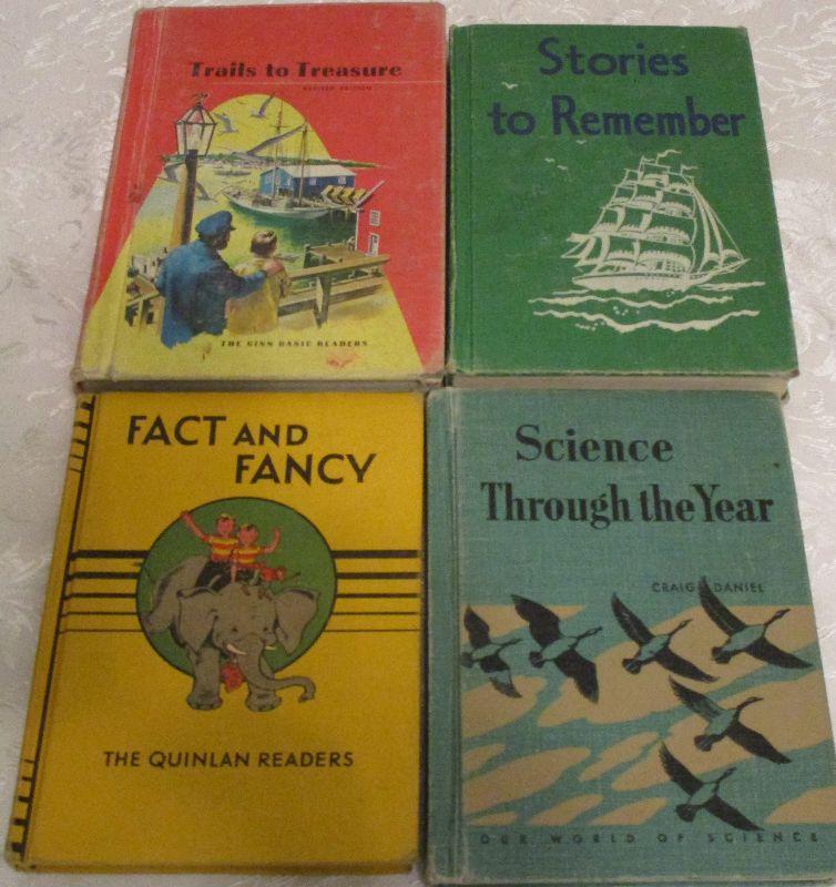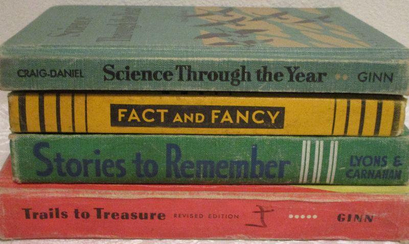 Science Through the Year 1950; Stories to Remember 1951 edition; Fact and Fancy, The Quinlan Readers 1953 edition; Trails to Treasure, 1961 edition; school books