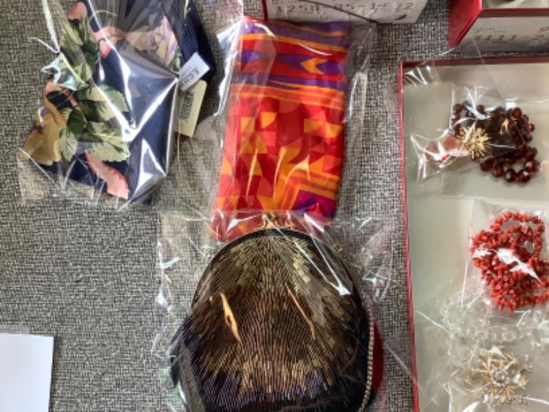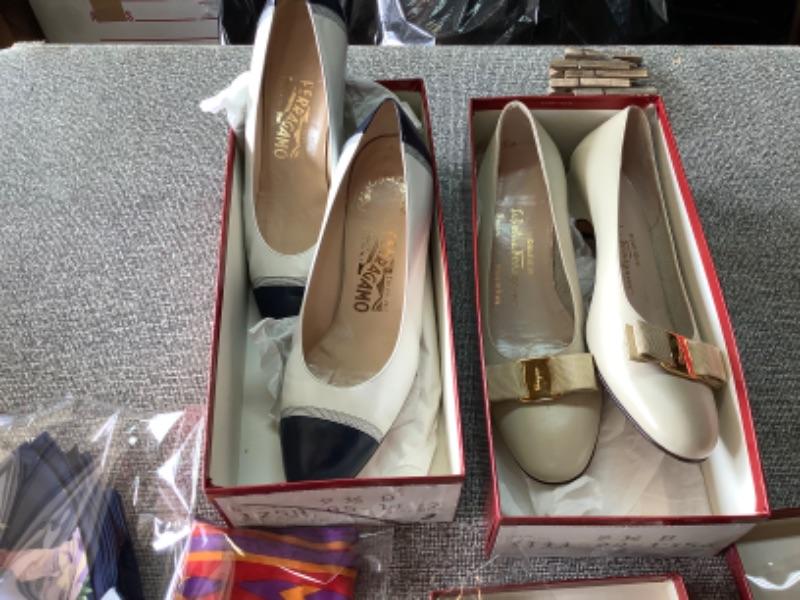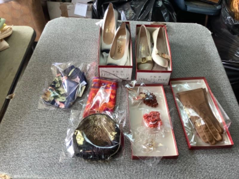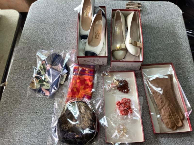 Ferragamo shoes size 9.5, beaded purse, new gloves, scarves