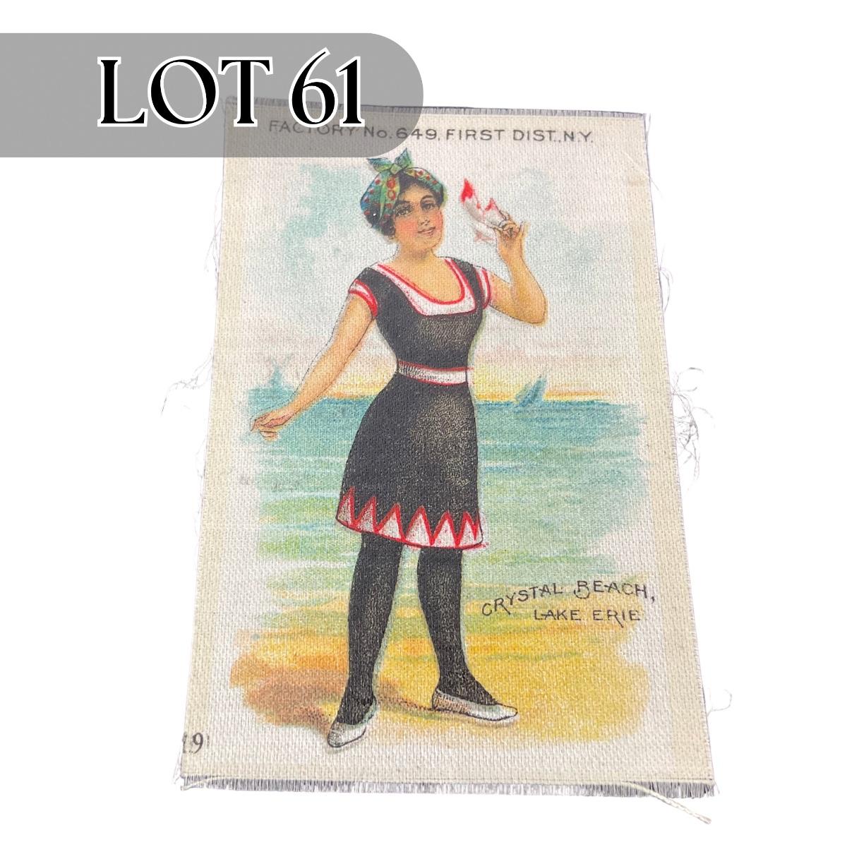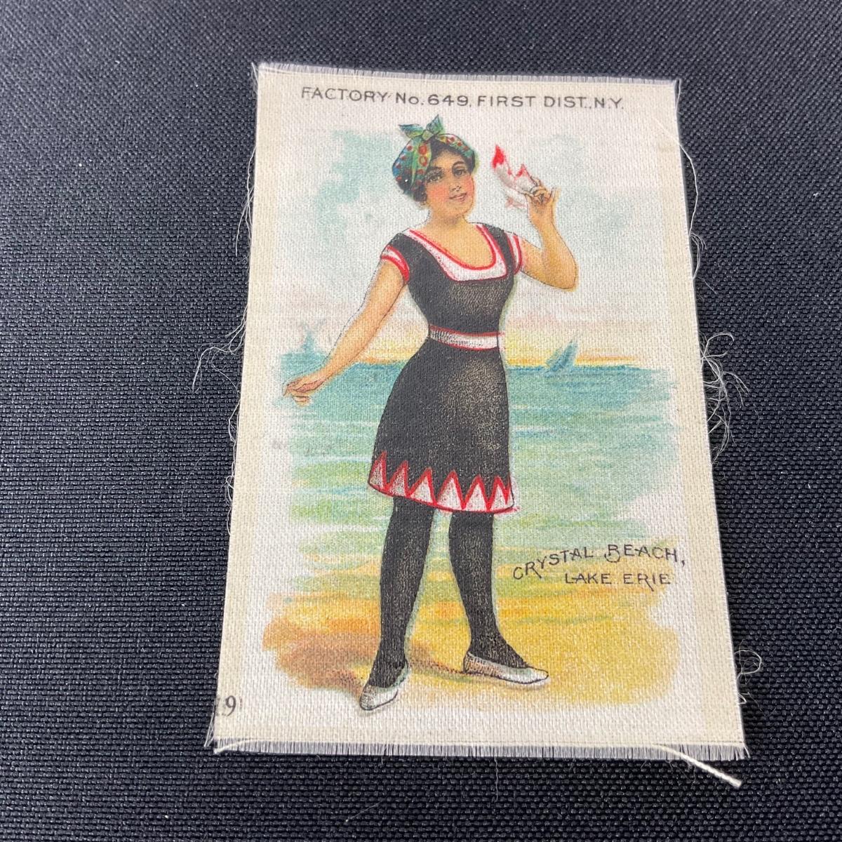 One antique Edwardian bathing beauty tobacco silk. #19 Crystal Beach Lake Erie silk. Please see photos for details and condition. Any condition statement is given as a courtesy to a client, is an opinion, and should not be treated as a statement of fact. Reference to condition written, oral or within a condition report shall not be regarded as a full account of condition and may not include all defects, alterations, or restorations. Absence of a condition report does not imply a lot is flawless or lacking imperfections or damage. Katherine’s Auction & Appraisal Service shall have no responsibility for any error or omission. Returns shall not be accepted on the basis of condition. ::: Shipping is available on this lot. If you require shipping you must let us know at the close of the auction. We will coordinate with you after the item has been won. Shipping fees will include insurance up to or exceeding the value of all items being mailed. If you have any questions regarding this lot please contact the auctioneer either via this website, by direct email or by phone. PICK UP TIMES and other important information can be found in the TERMS and DESCRIPTION of the auction. Please take a look for pertinent information. Thanks!