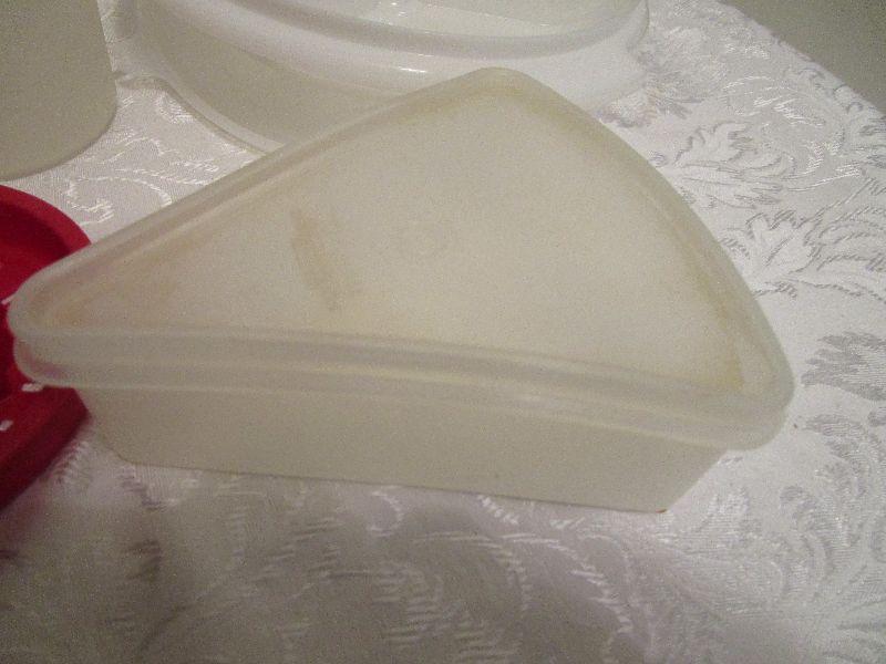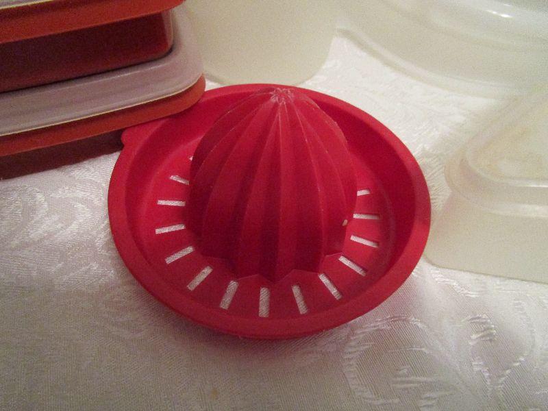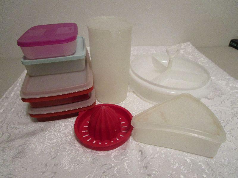 Vintage and Newer Tupperware- Juicer, 1.25 cup container; sandwich container; two- 5"x9"x1.5" container; 1 QT pitcher; Slice of pie container; Small relish dish with lid 8"x1.5";