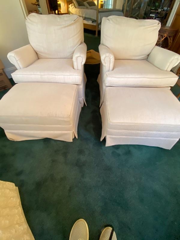 A Pair of “ Best “ White Arm Chairs with Ottomans