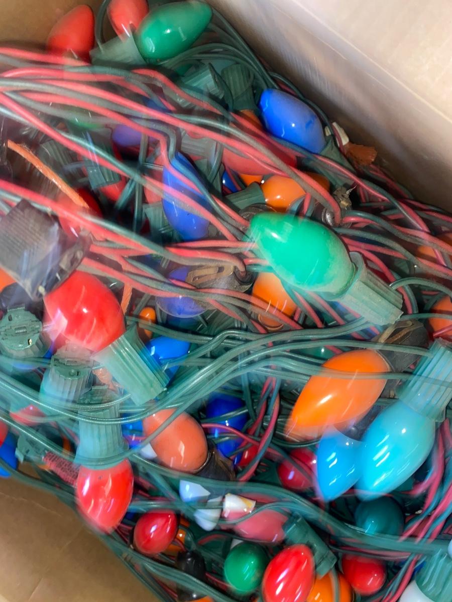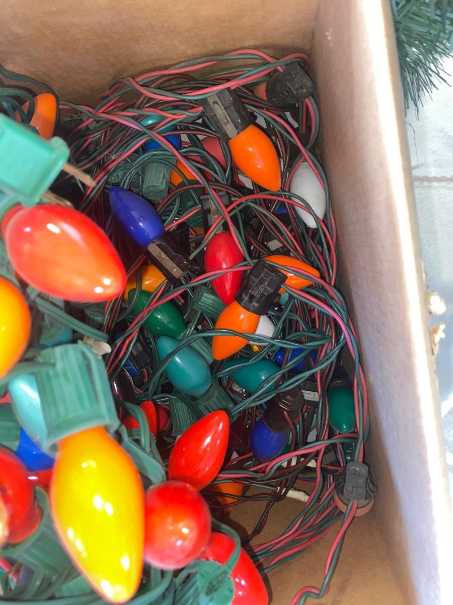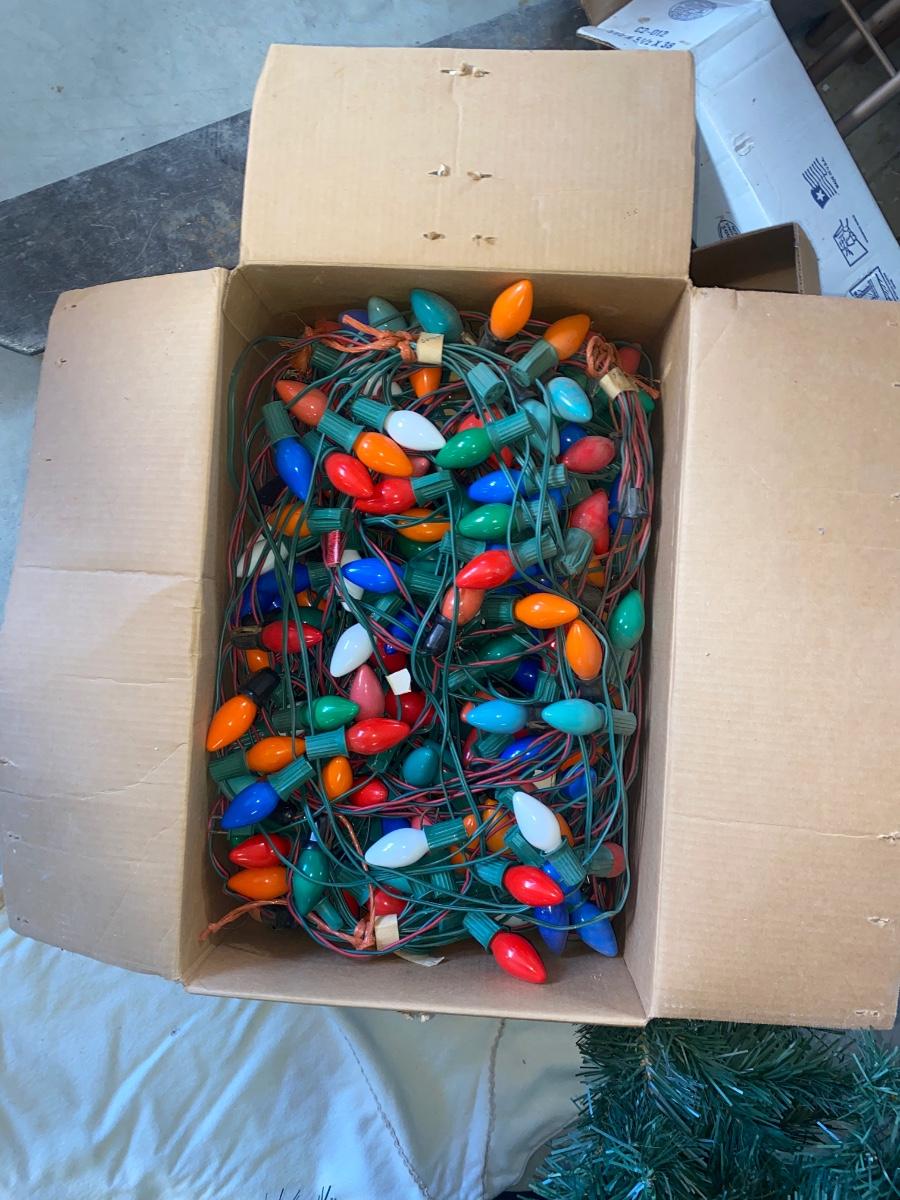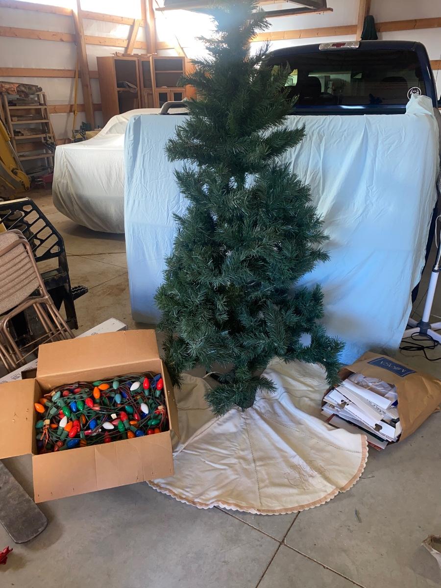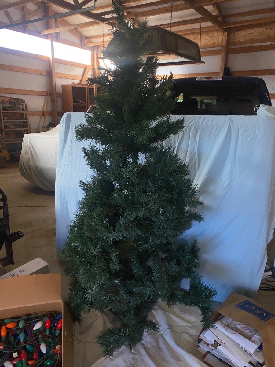 6-1/2’ CHRISTMAS TREE, HUGE BOX OF OLD CHRISTMAS LIGHTS AND A BUNCH OF GIFT BOXES