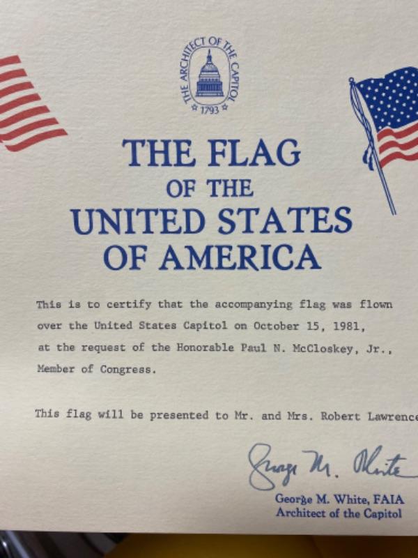 Valley Forge 3’ x 5’ Flag that was flown over the United States Capitol and presented to Paul McCloskey and Present to owner